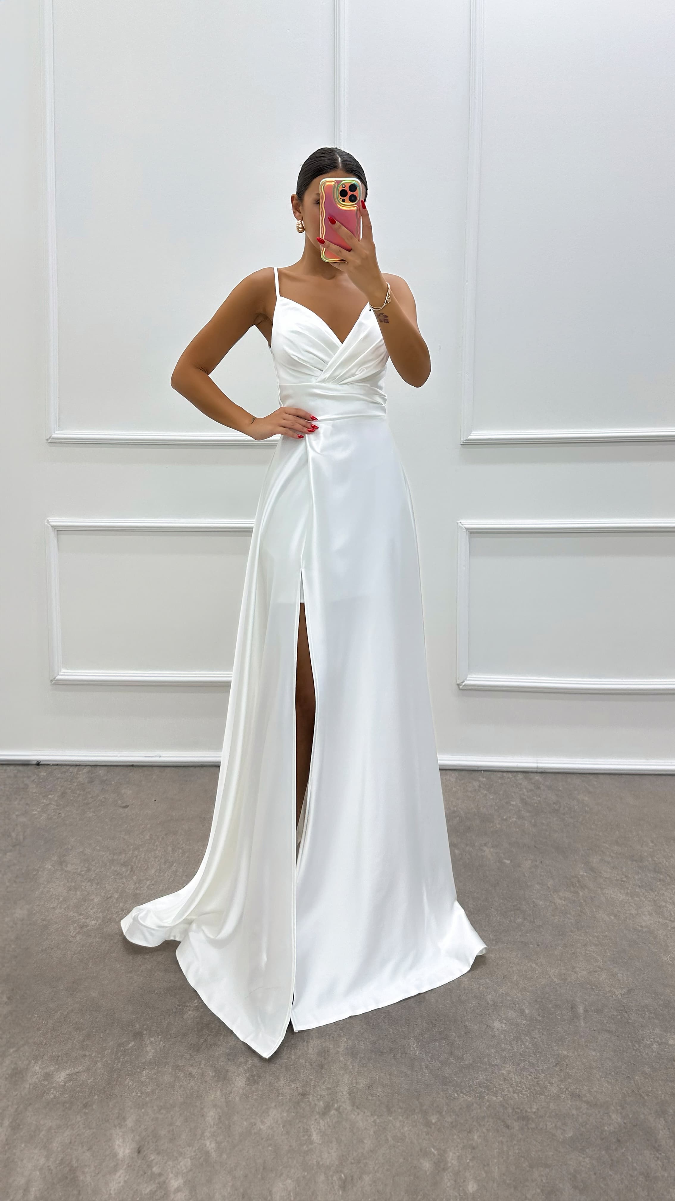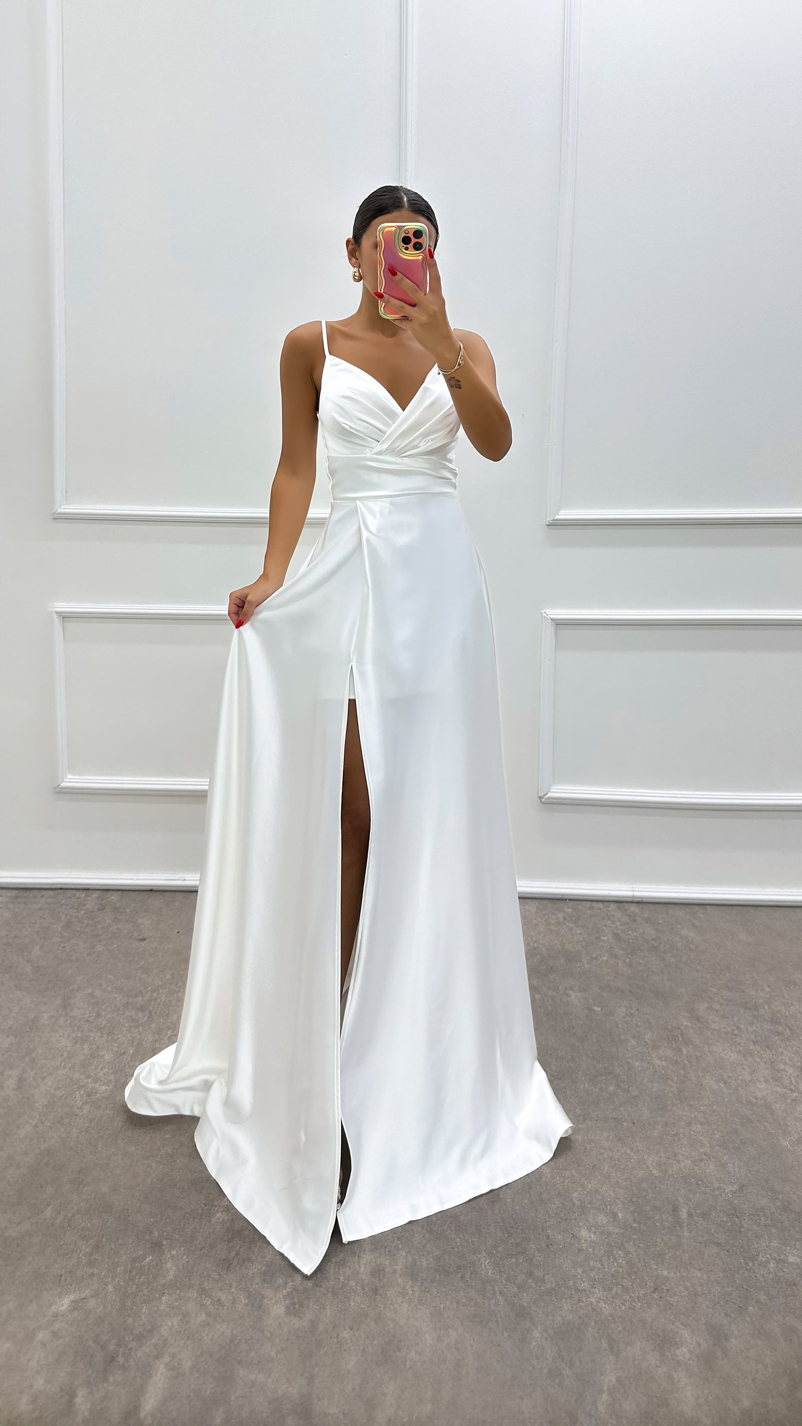 • Beyaz İp Askılı Tasarım Saten Abiye Elbise
