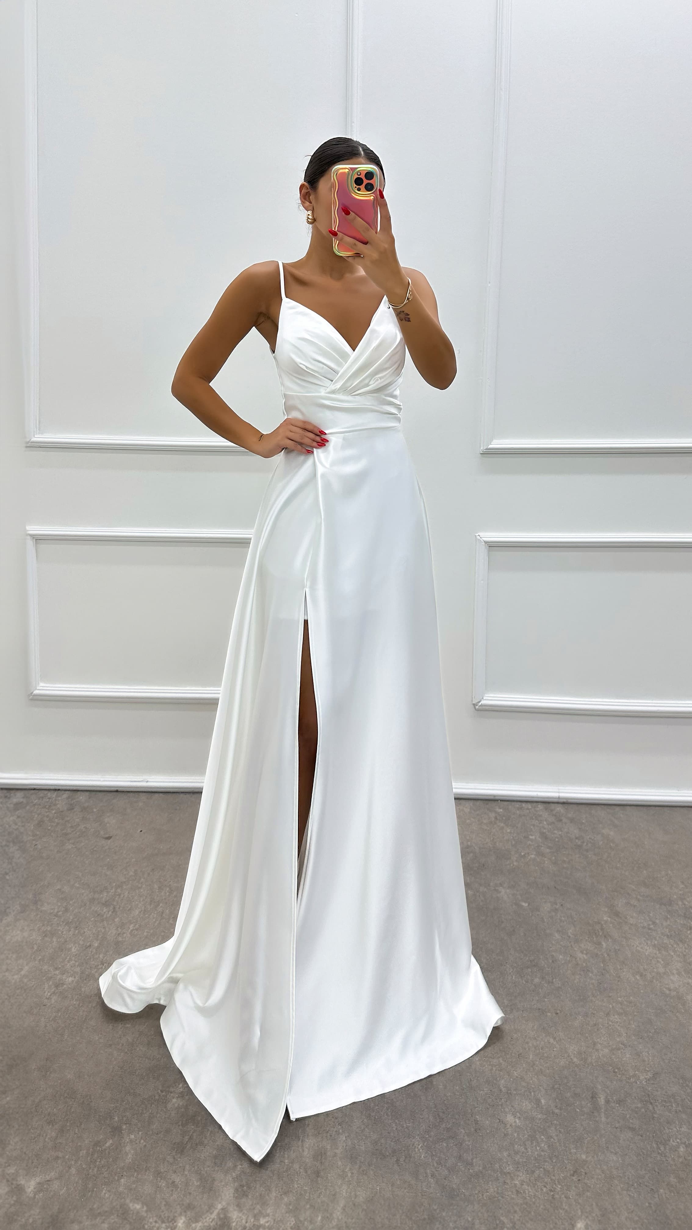 Beyaz İp Askılı Tasarım Saten Abiye Elbise