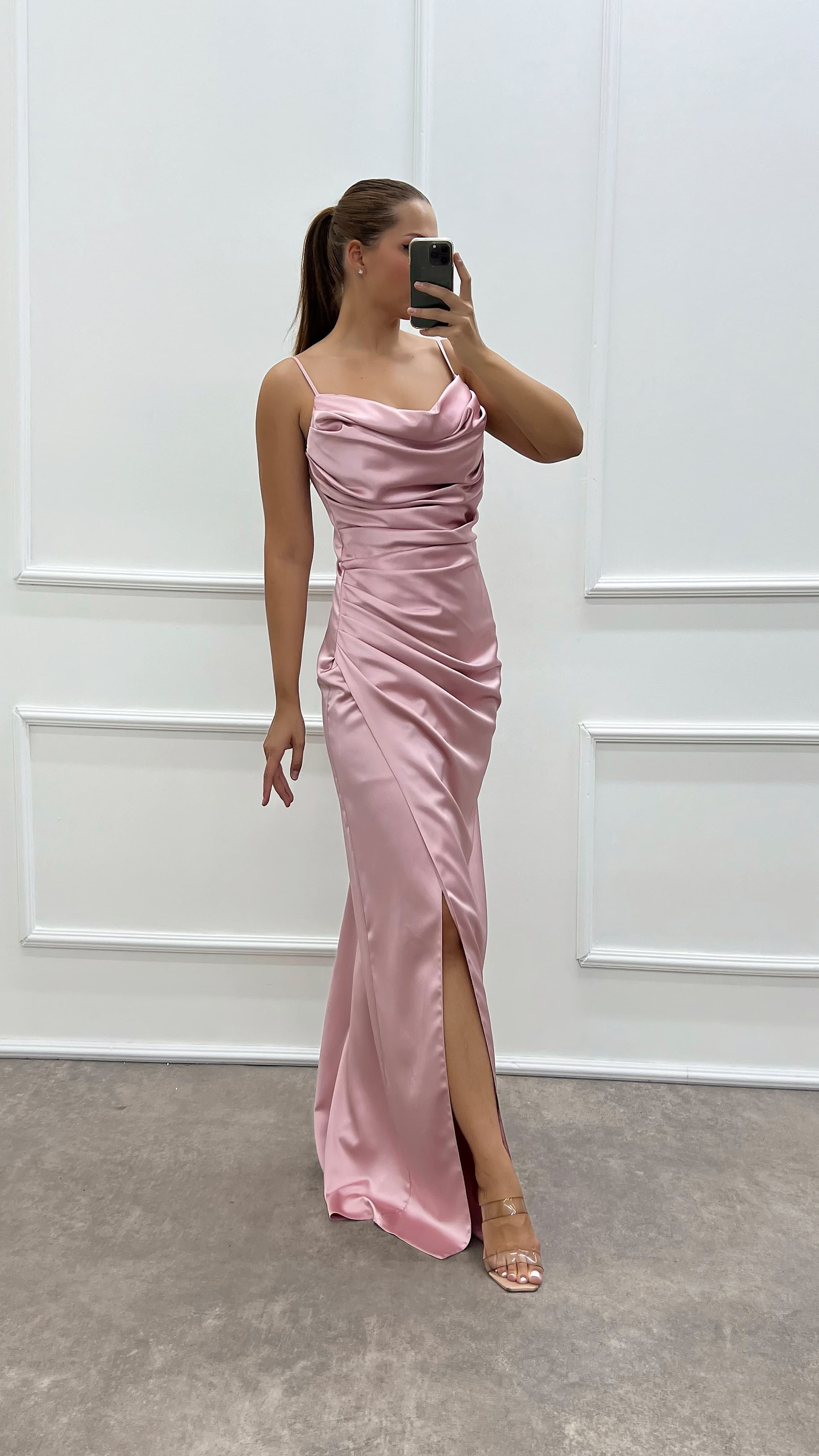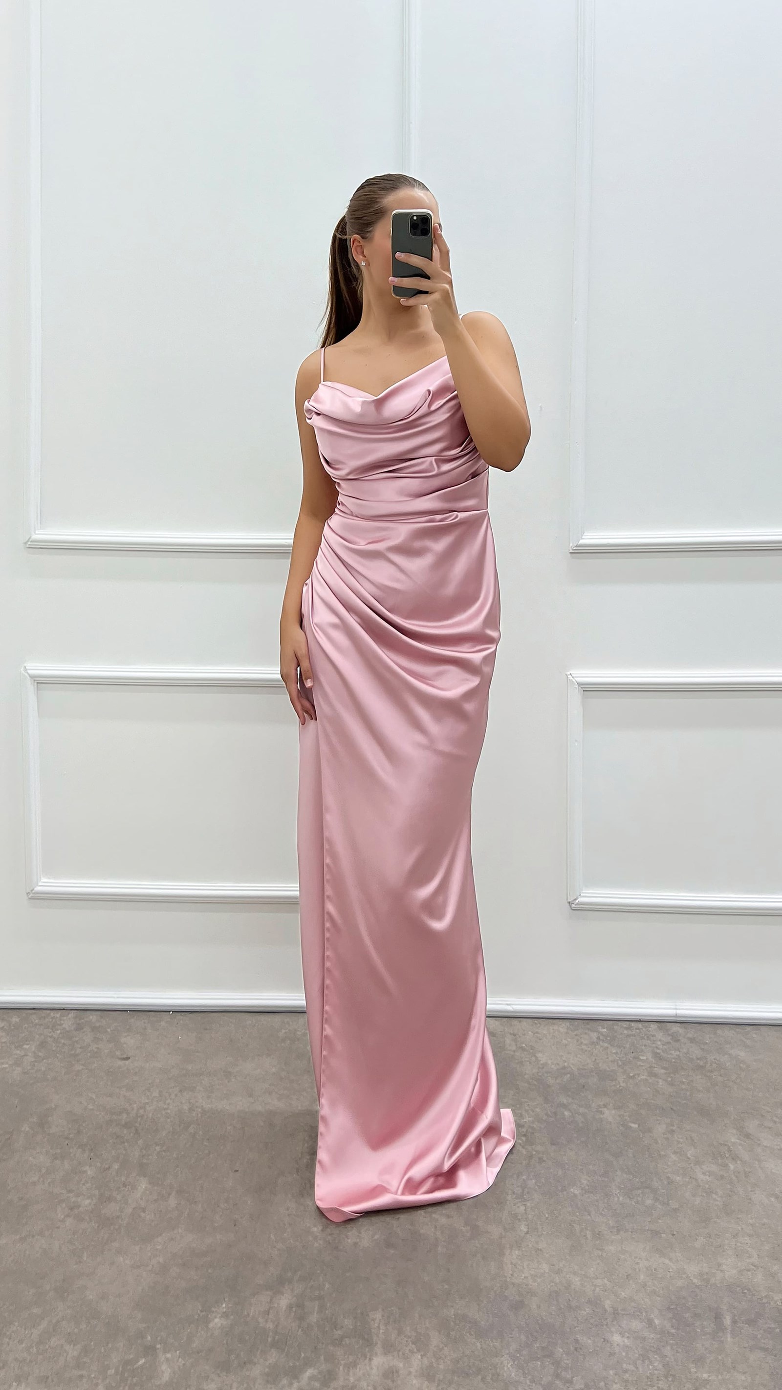 • Pembe İp Askılı Sırt Detay Büyük Beden Abiye Elbise