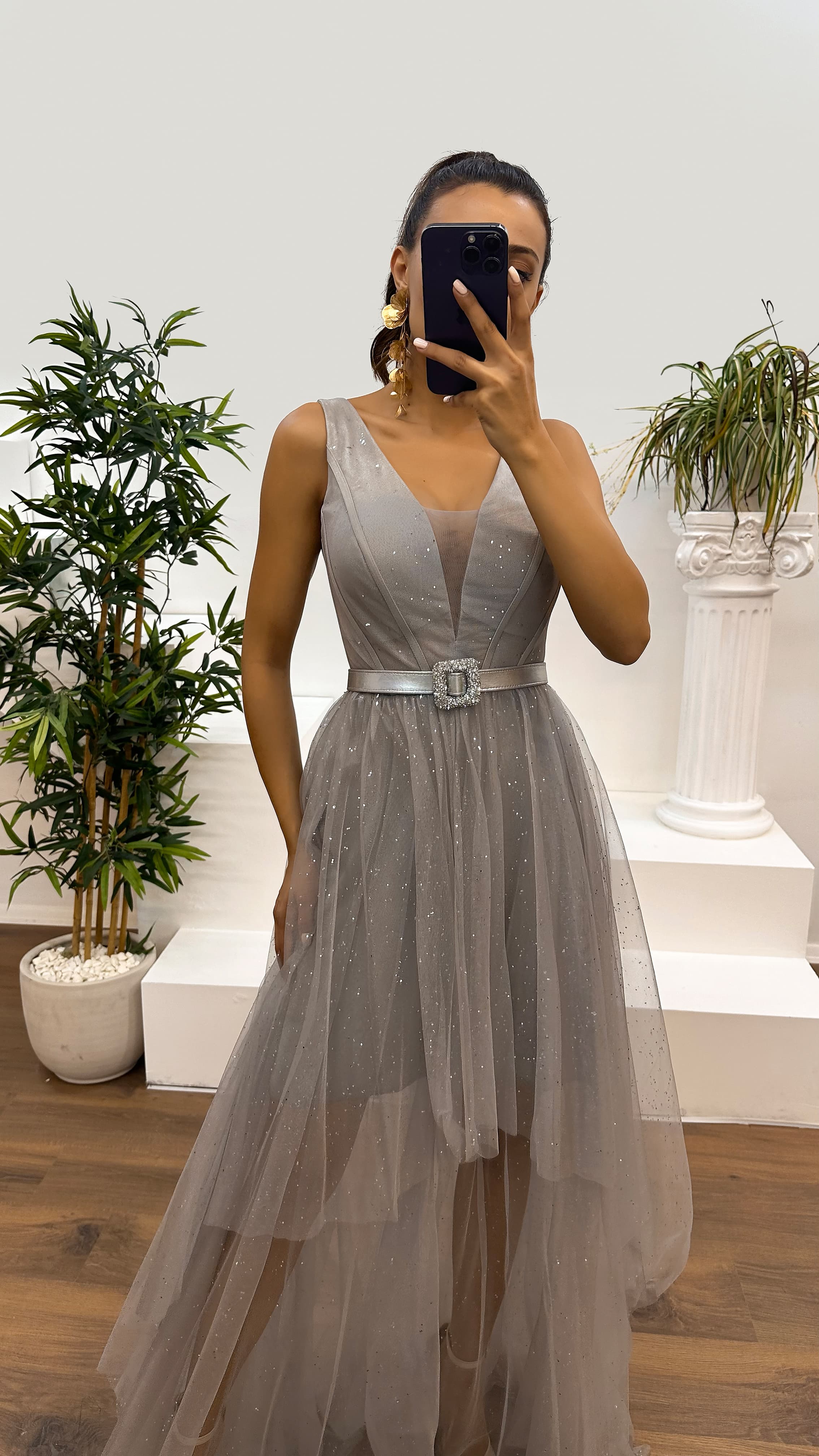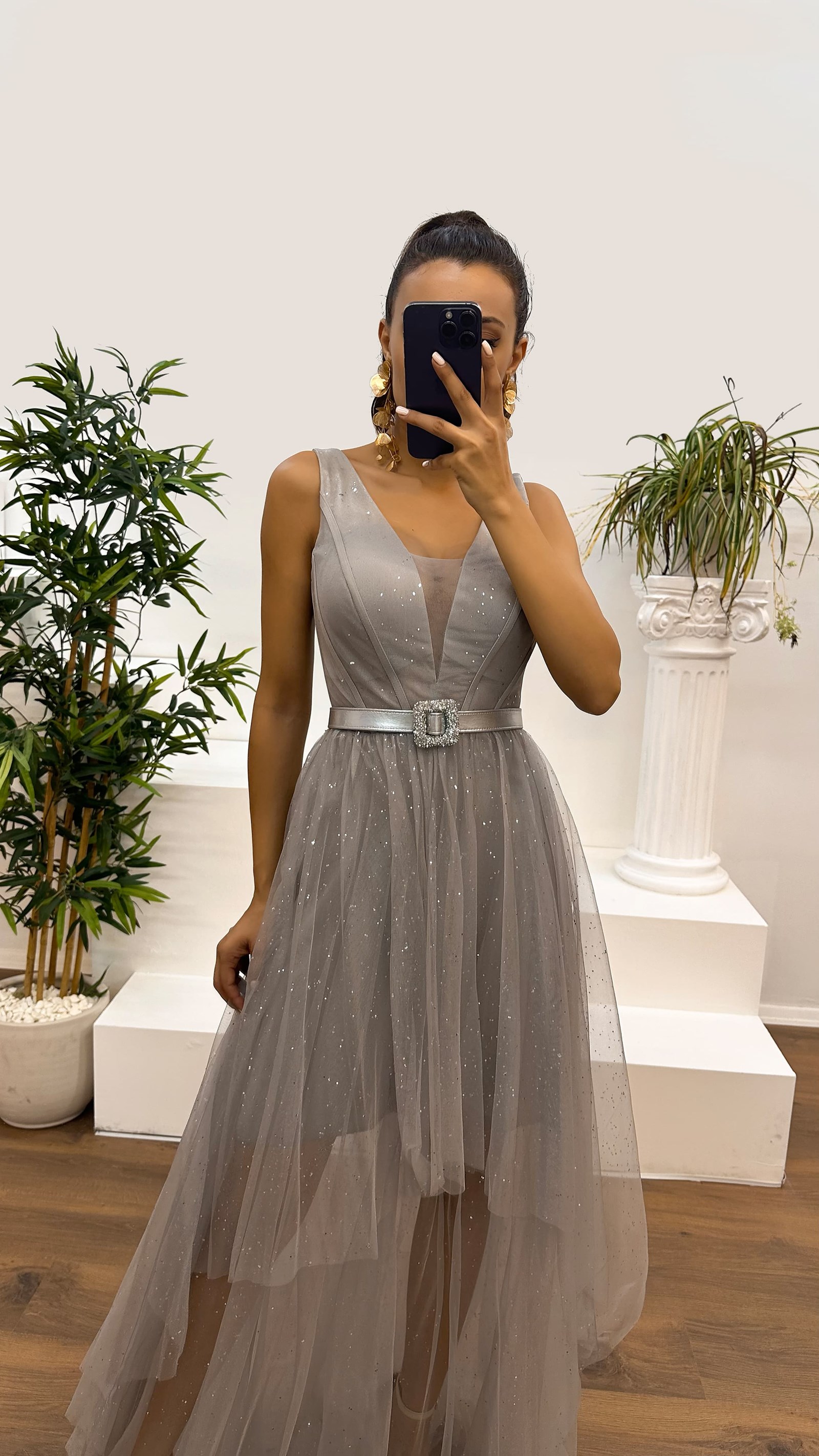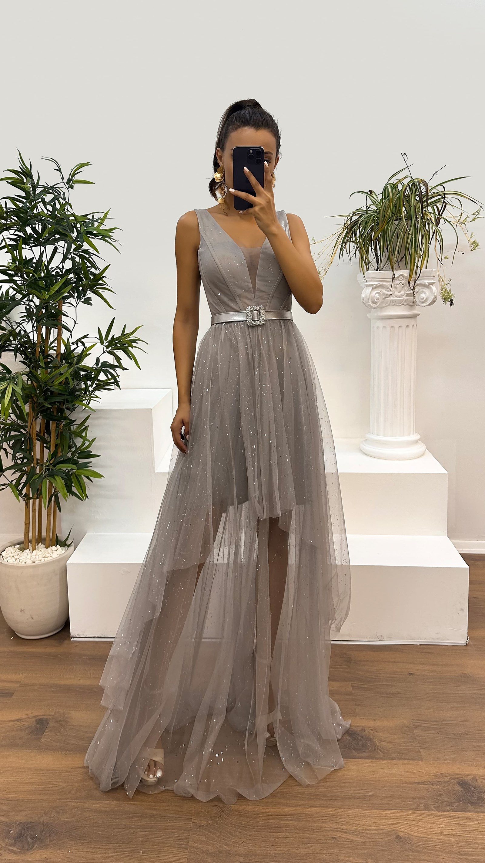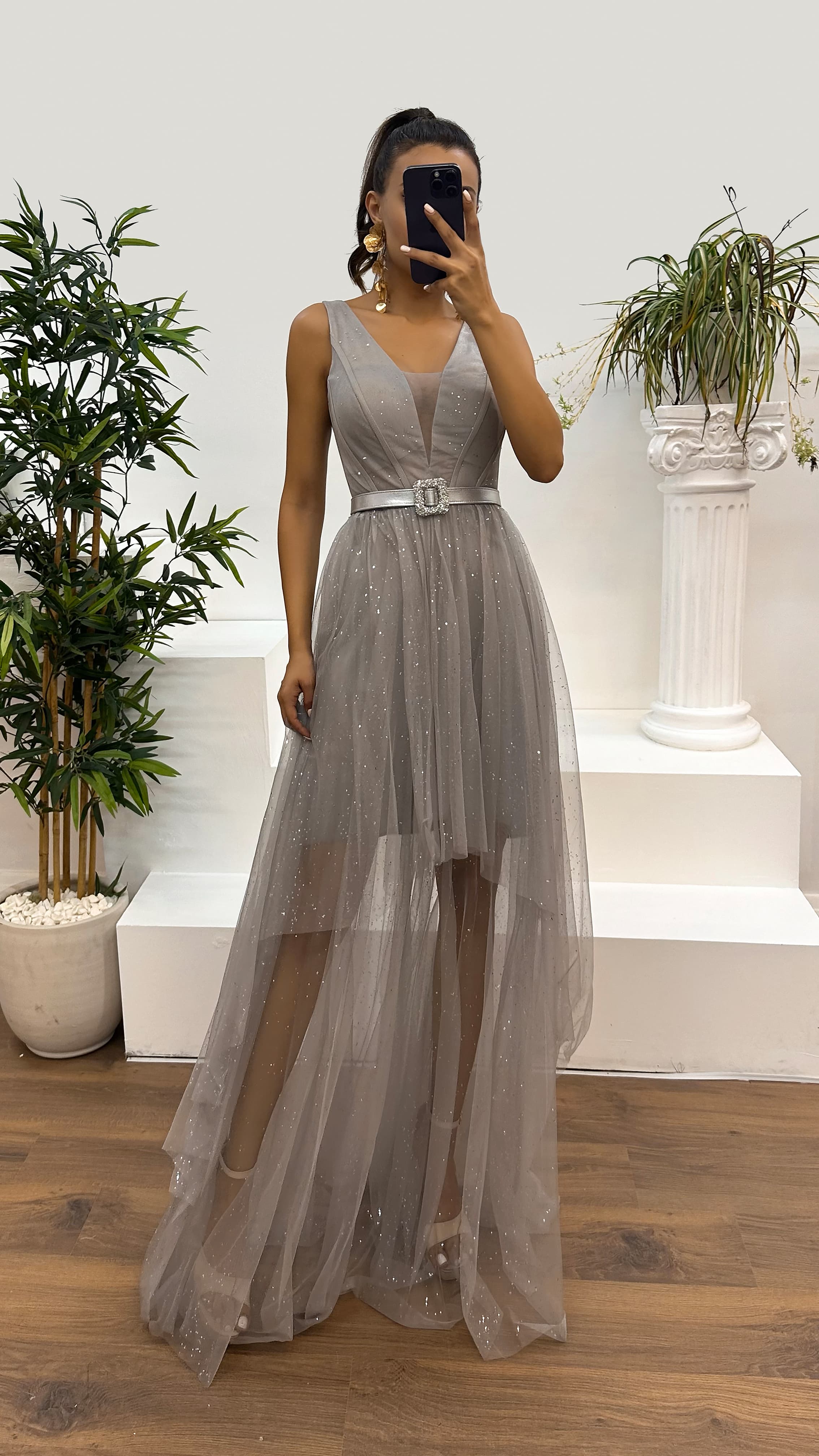 • Gri V Yaka Simli Göğüs Detay Tasarım Elbise