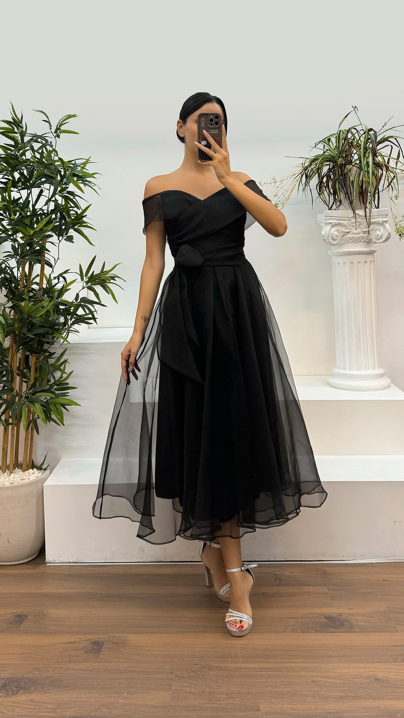 • Saks Kayık Yaka Kısa Abiye Elbise