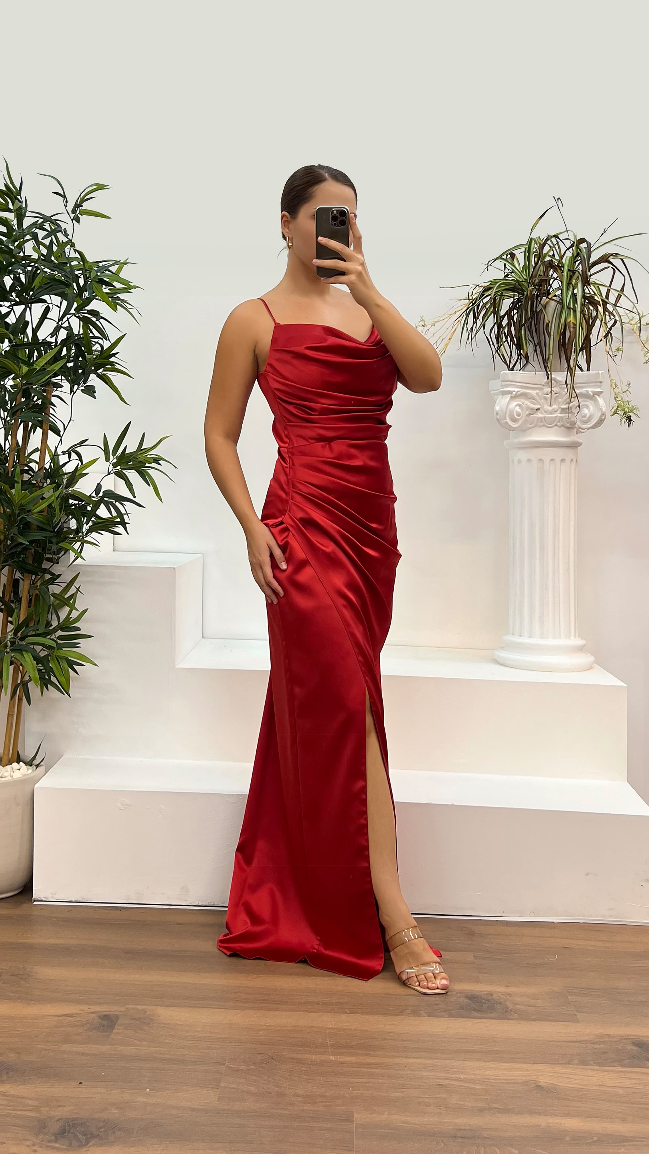 • Kırmızı İp Askılı Drapeli Saten Büyük Beden Abiye Elbise