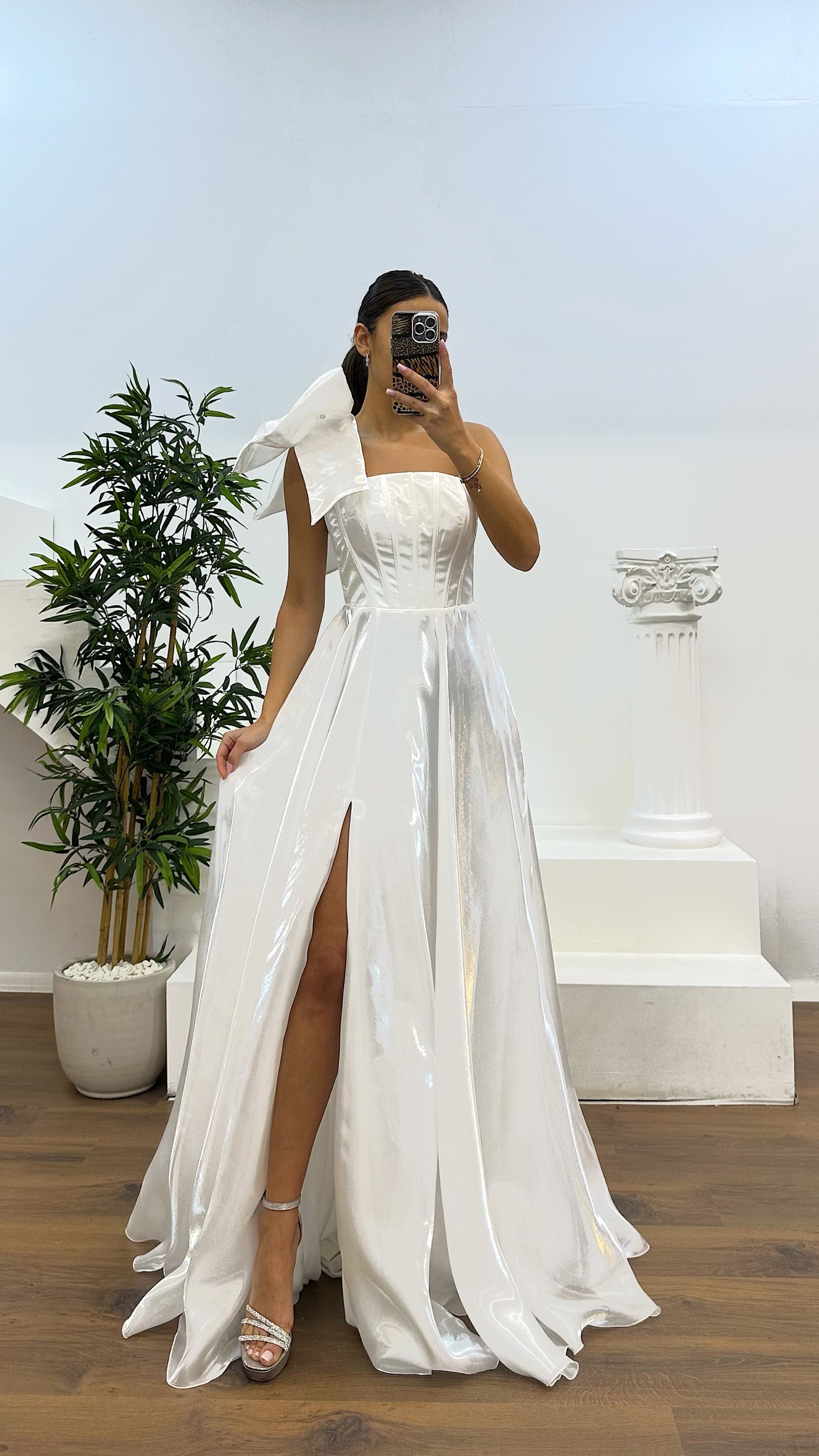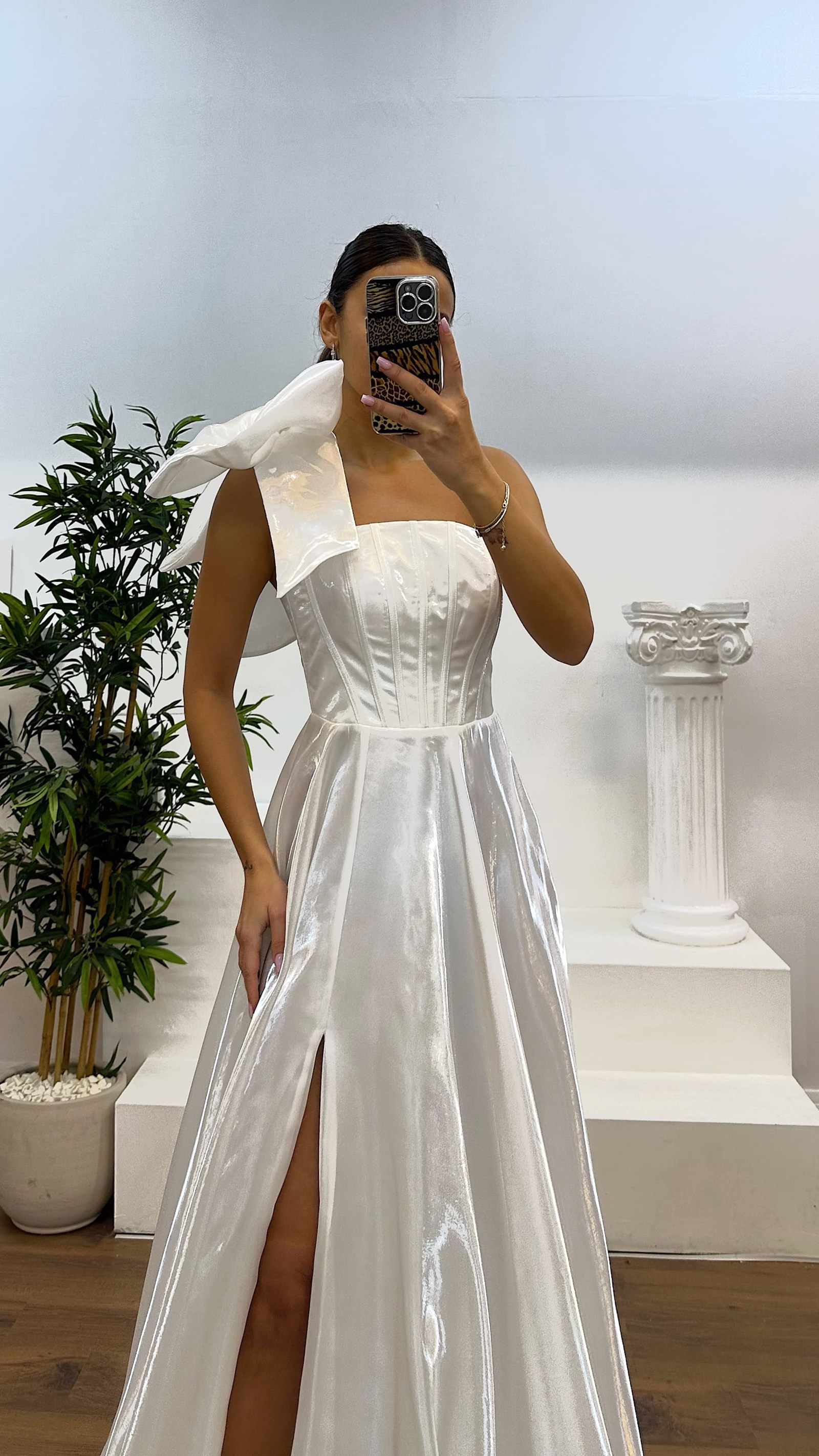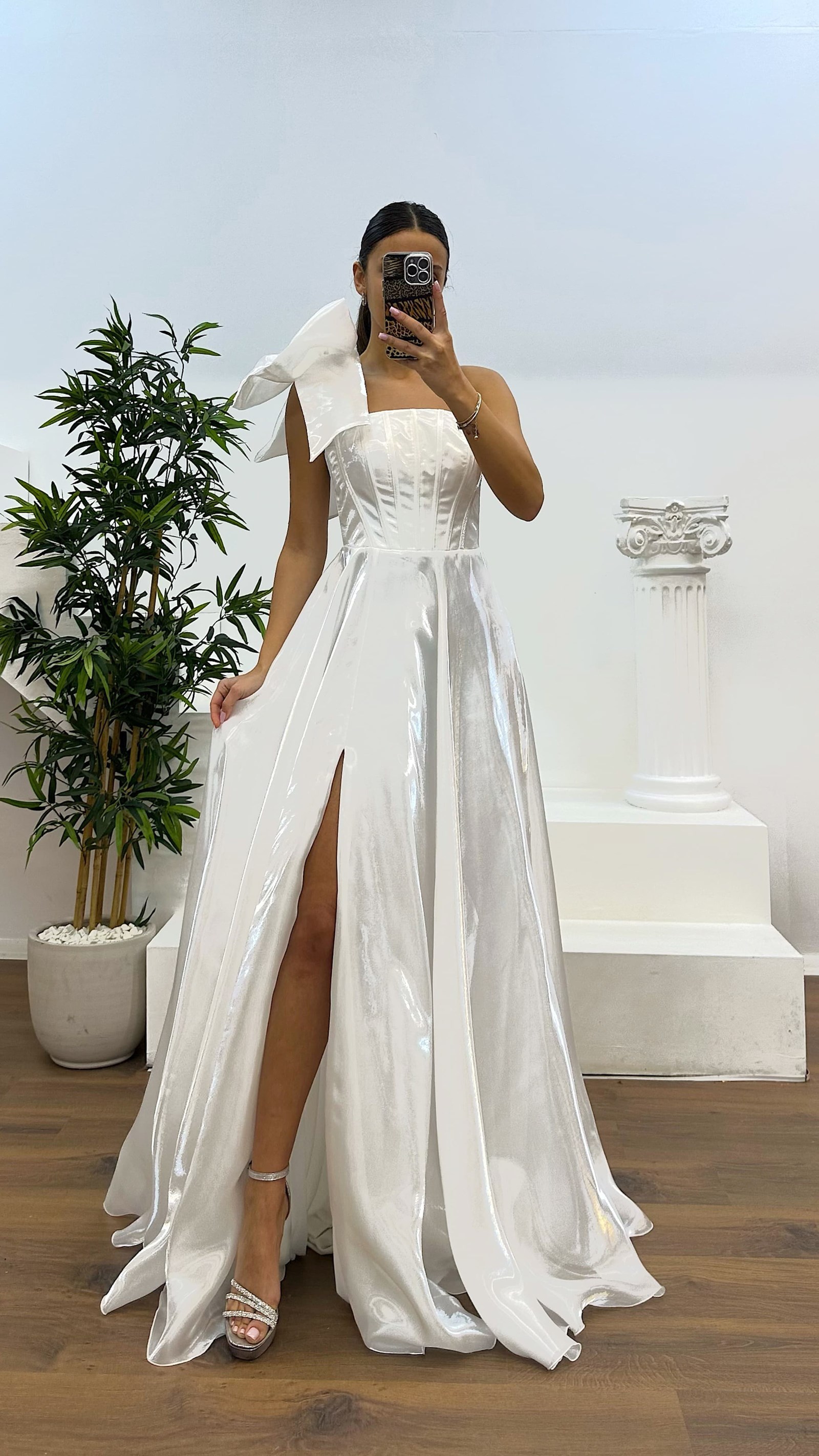 Abendkleid mit Schulterdetails Das Produkt ist in den Größen 36-44 passend, mit eingebauten Brustpolstern, gefüttert, mit einem Kreuzbändchen und einem Reißverschlussverschluss auf der Rückseite, mit einem Schlitz, entworfen als Abendkleid mit Schulterdetails. Die Kleidlänge kann zwischen 165-170 cm variieren. Stoffart: Organza-Satin, 100% Polyester.