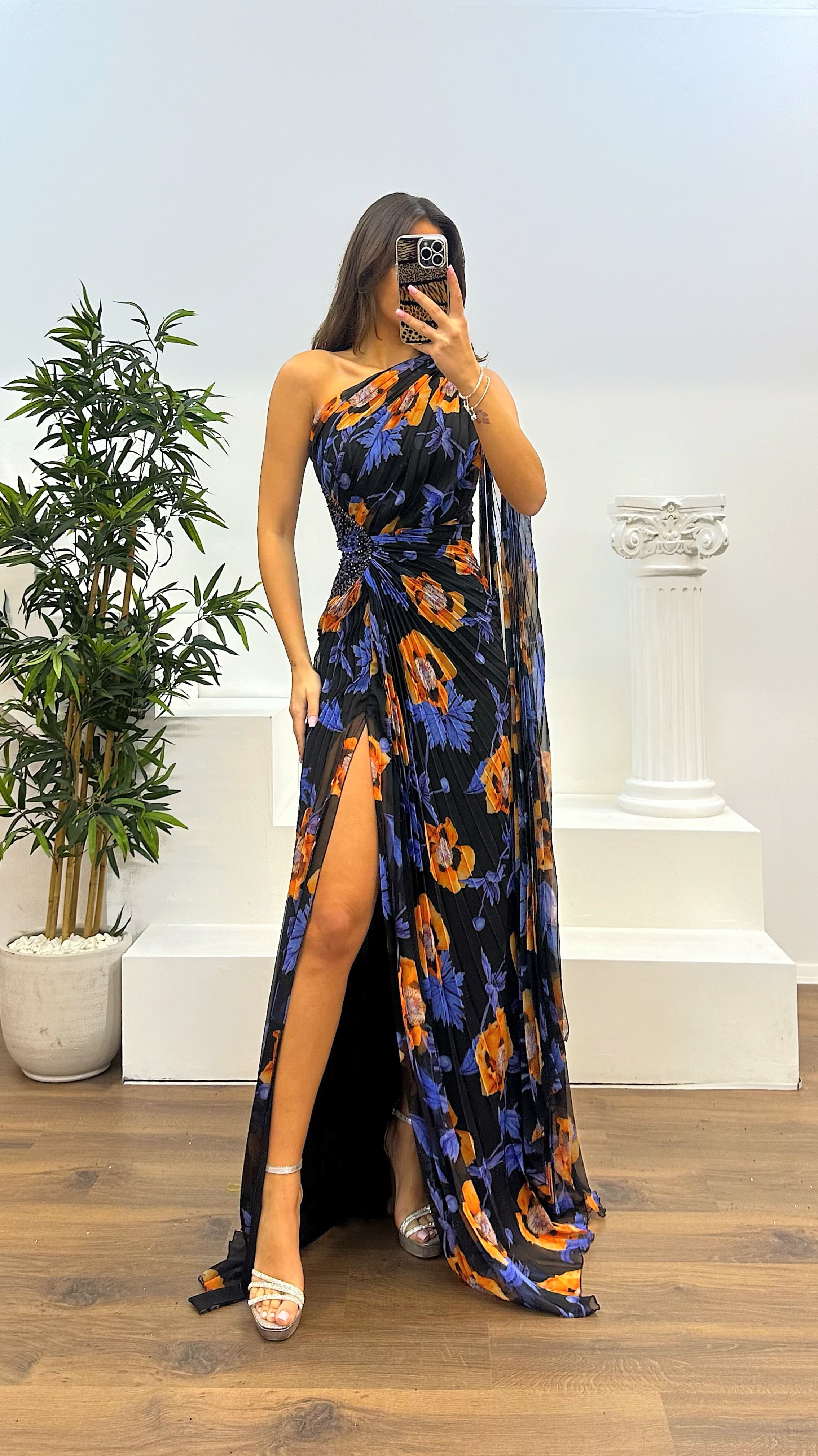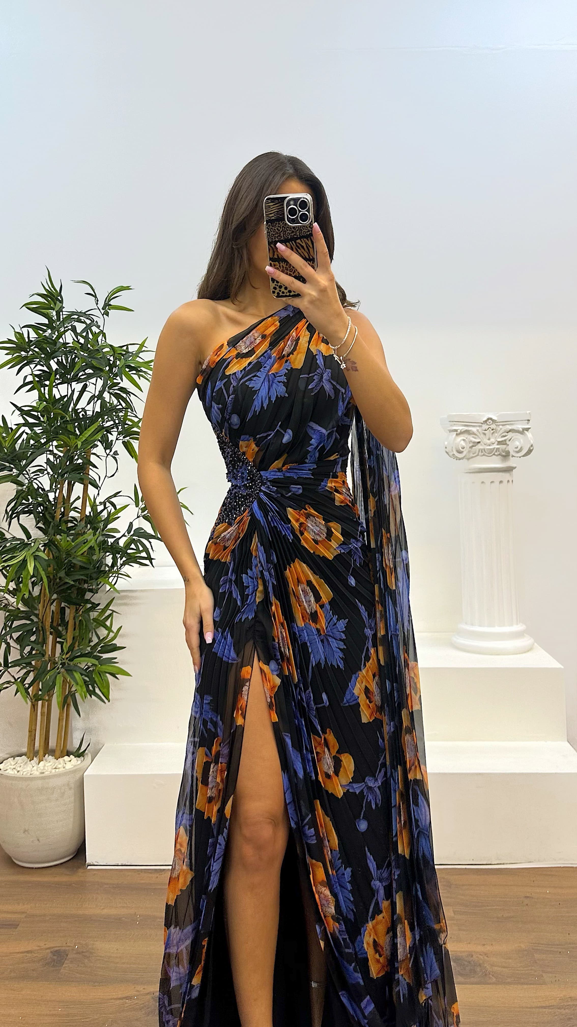 Ein Schulter Falten Abendkleid Das Produkt ist in den Größen 36 bis 44 erhältlich, mit Brustpolstern, gefüttert, mit Reißverschluss auf der Rückseite, mit Schlitz und einer Verzierungen an der Taille. Die Länge des Produkts kann zwischen 165-170 cm variieren. Stoffart: Chiffon 66%, Viskose 34%, Polyester.