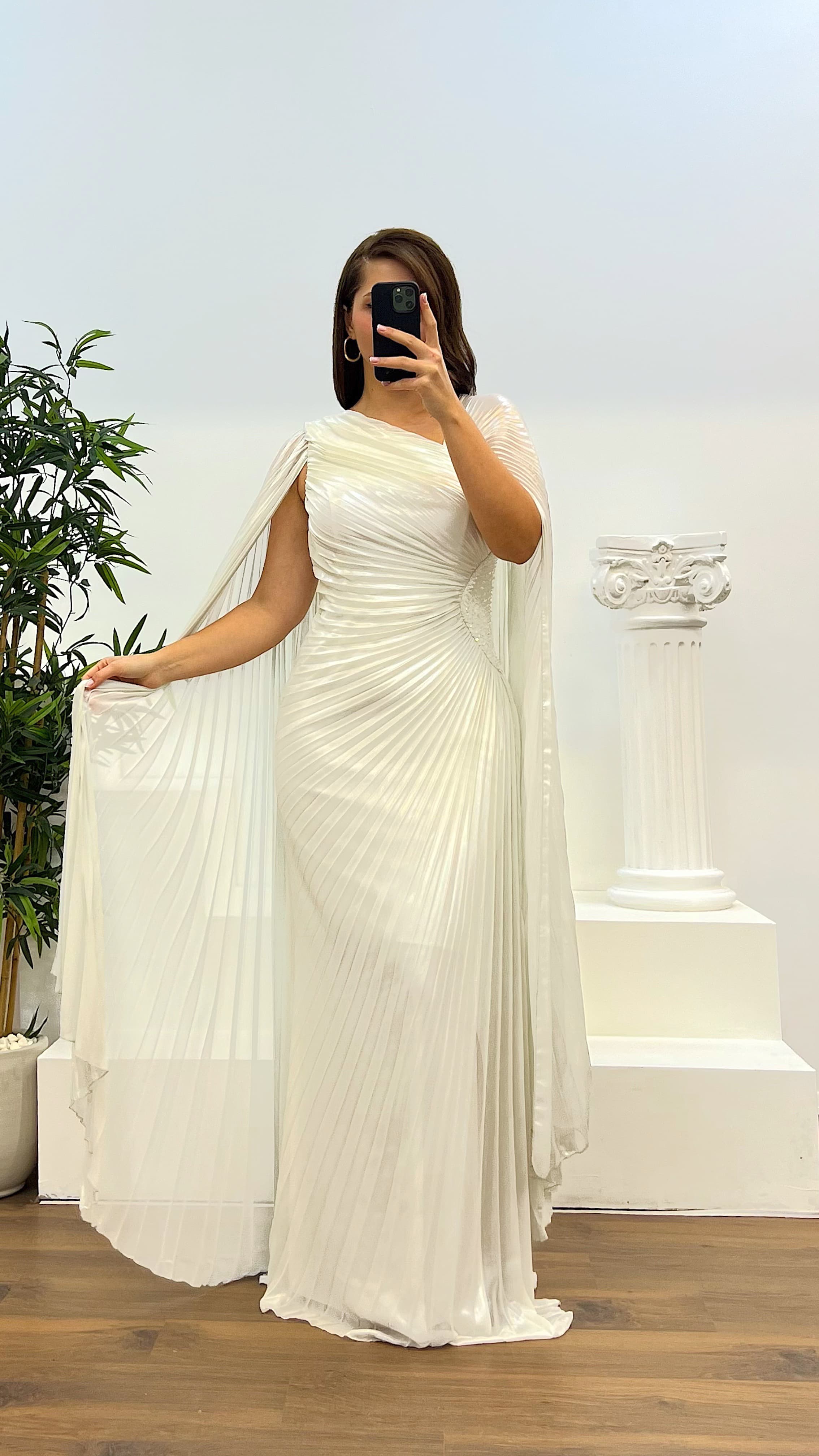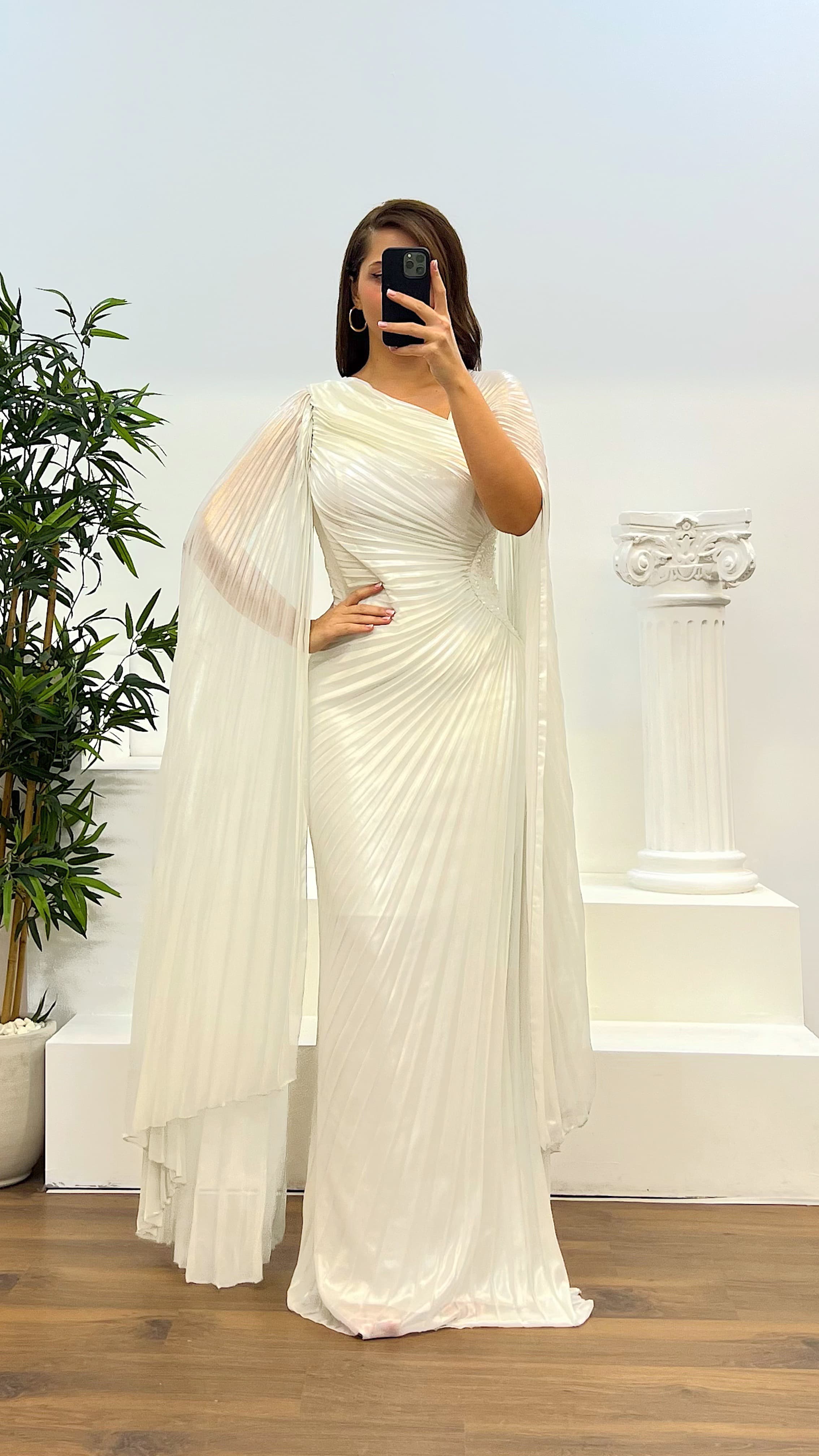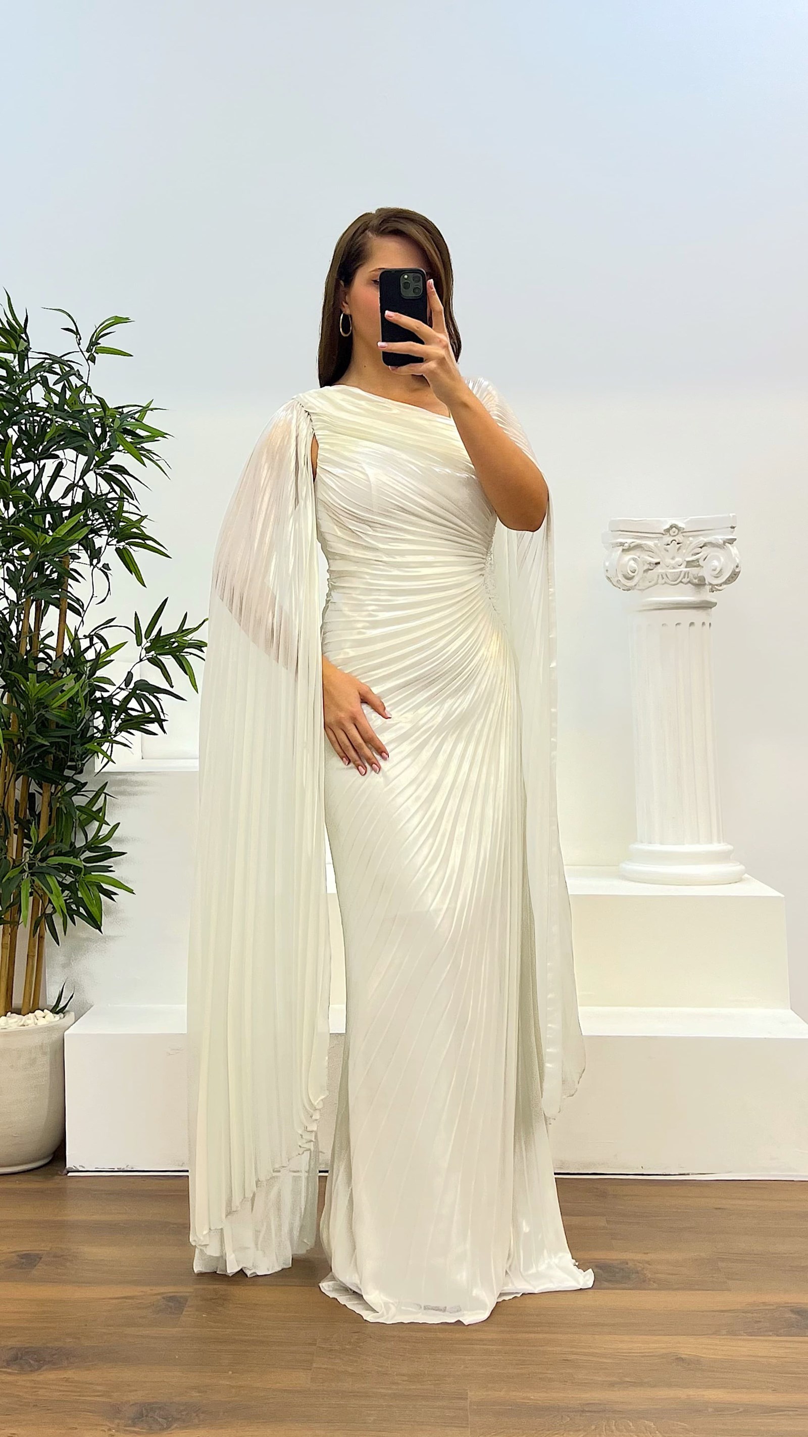 Abendkleid mit Falten und Taillendetails Das Produkt ist in den Größen 46-50 erhältlich, mit Futter, Brustpolster, Reißverschluss und Taillendetails entworfen. Die Länge des Produkts kann zwischen 165 und 170 cm variieren. Stoffart: Chiffon 3% Lycra, 97% Polyester.