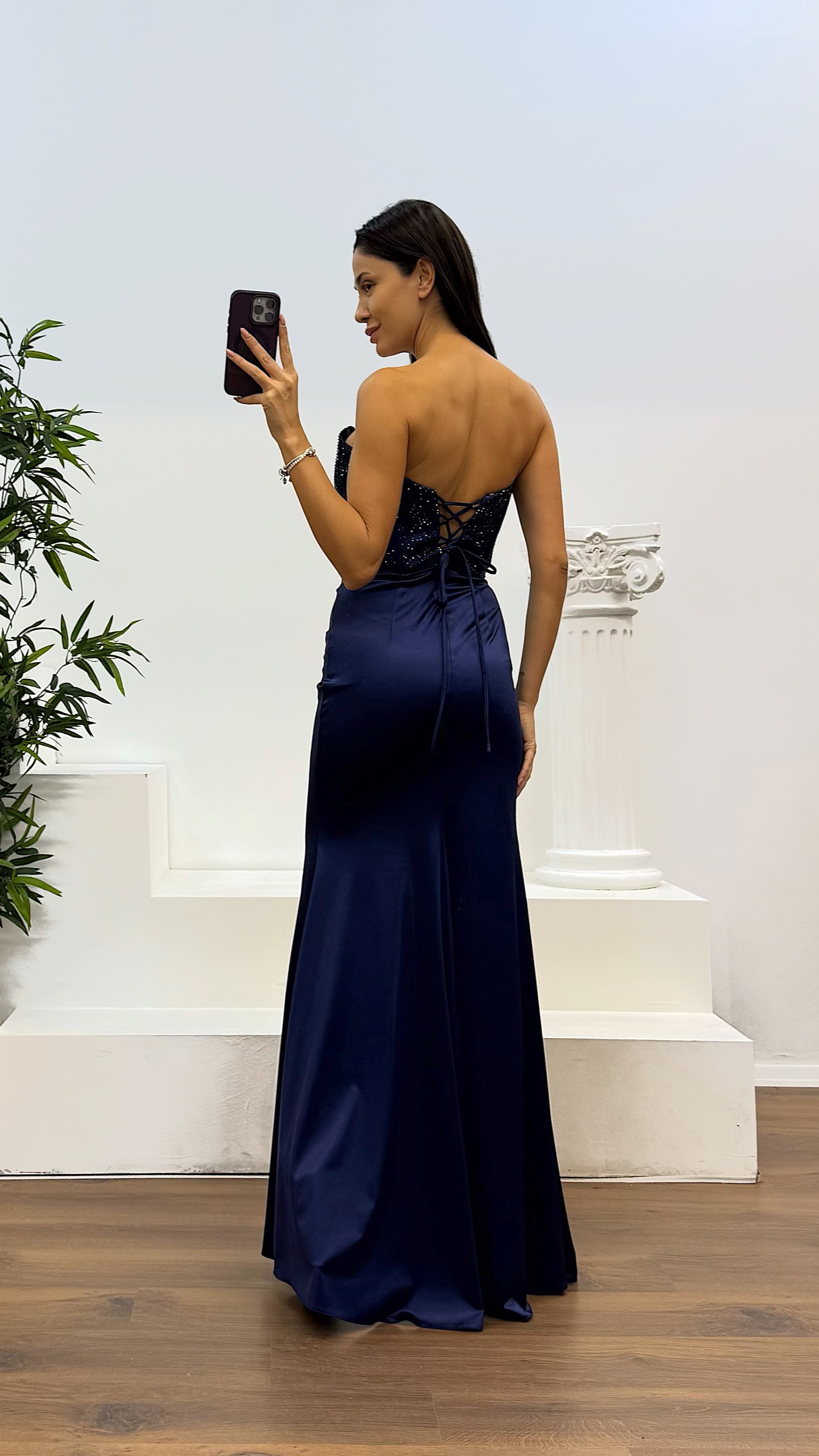 Strapless Abendkleid mit Stickdetails Das Produkt ist in den Größen 36 bis 42 passend, mit Brustpolstern, gefüttert, mit Schlitz, Kreuzbändern im Rücken und Reißverschlussverschluss, entworfen als Abendkleid mit Stickdetails. Die Länge des Produkts beträgt 160 cm. Stoffart: Satin Polyester-Viskose.