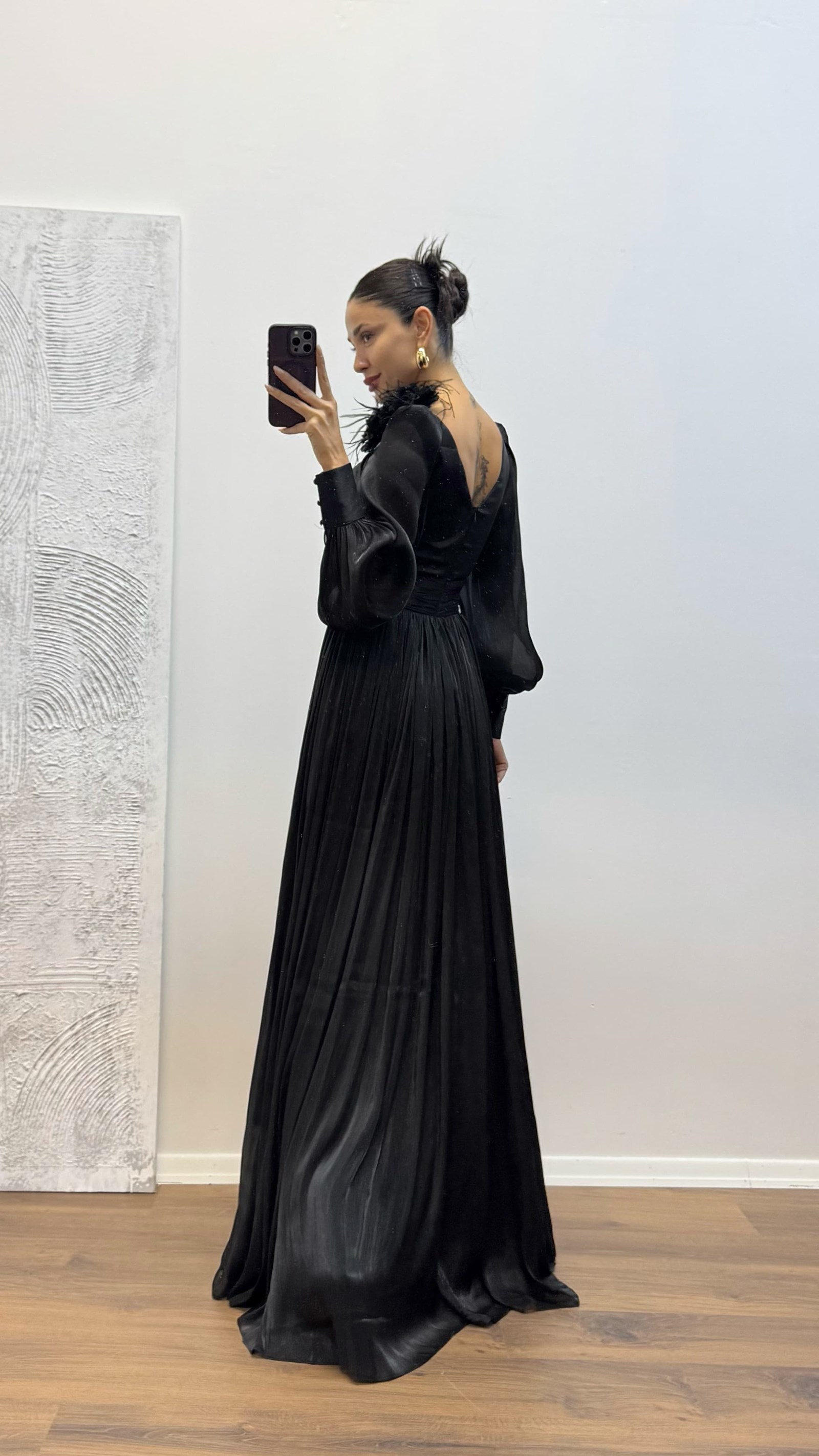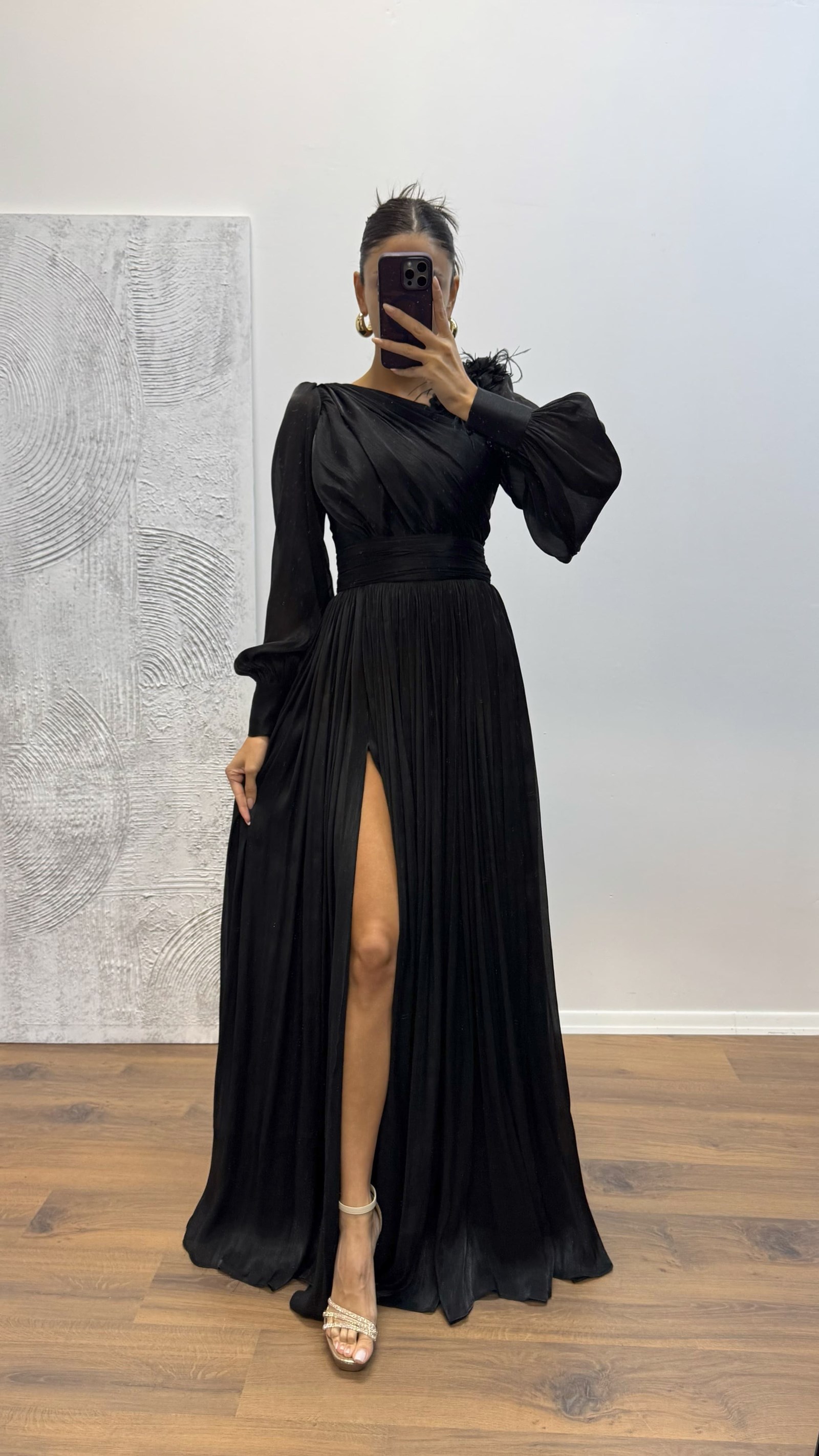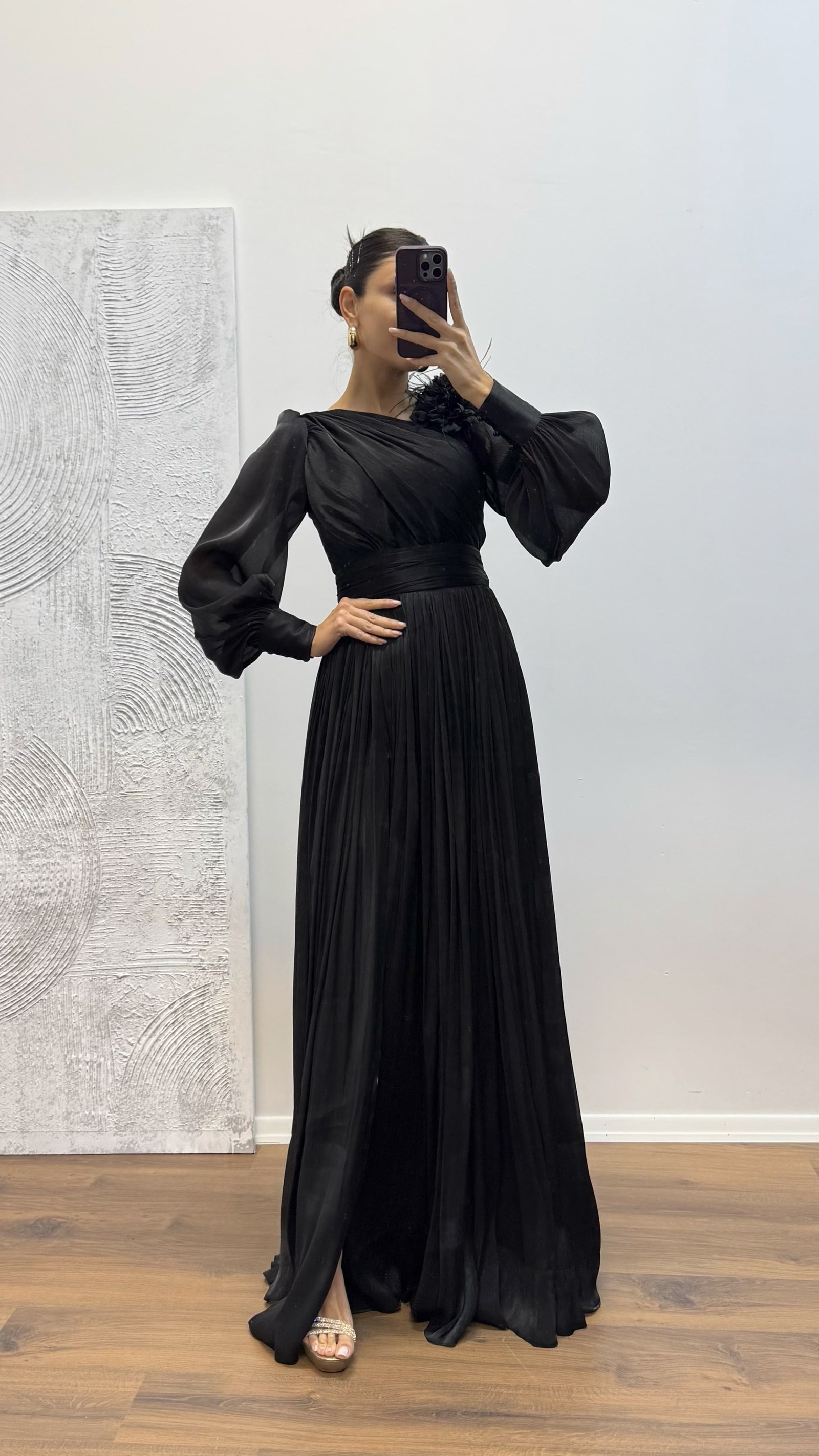 • Siyah Omuz Çiçek Detay Şifon Abiye Elbise