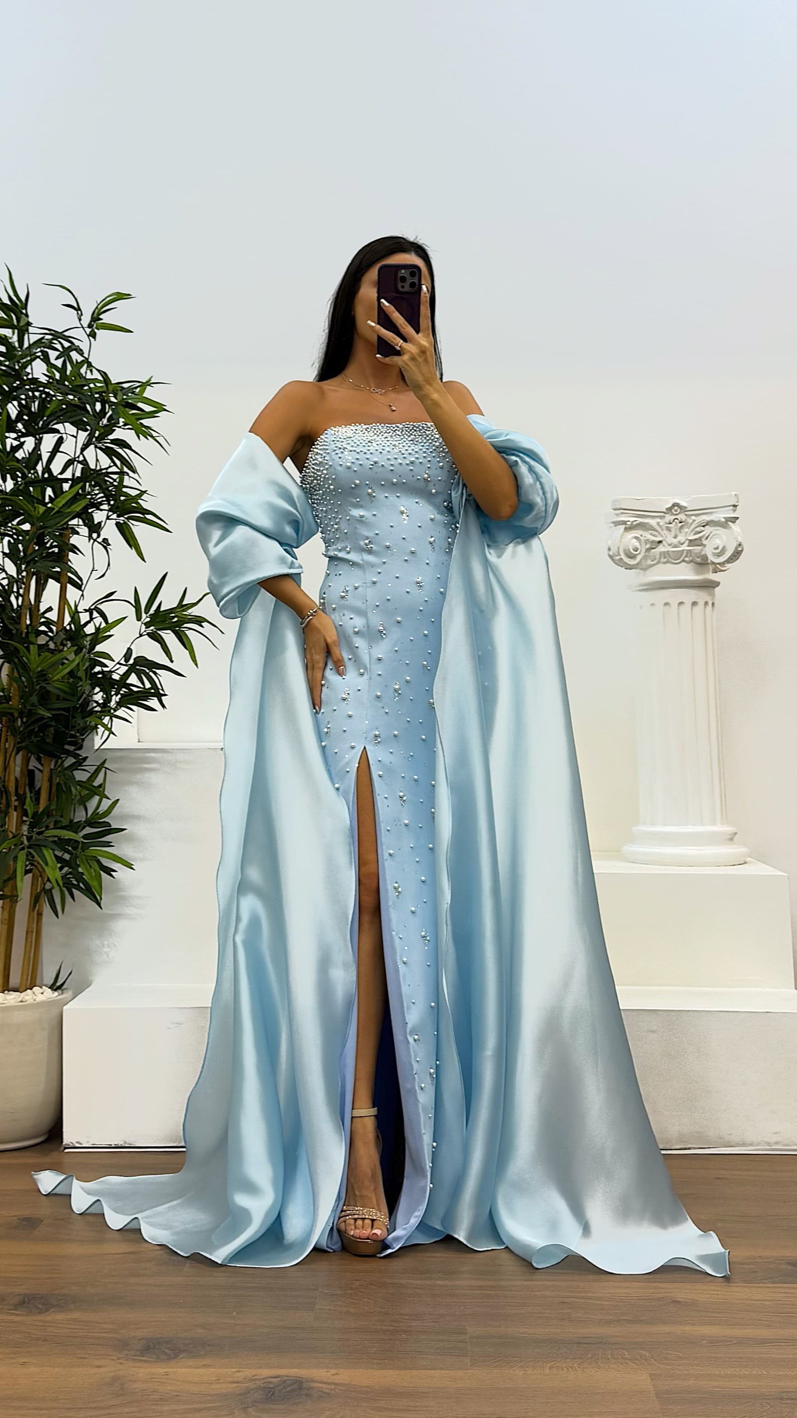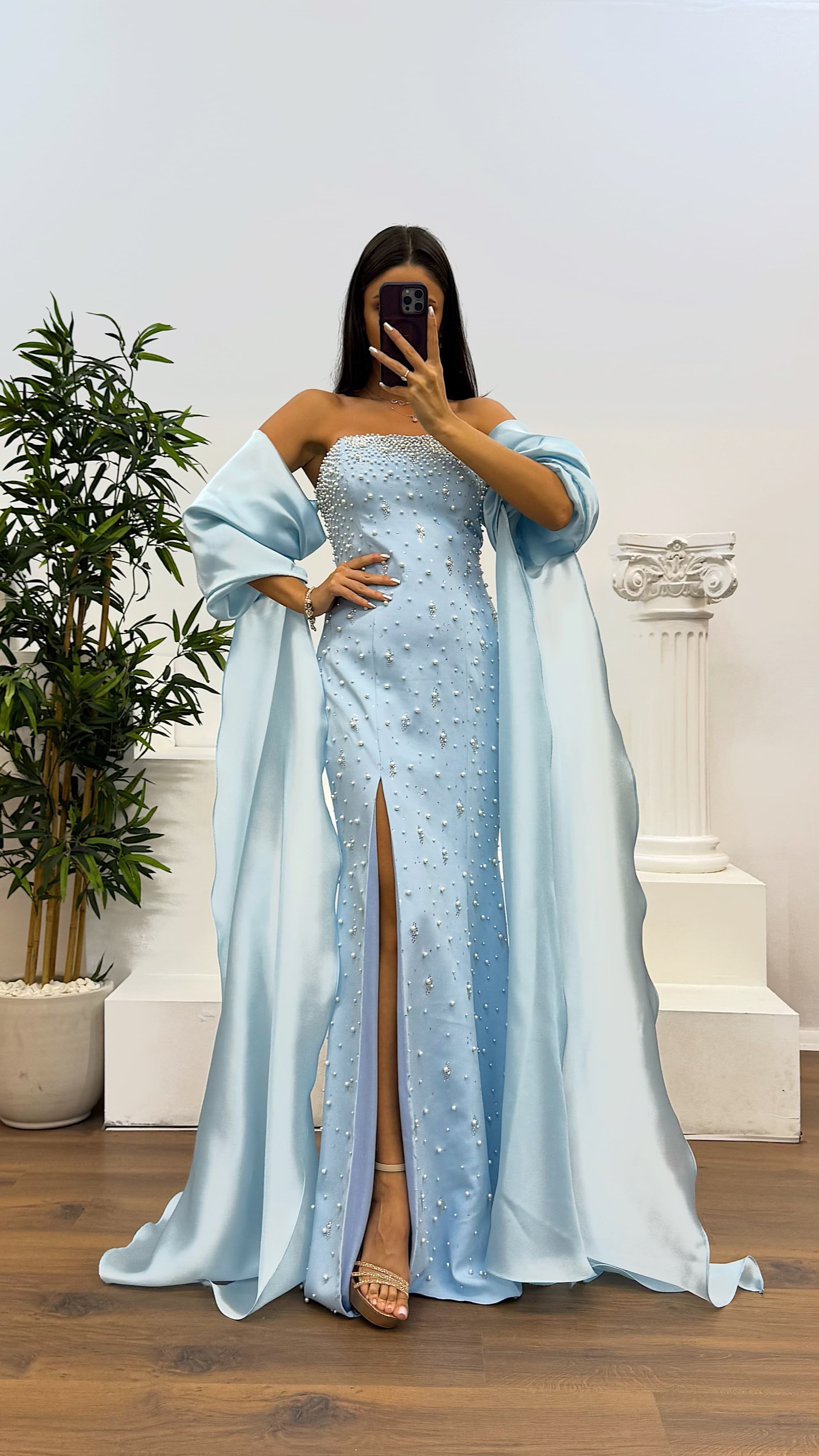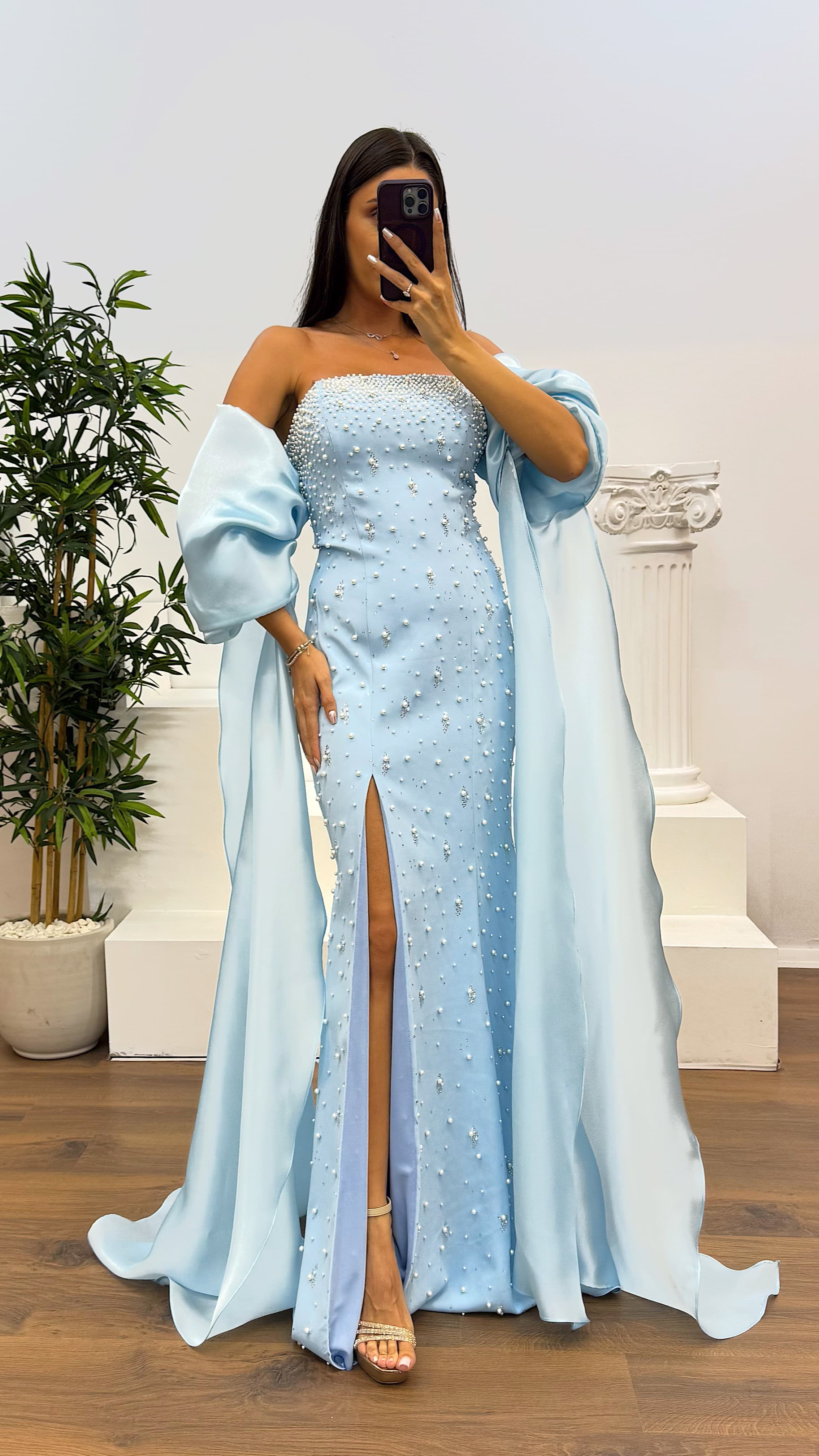 Abendkleid mit Ballonärmeln und Perlendetails Das Kleid passt für Größen 36 bis 42, hat gepolsterte Cups, ist gefüttert, mit überkreuzten Schnürungen und Reißverschluss am Rücken, Ballonärmel und Perlenverzierung. Länge des Kleides: Zwischen 170-175 cm. Stoffart: Atlas 100 % Polyester – Organza-Satin.