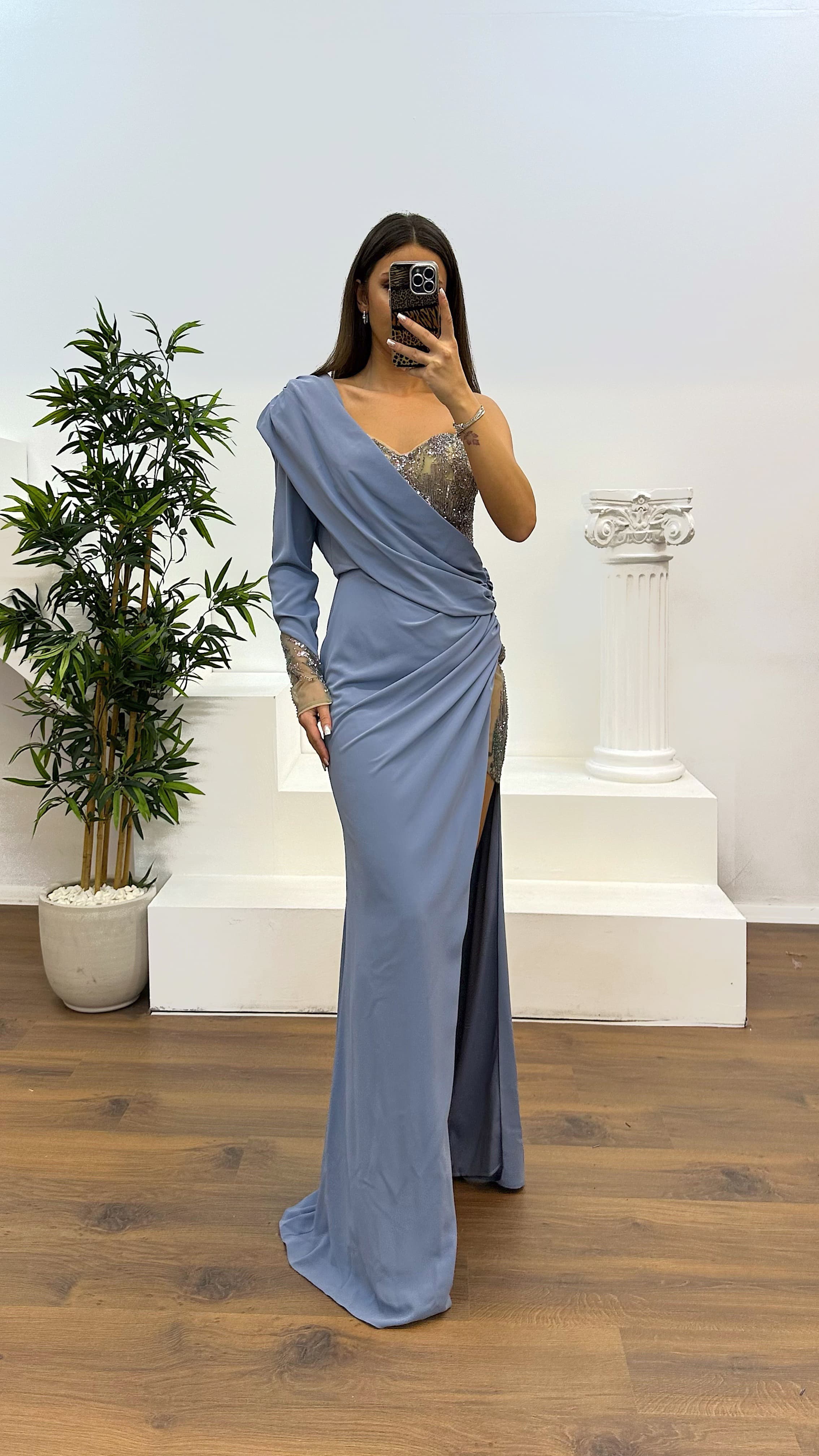 Ein Schulter Abendkleid mit Stickdetails Das Produkt ist in den Größen 36 bis 40 erhältlich, mit Brustpolster, gefüttert, Reißverschluss auf der Rückseite, Schlitz, und wurde mit Stickdetails als Abendkleid entworfen. Länge des Produkts: Kann zwischen 165-170 cm variieren. Stoffart: Atlas 100% Polyester.