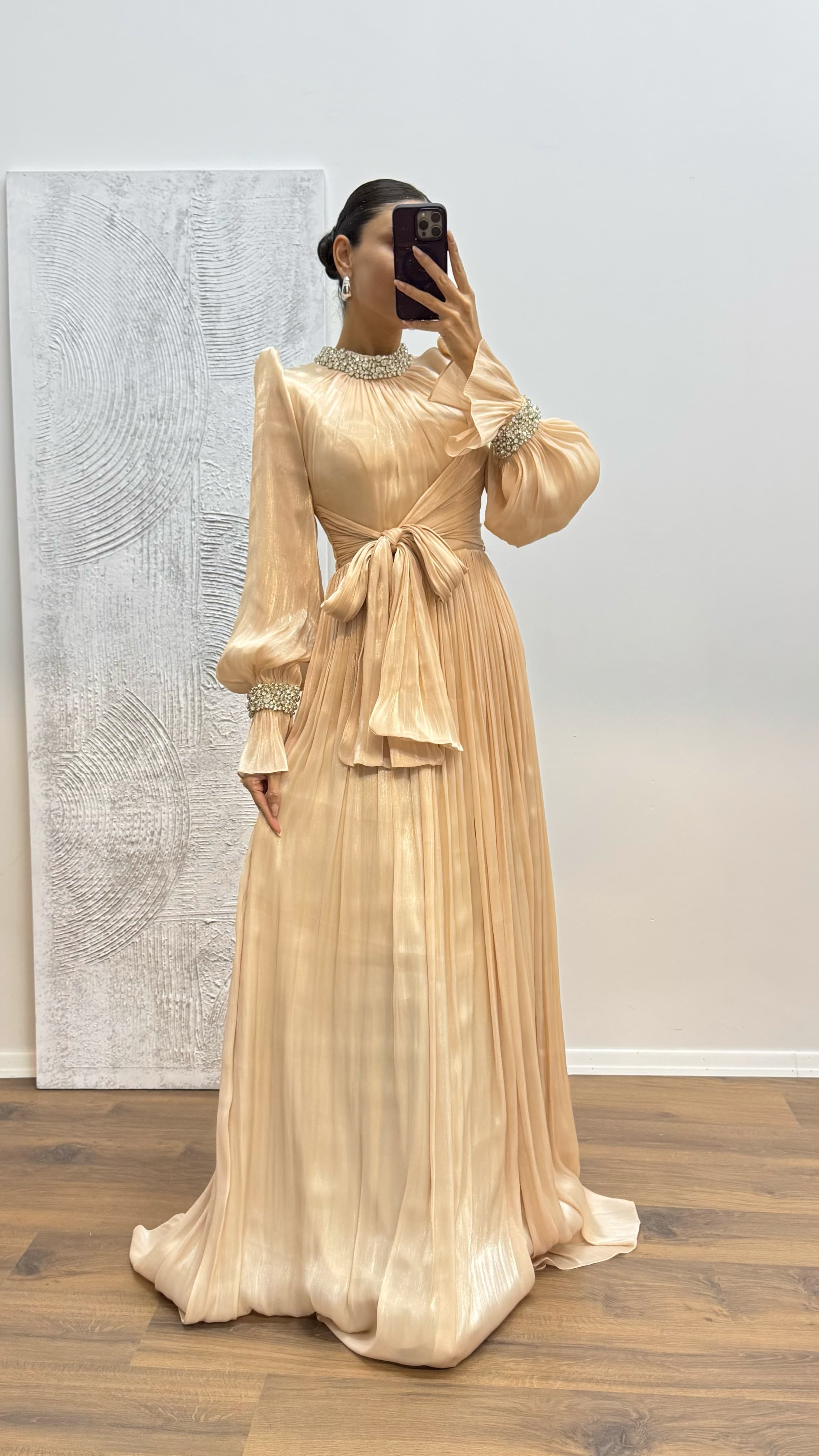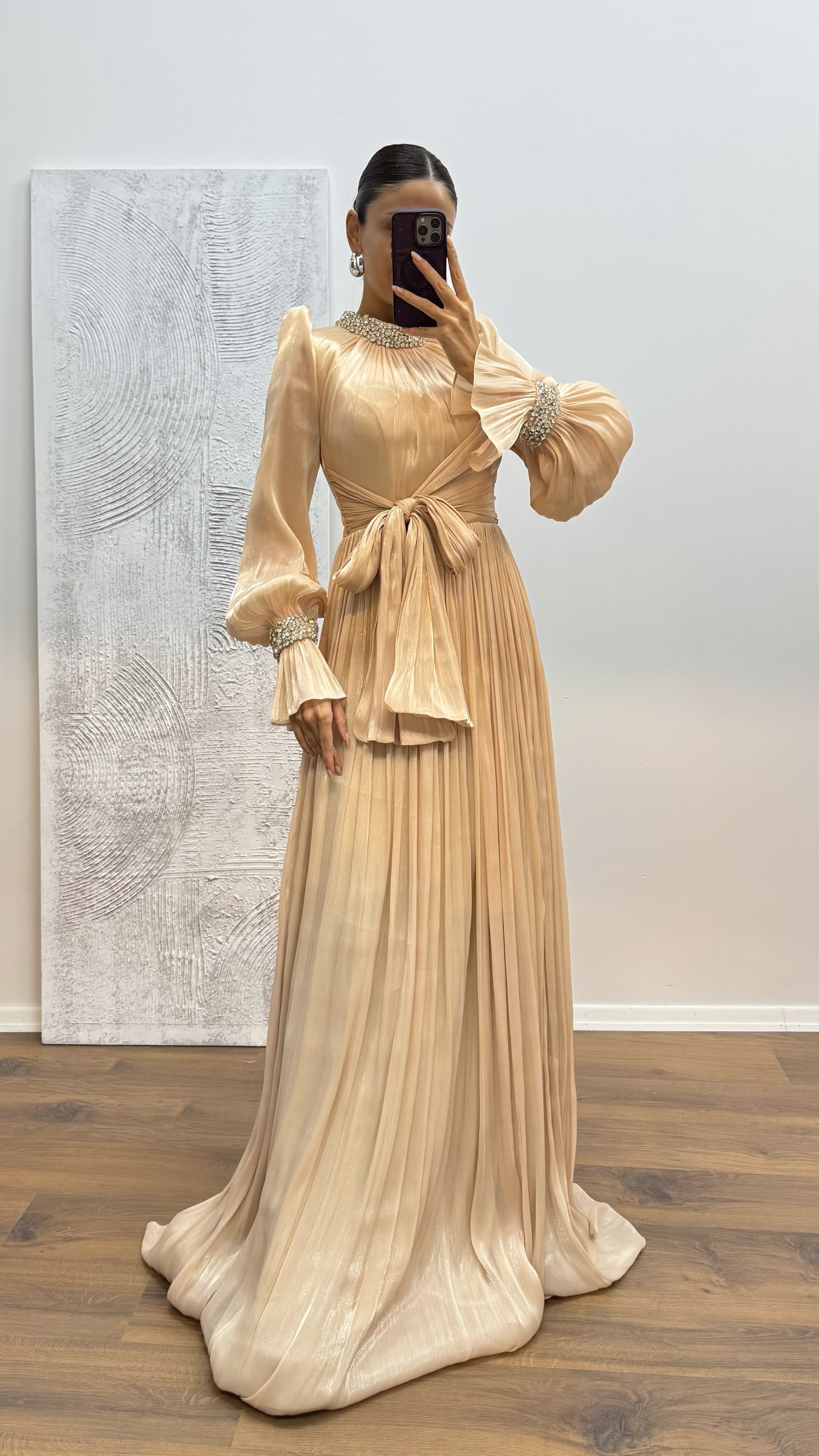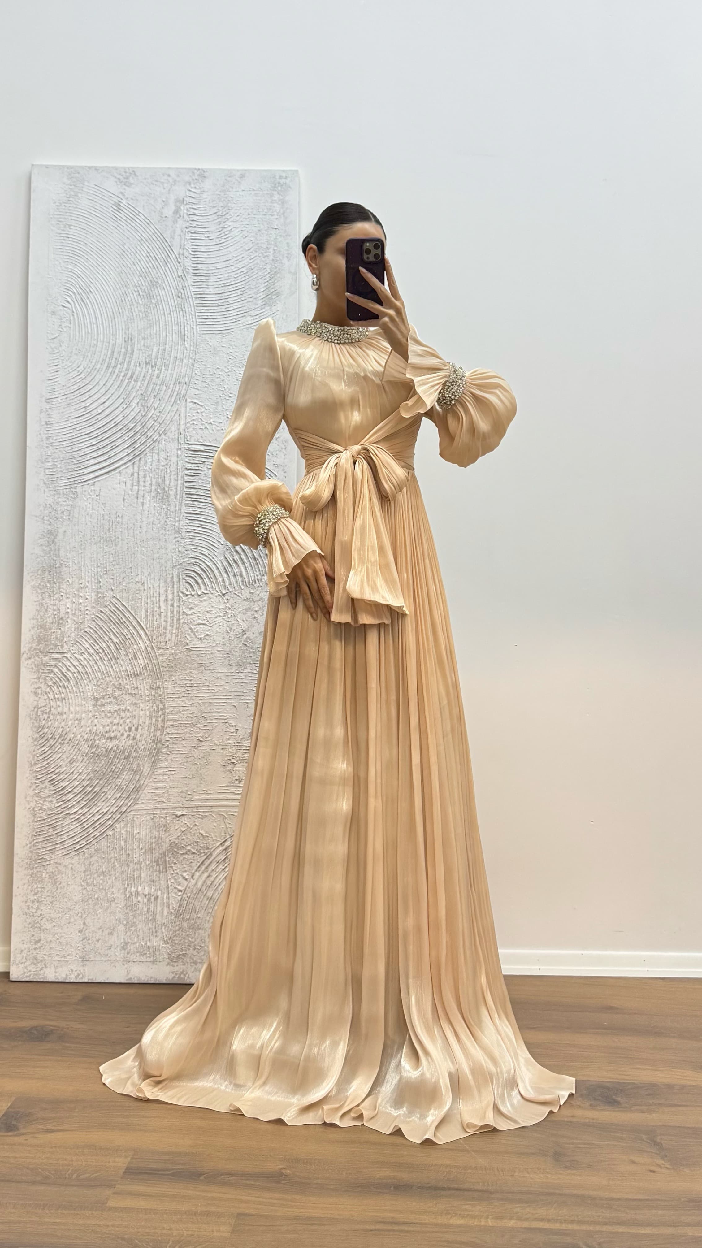 Abendkleid mit Stickdetails an den Ärmeln und dem Kragen Das Produkt ist in den Größen 36-42 erhältlich, mit Brustpolstern, gefüttert, mit Reißverschluss auf der Rückseite, entworfen als Abendkleid mit Stickdetails. Länge des Produkts: Kann zwischen 165 und 170 cm variieren. Ärmellänge des Produkts: 60 cm. Stoffart: Chiffon mit 3% Lycra und 97% Polyester.