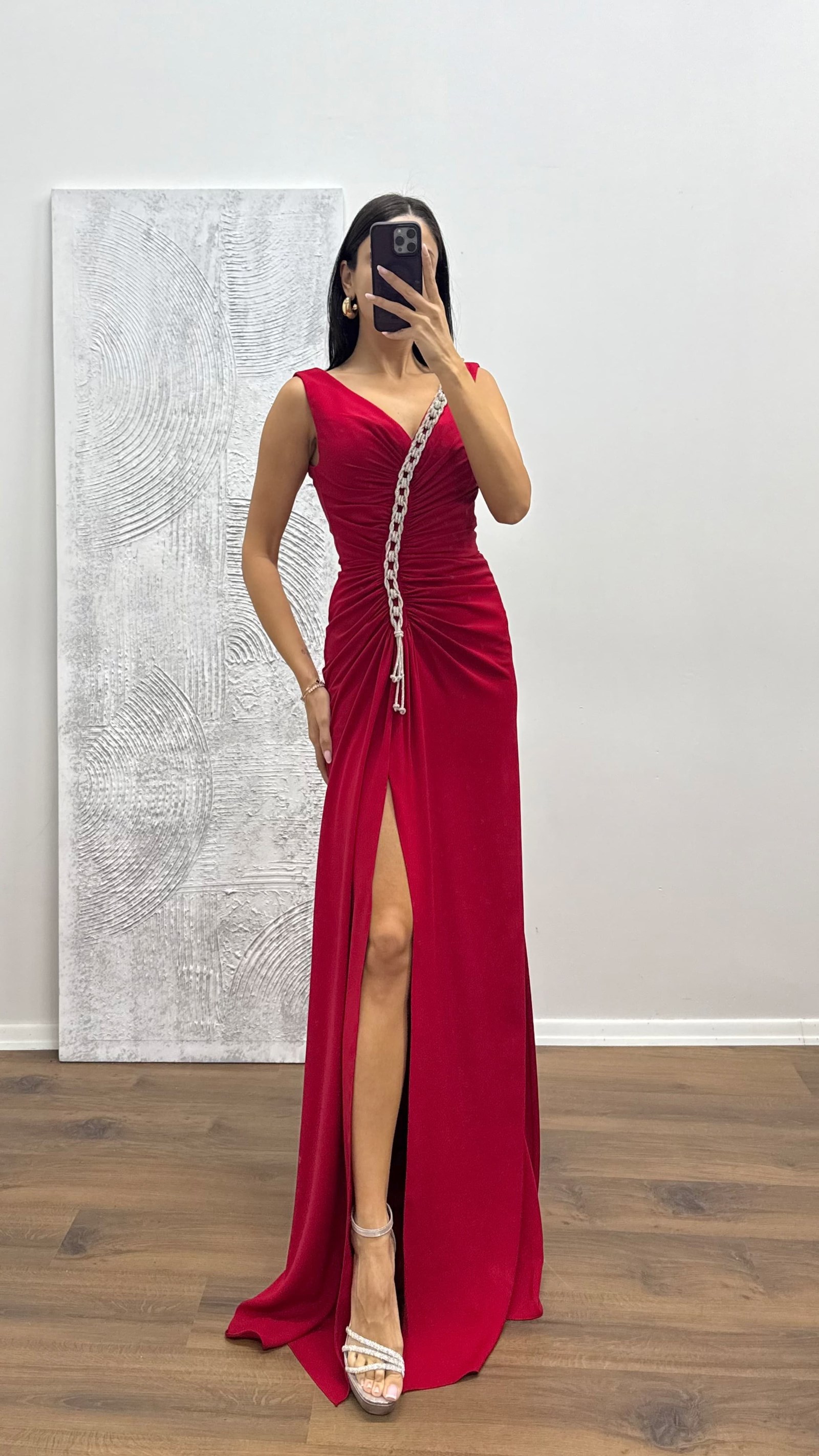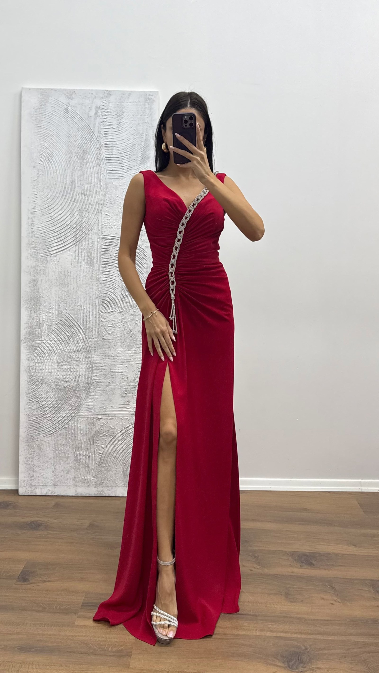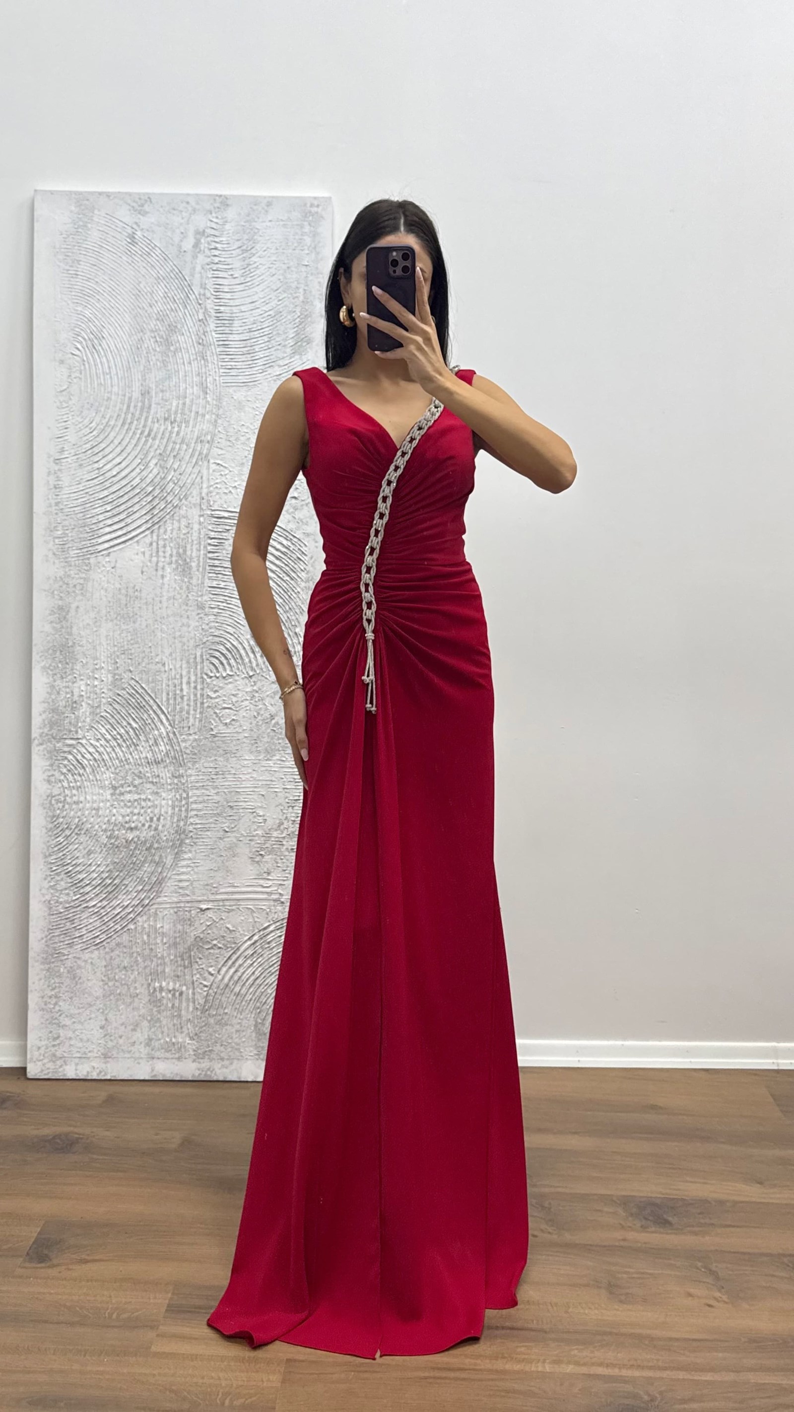 • Kırmızı V Yaka Zincir Detay Abiye Elbise