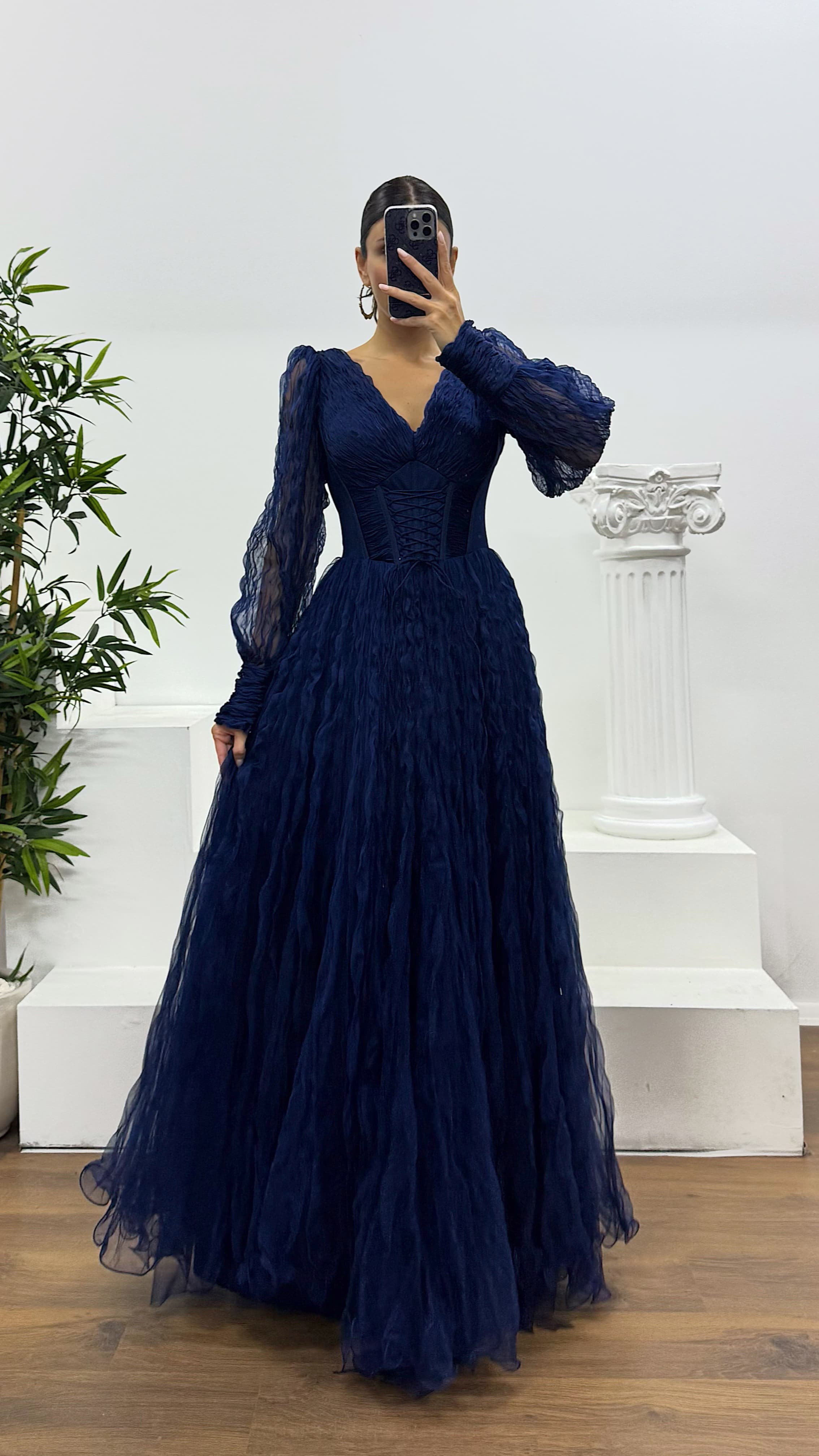Marineblaues Abendkleid aus Crêpe-Tüll