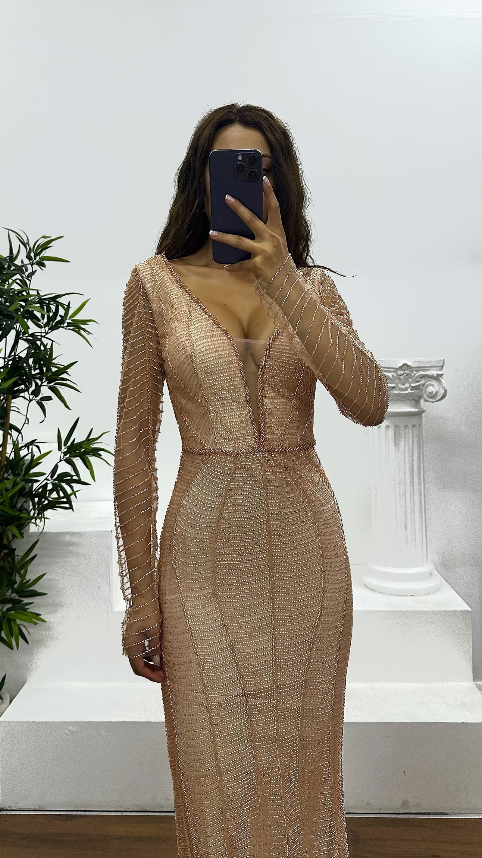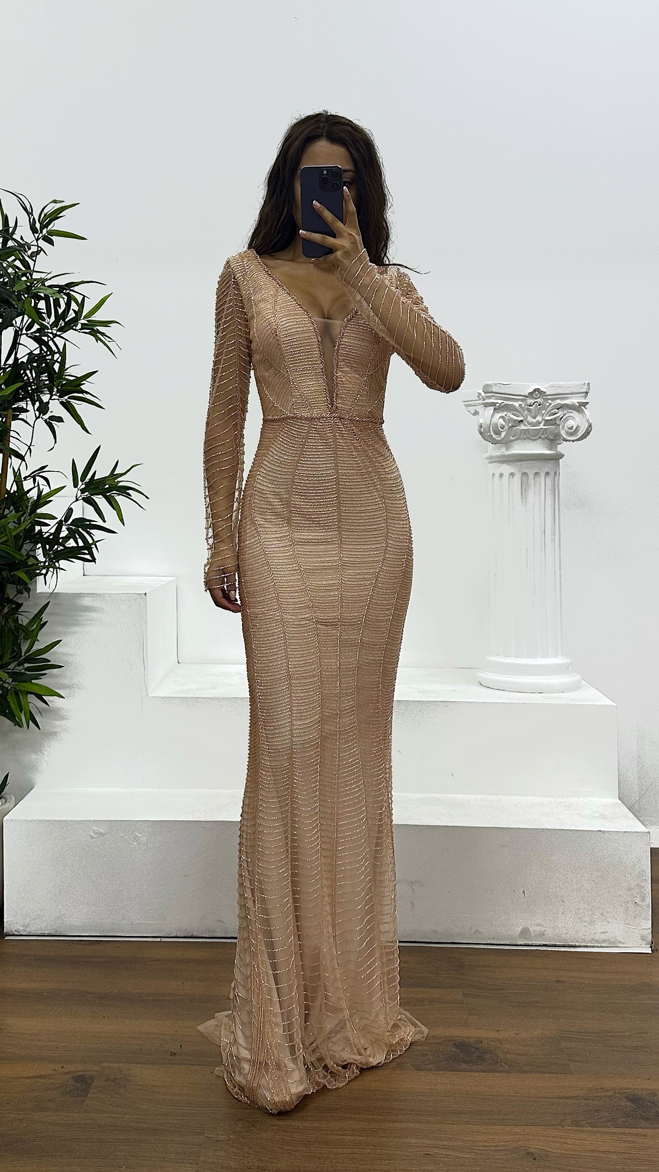 Lachsfarbenes Abendkleid mit V-Ausschnitt und Stickerei