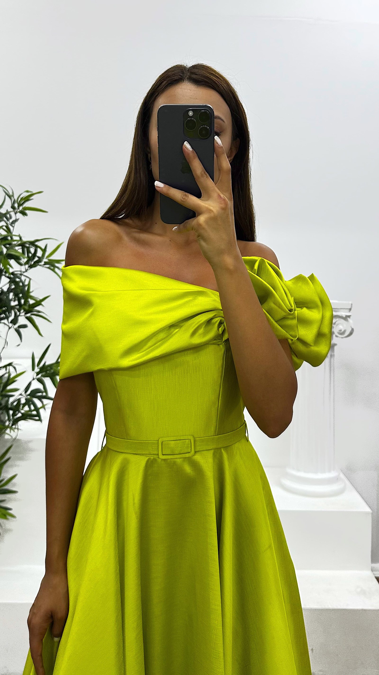 • Fıstık Yeşili Omuz Çiçek Detay Midi Abiye Elbise