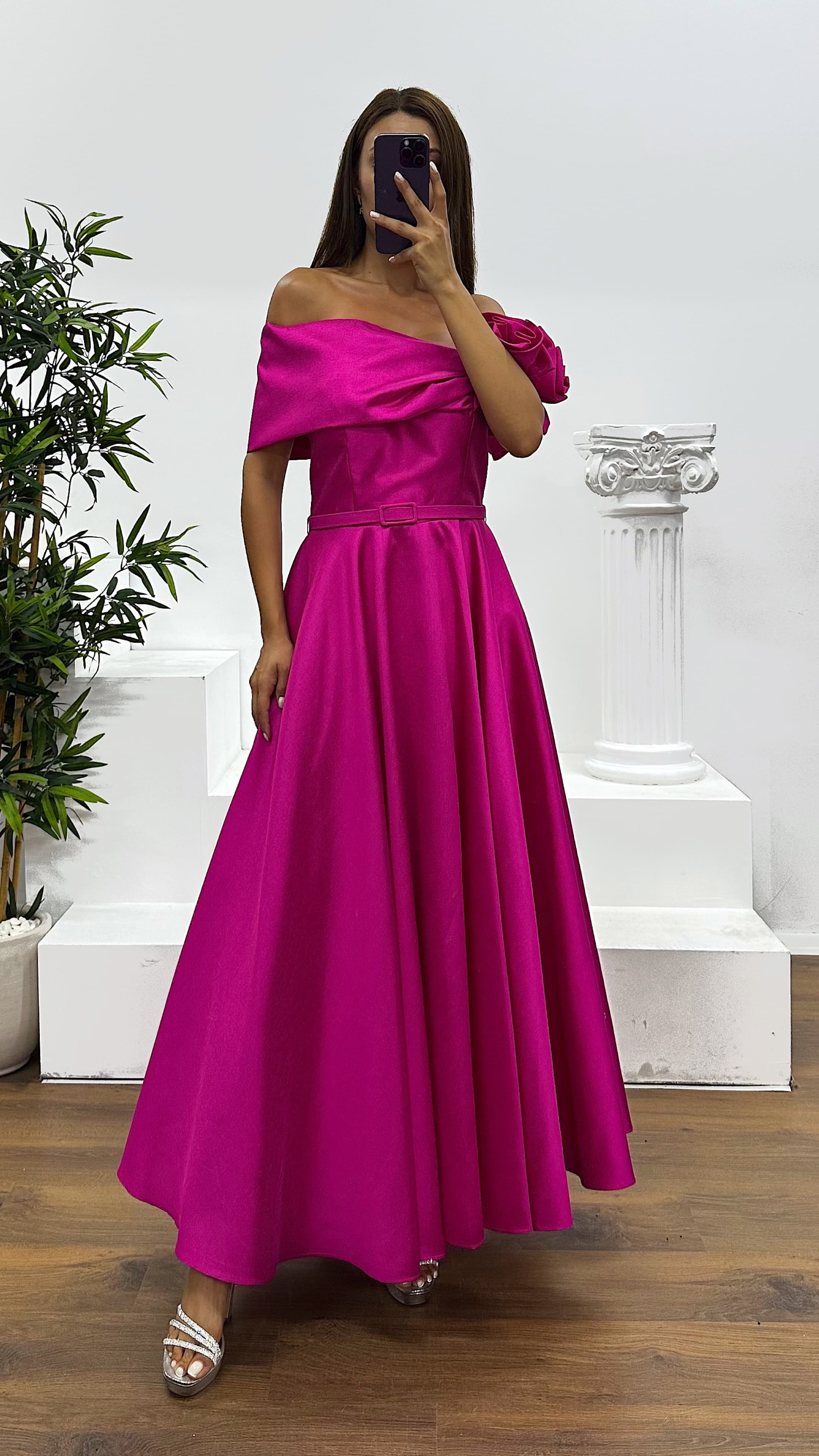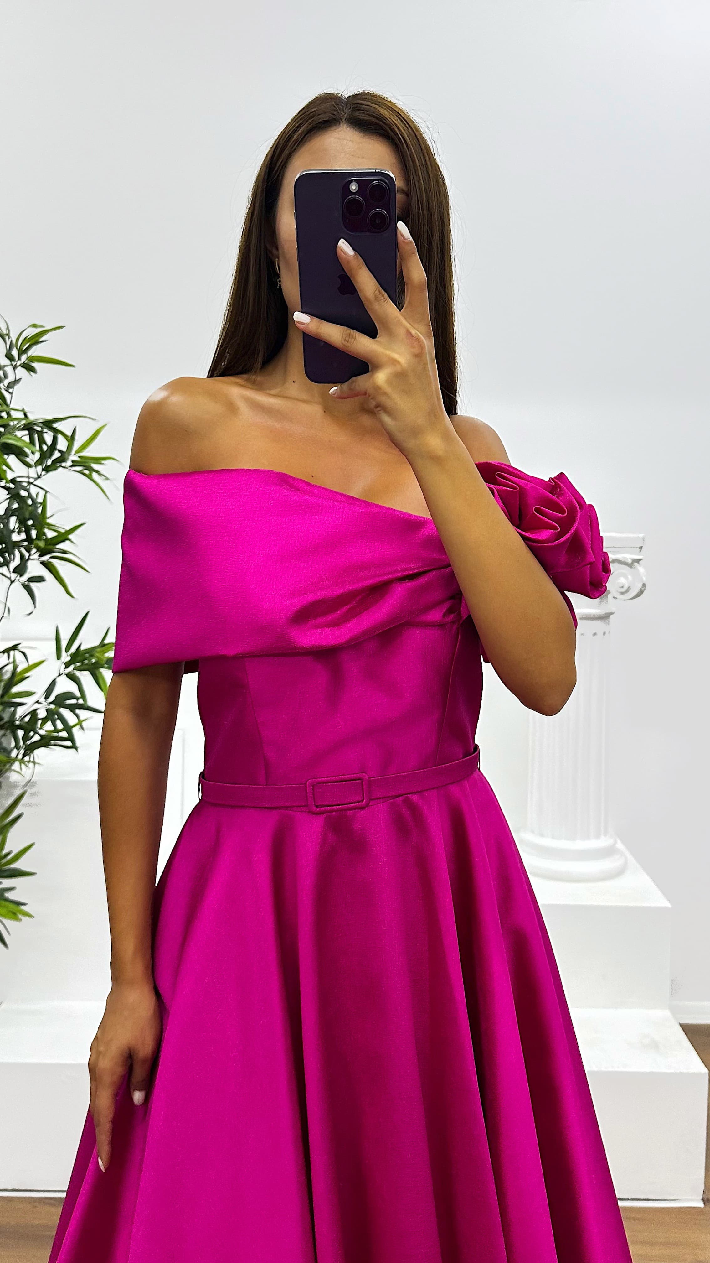 • Fuşya Omuz Çiçek Detay Midi Abiye Elbise