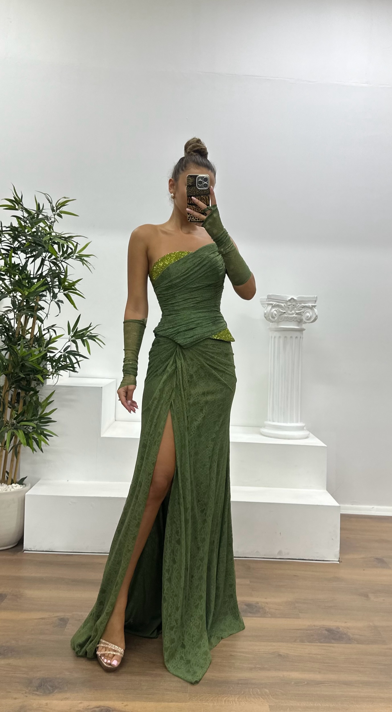 Schulterfreies Abendkleid mit Handschuh-Detail Das Produkt ist als schulterfreies Abendkleid mit Handschuhen konzipiert, passend für Größen 36 bis 42. Es verfügt über Brustpolster, ein Innenfutter, einen Reißverschluss hinten und einen Schlitz. Länge des Kleides: Kann zwischen 170 und 175 cm variieren. Stoffart: Spitze