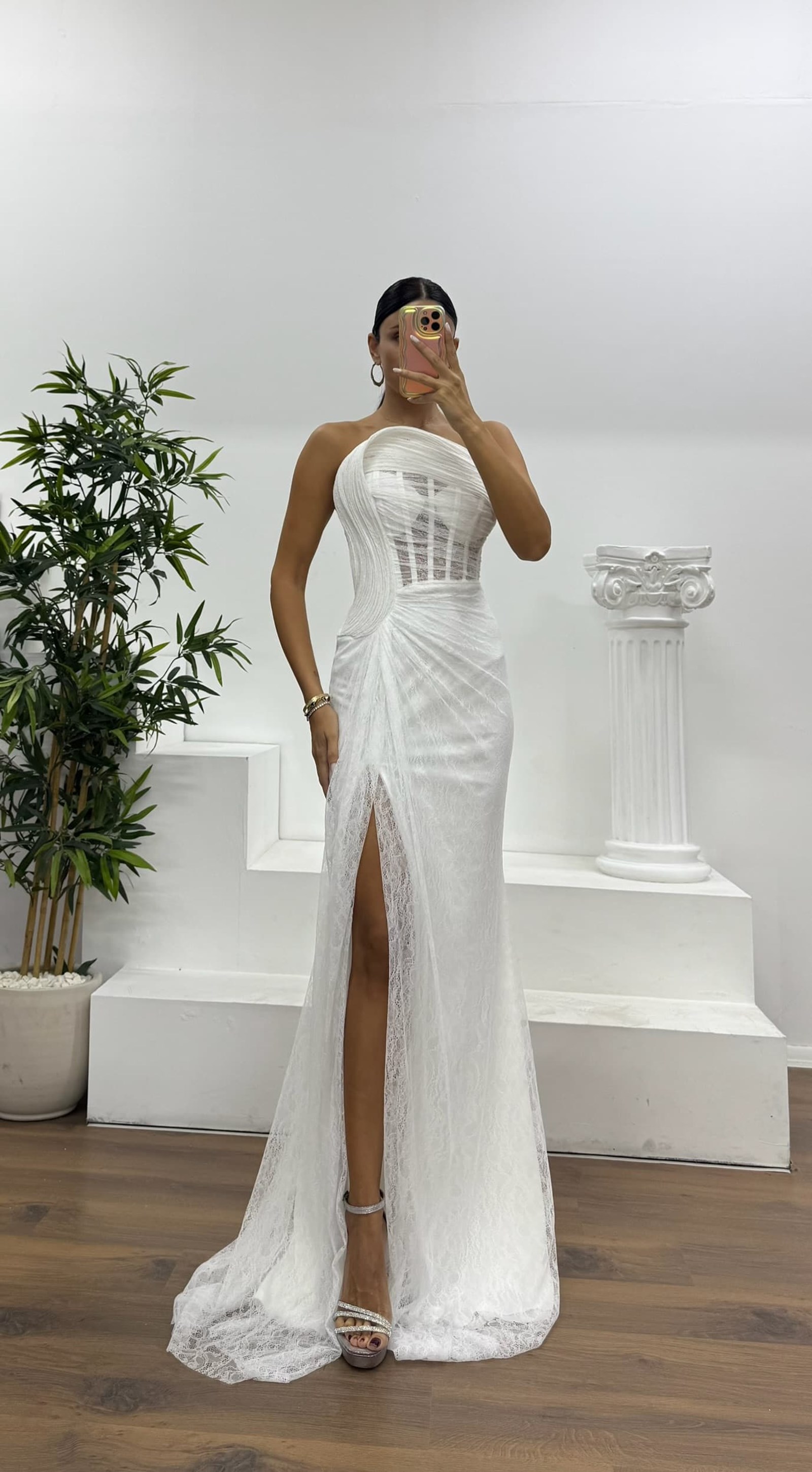 5 BewertungKemik Straplez Bel Transparan Dantel Abiye Elbise Ürün Yorumları