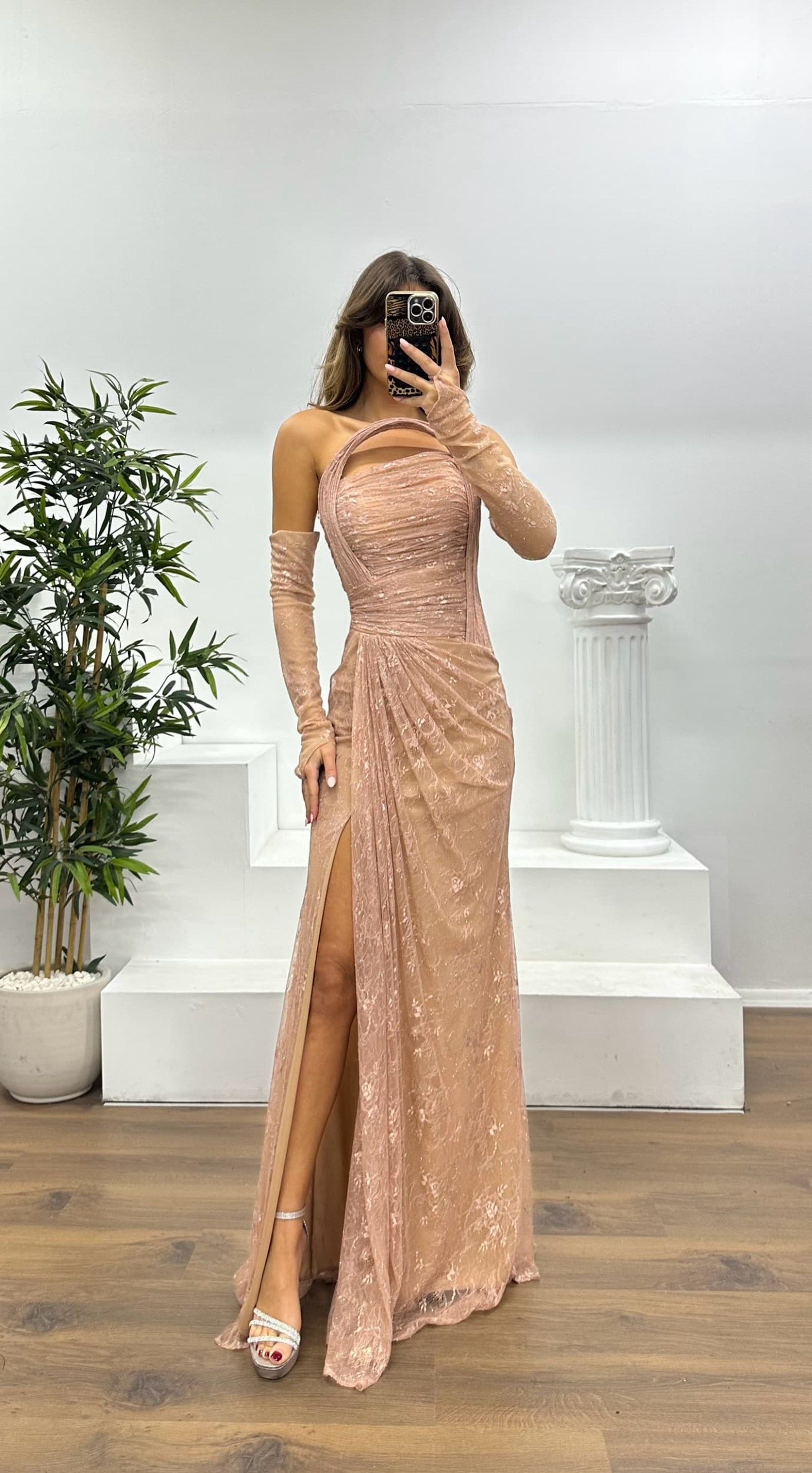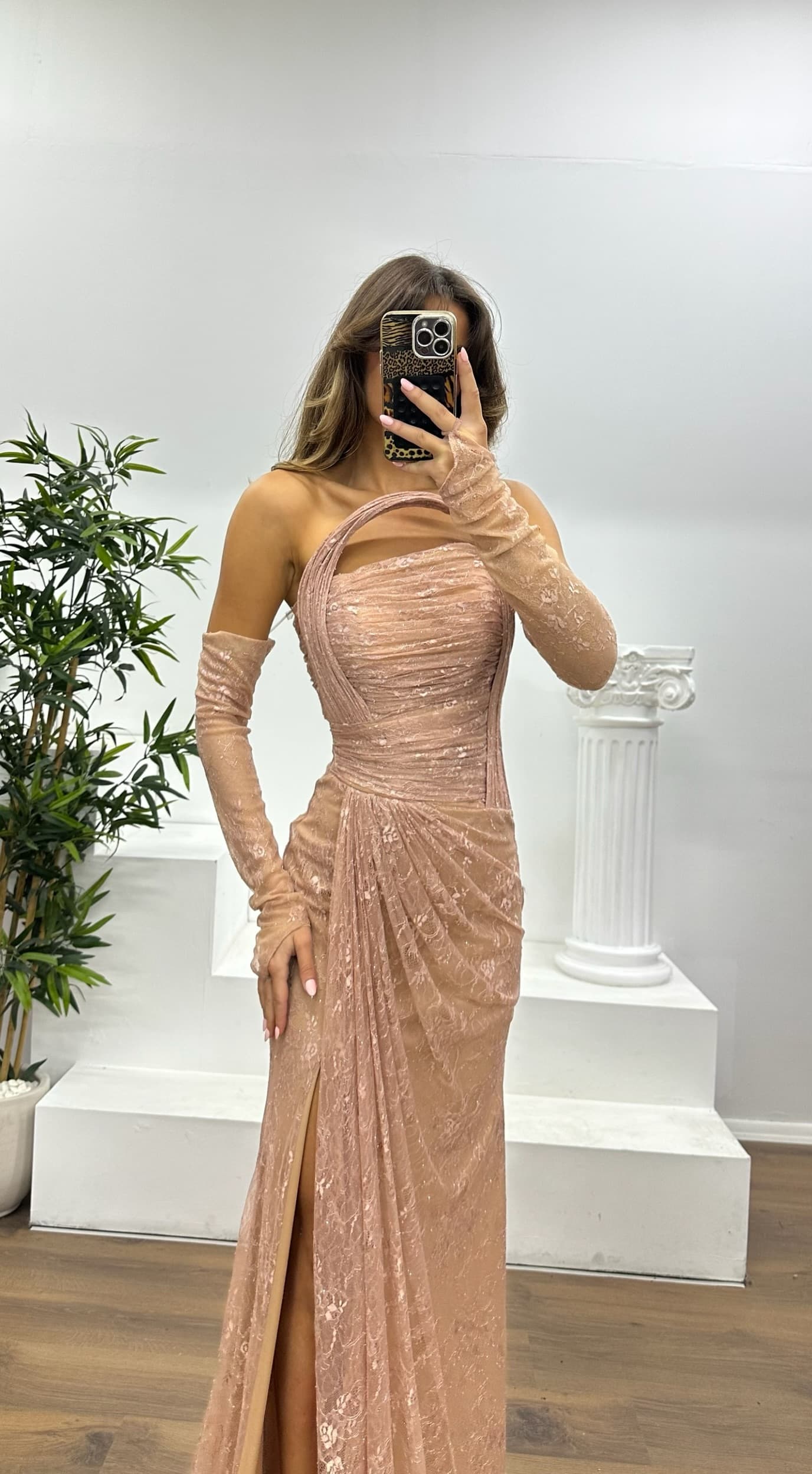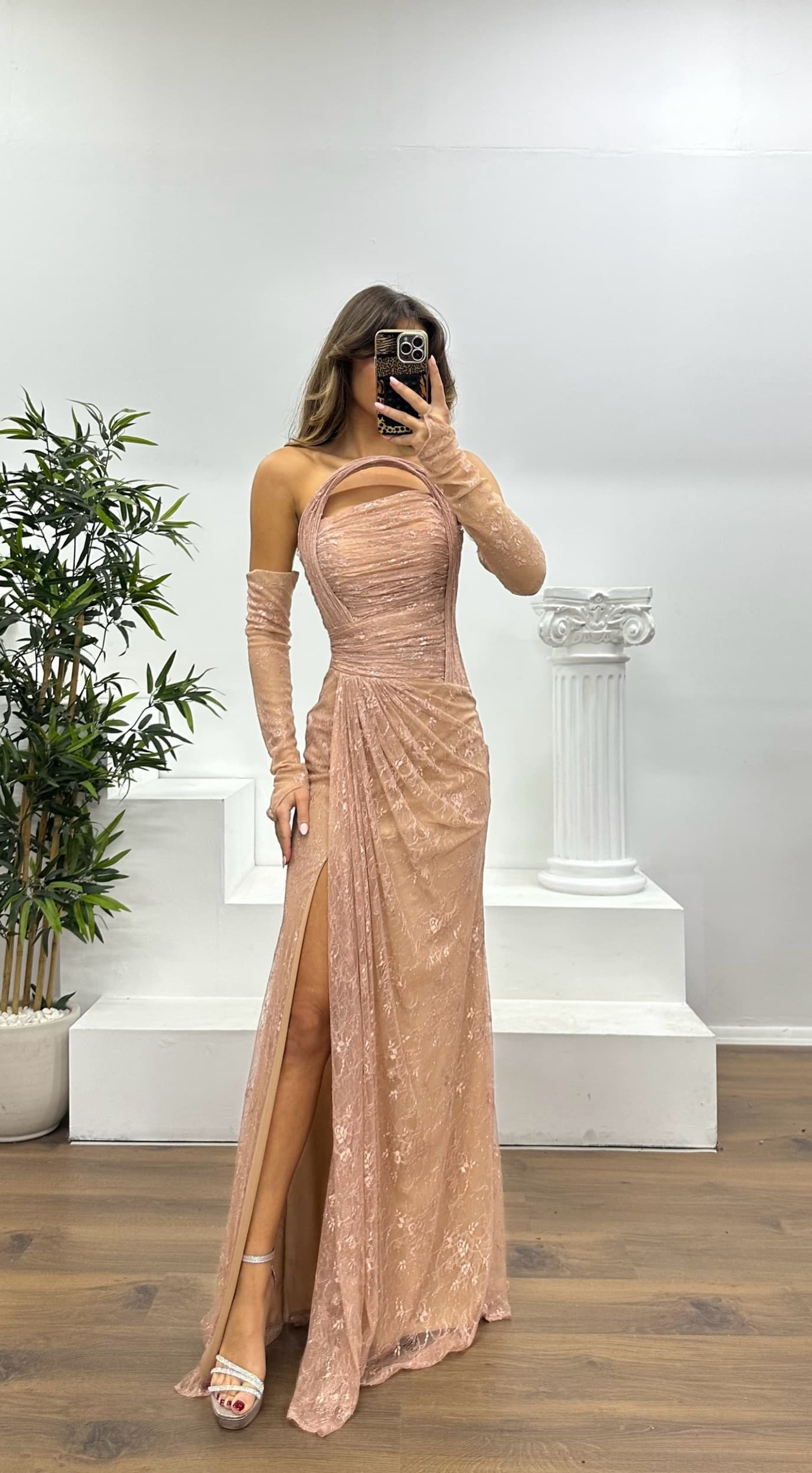 Schulterfreies Spitzen-Abendkleid Passend für Größen 36–42, mit gepolstertem Brustteil, Futter, überkreuzten Rückenschnüren und Reißverschluss, Schlitz und Handschuhen. Länge: 170–175 cm. Stoff: Tüll (3 % Lycra, 97 % Polyester). Ideal, um bei Hochzeiten, Verlobungen, Abschlussfeiern oder festlichen Anlässen elegant aufzufallen