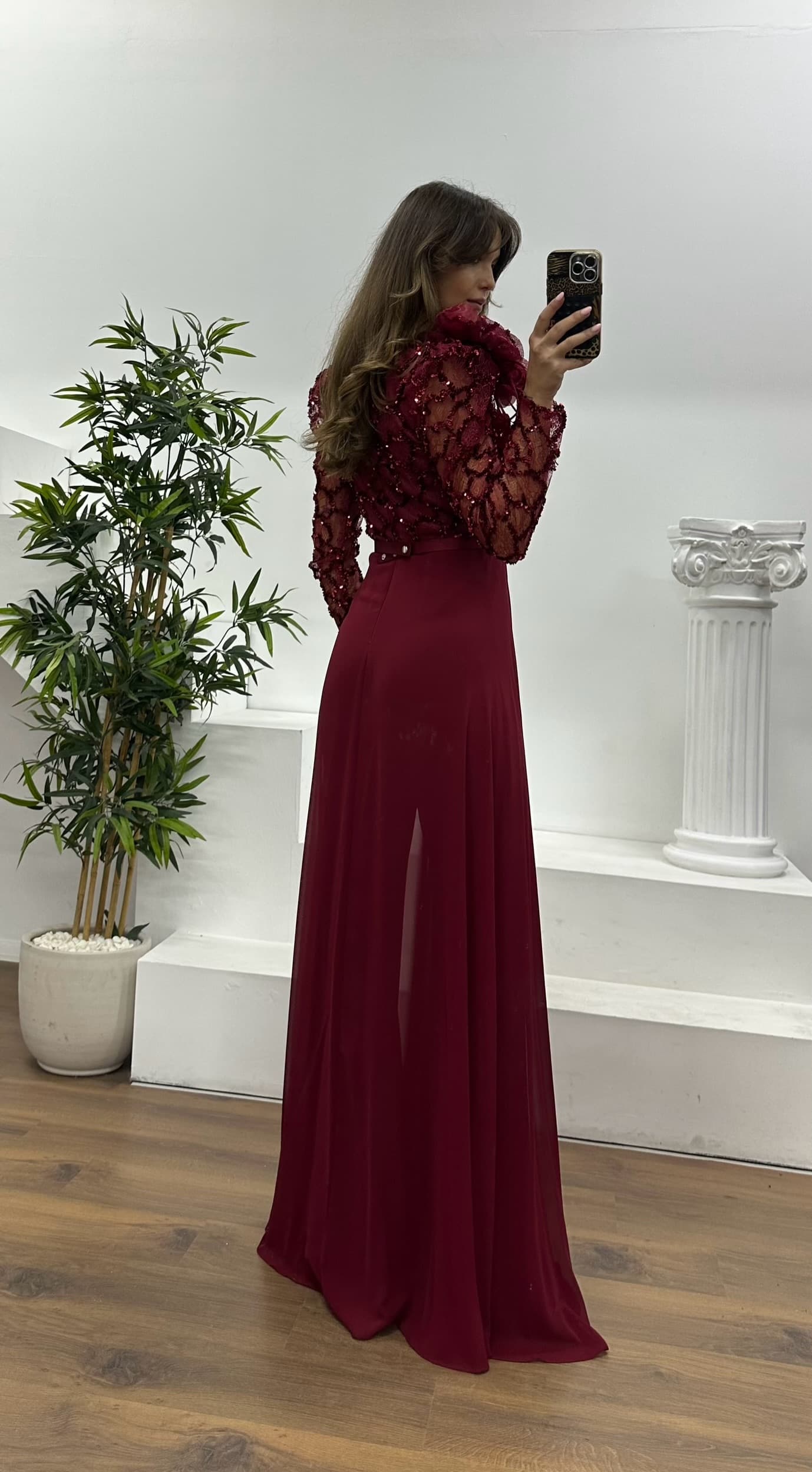 Besticktes Abendkleid Das Kleid passt Größen 36–42, hat gepolsterte Cups, Futter, einen Reißverschluss hinten, einen Gürtel, florale Details und Stickereien. Länge: variiert zwischen 170–175 cm. Stoff: Chiffon (66 % Viskose, 34 % Polyester) – Paillettenstickerei (100 % Polyester). Ideal, um bei Hochzeit, Verlobung, Abschlussfeier oder Festlichkeit stilvoll aufzufallen.
