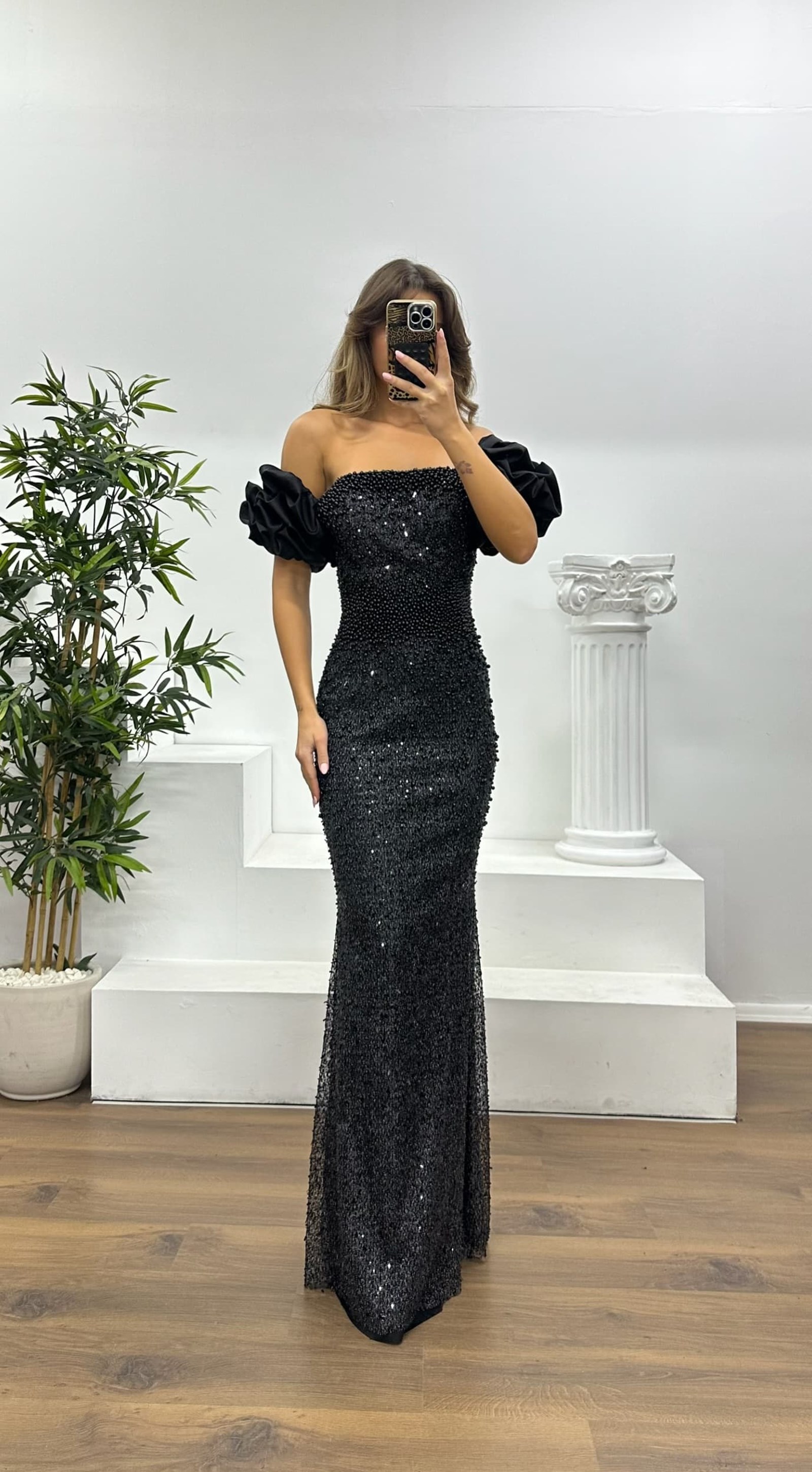 • Siyah Balon Kol İşlemeli Abiye Elbise