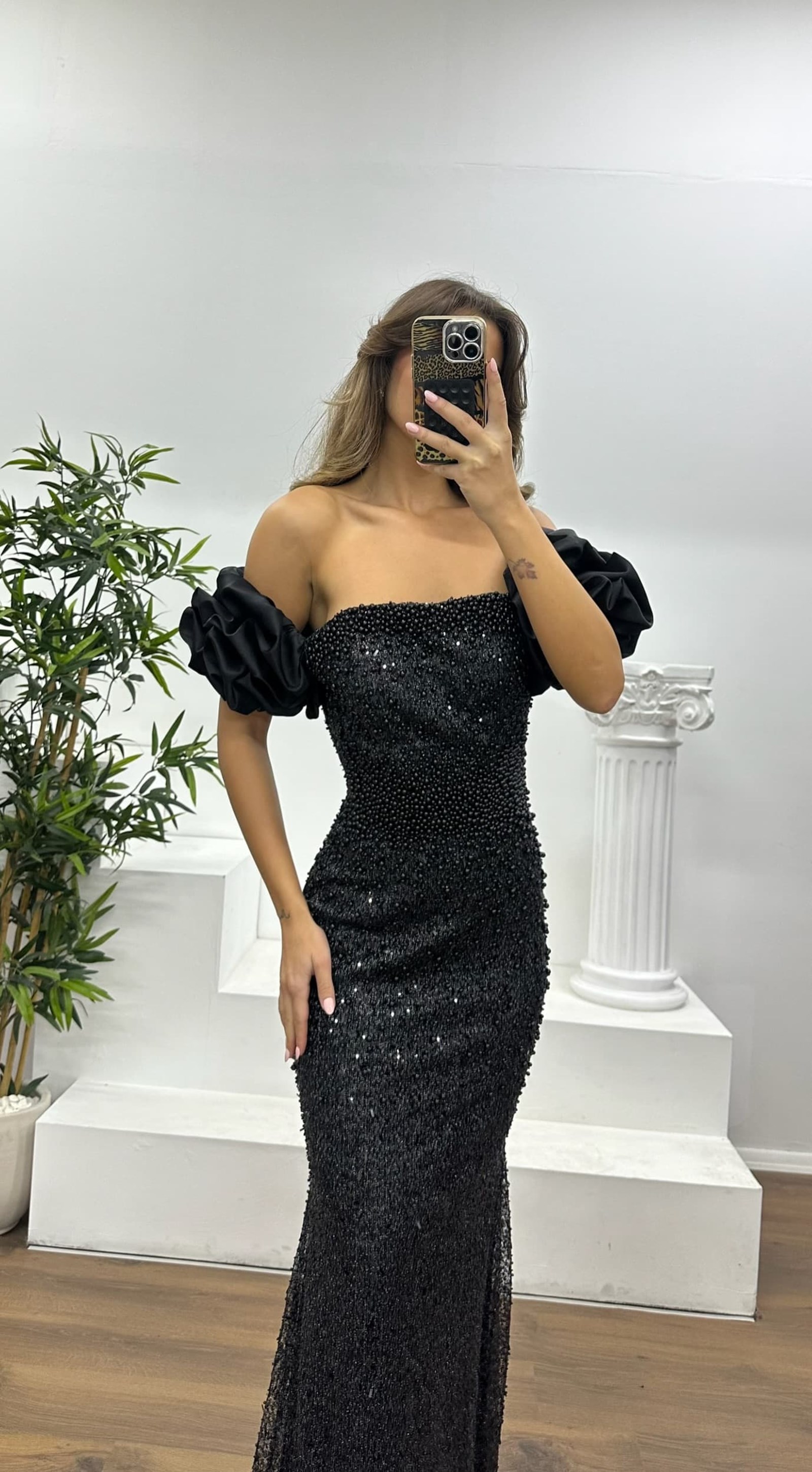 Siyah Balon Kol İşlemeli Abiye Elbise