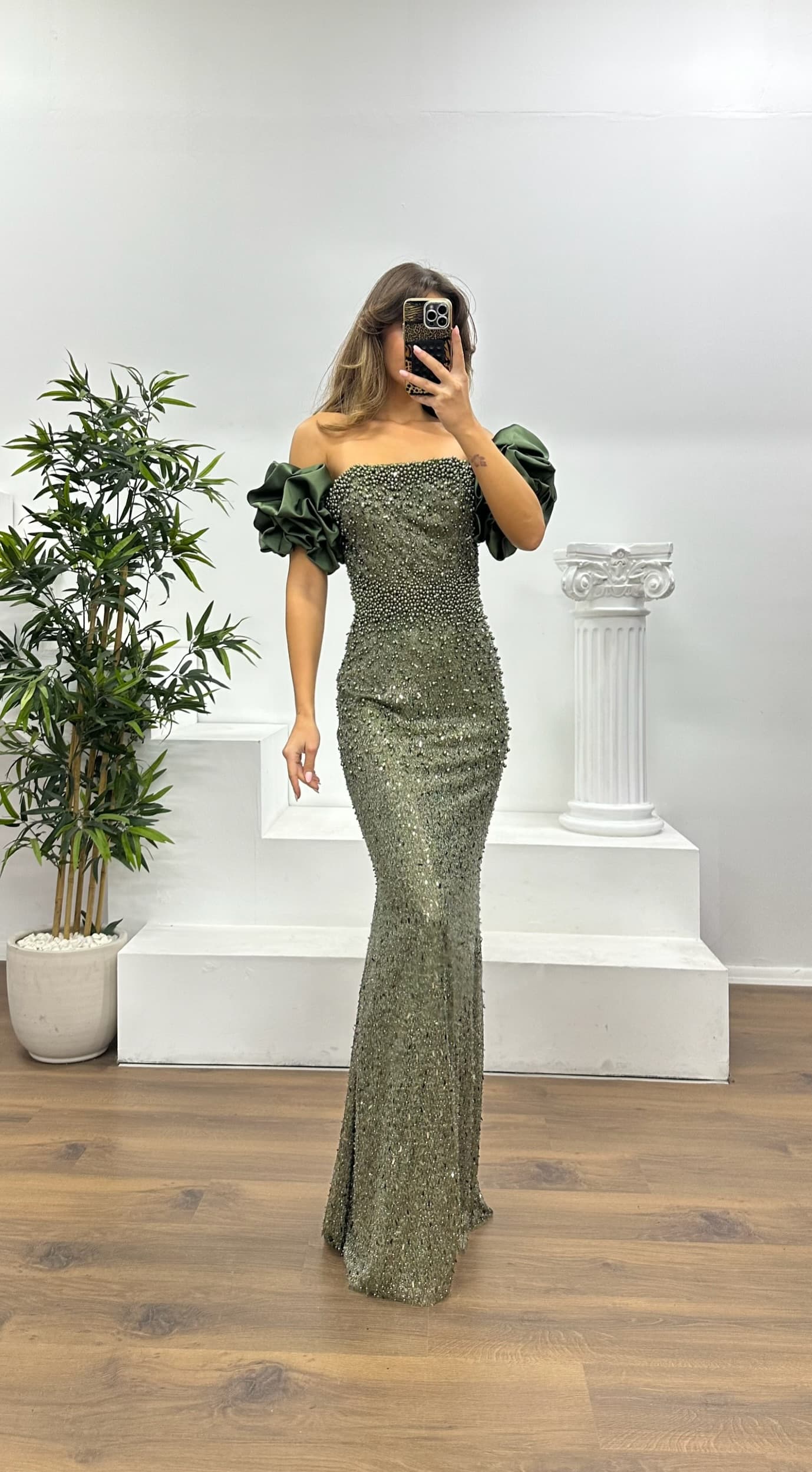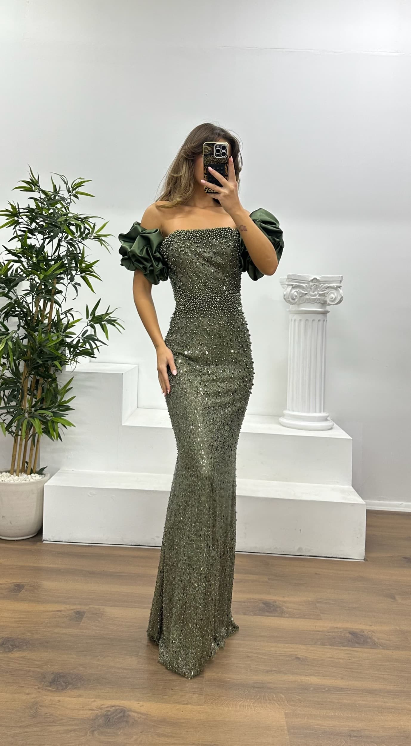 • Haki Balon Kol İşlemeli Abiye Elbise