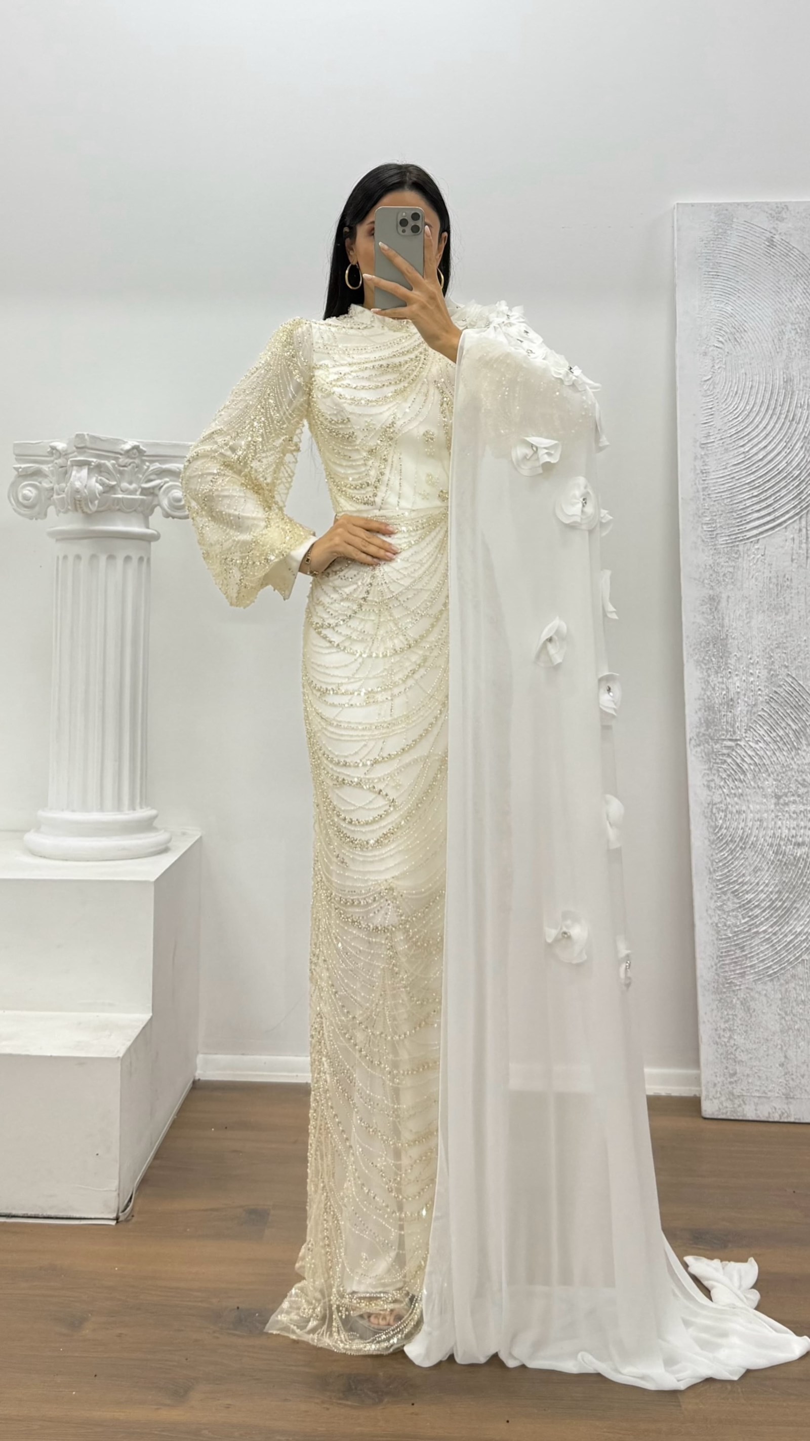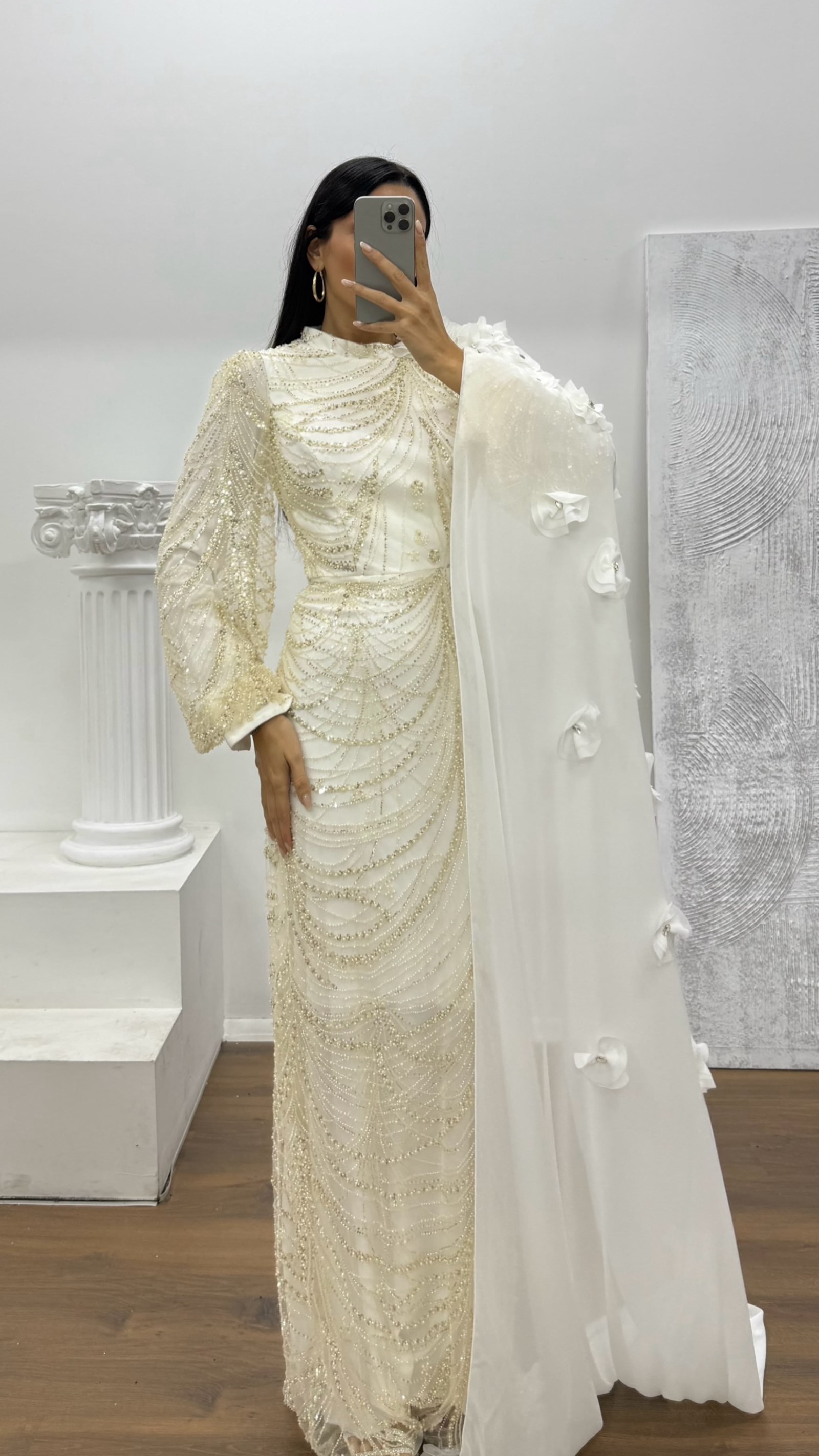 Ekru Kol Şifon Detay İşlemeli Abiye Elbise
