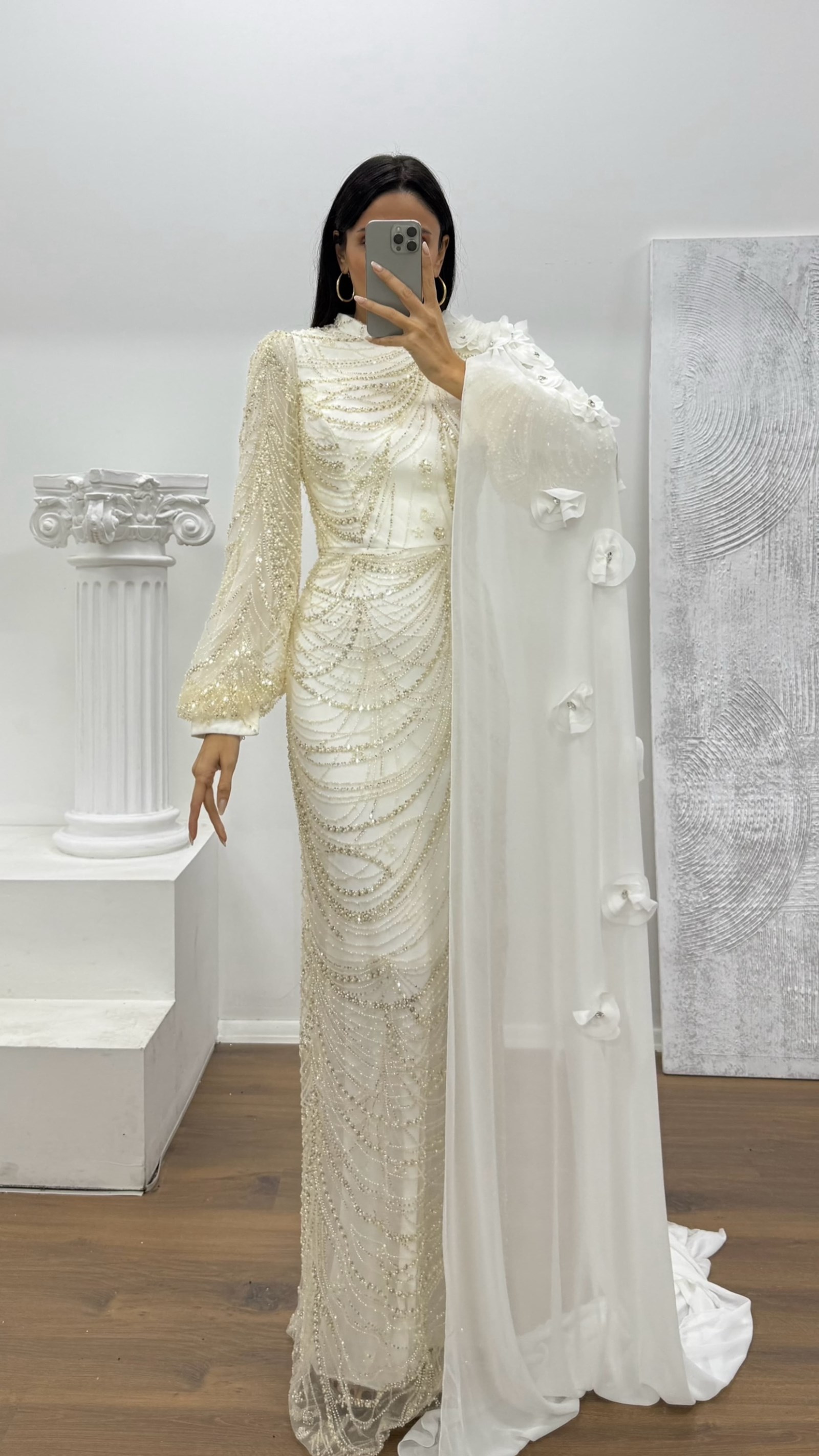• Ekru Kol Şifon Detay İşlemeli Abiye Elbise