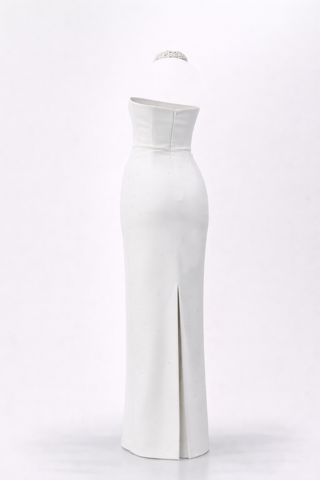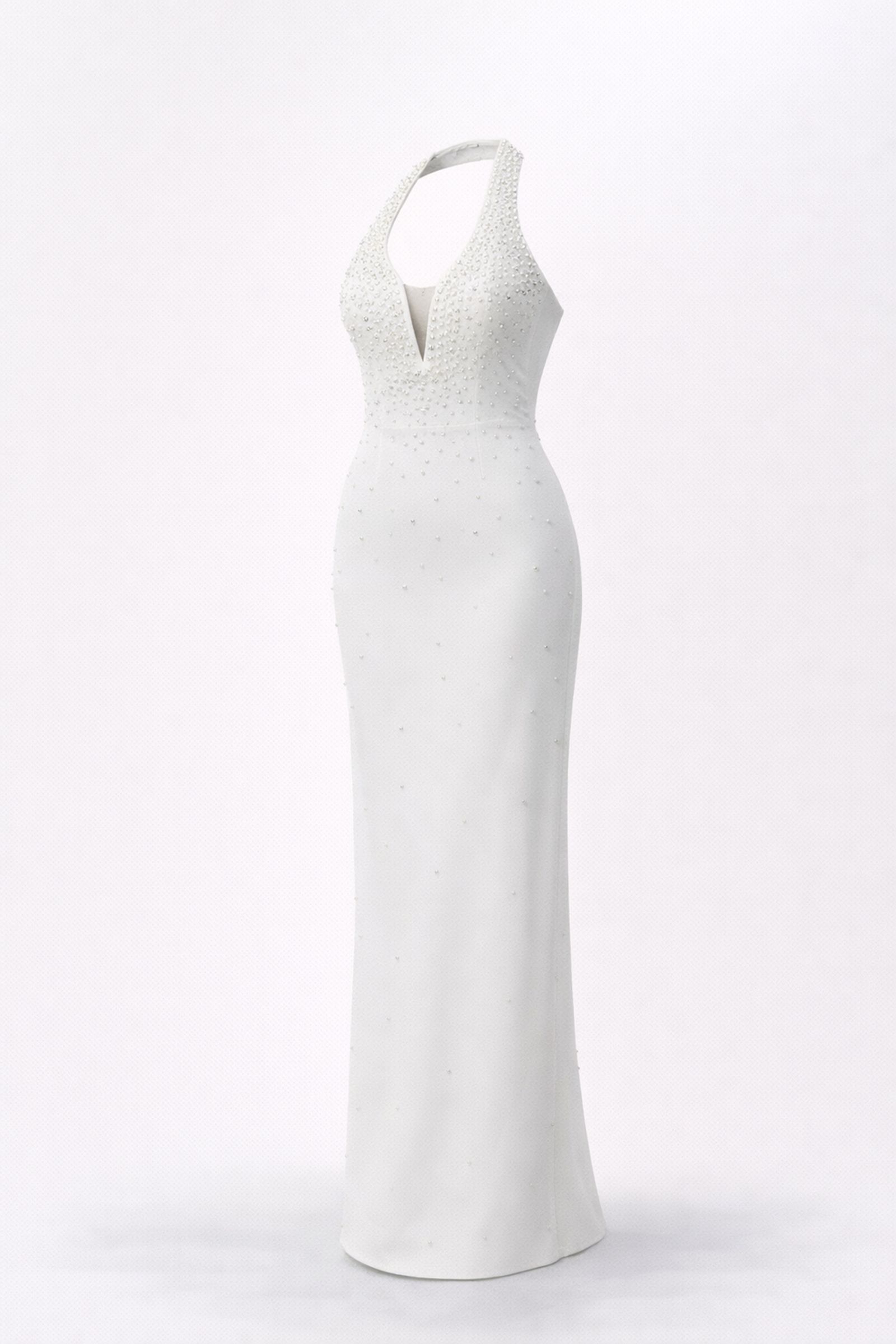 • Kemik Halter Yaka İnci Detay Abiye Elbise
