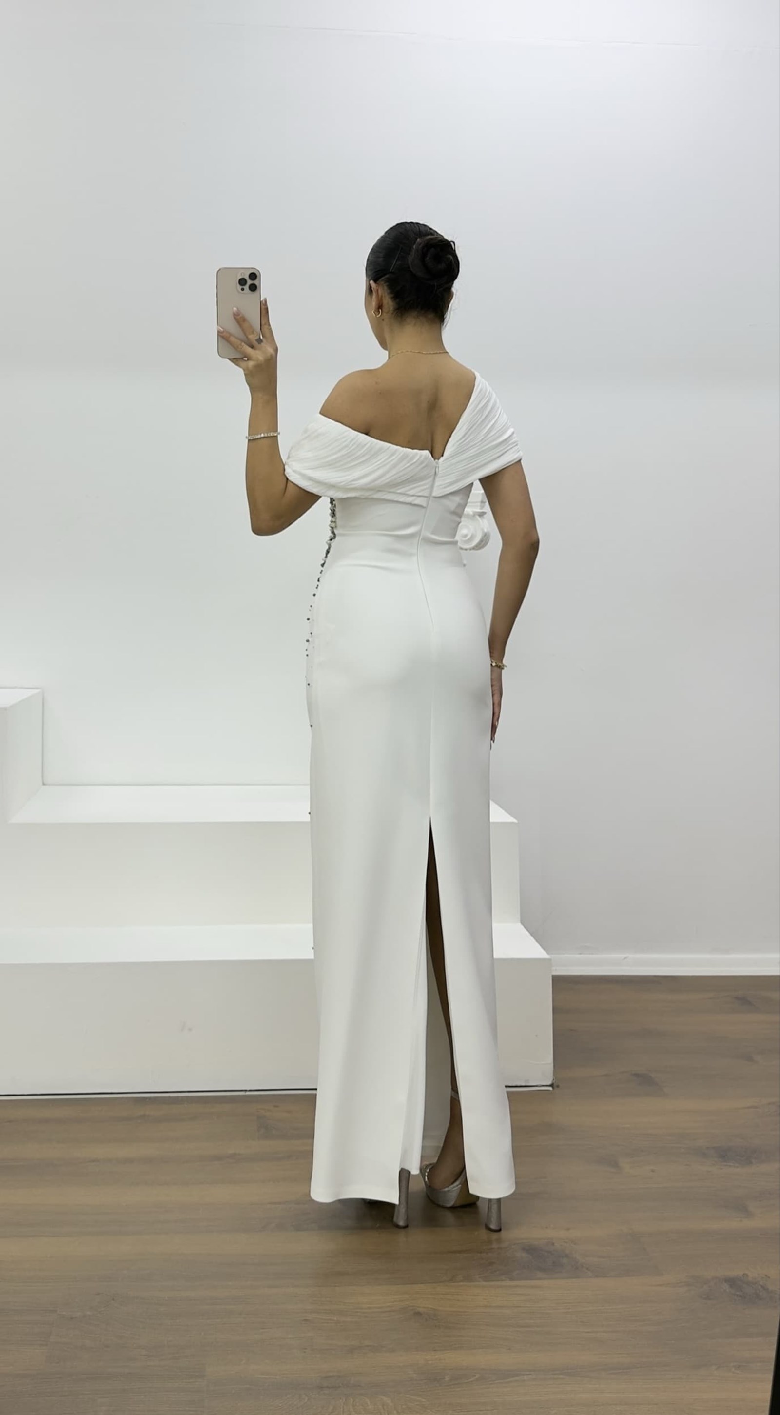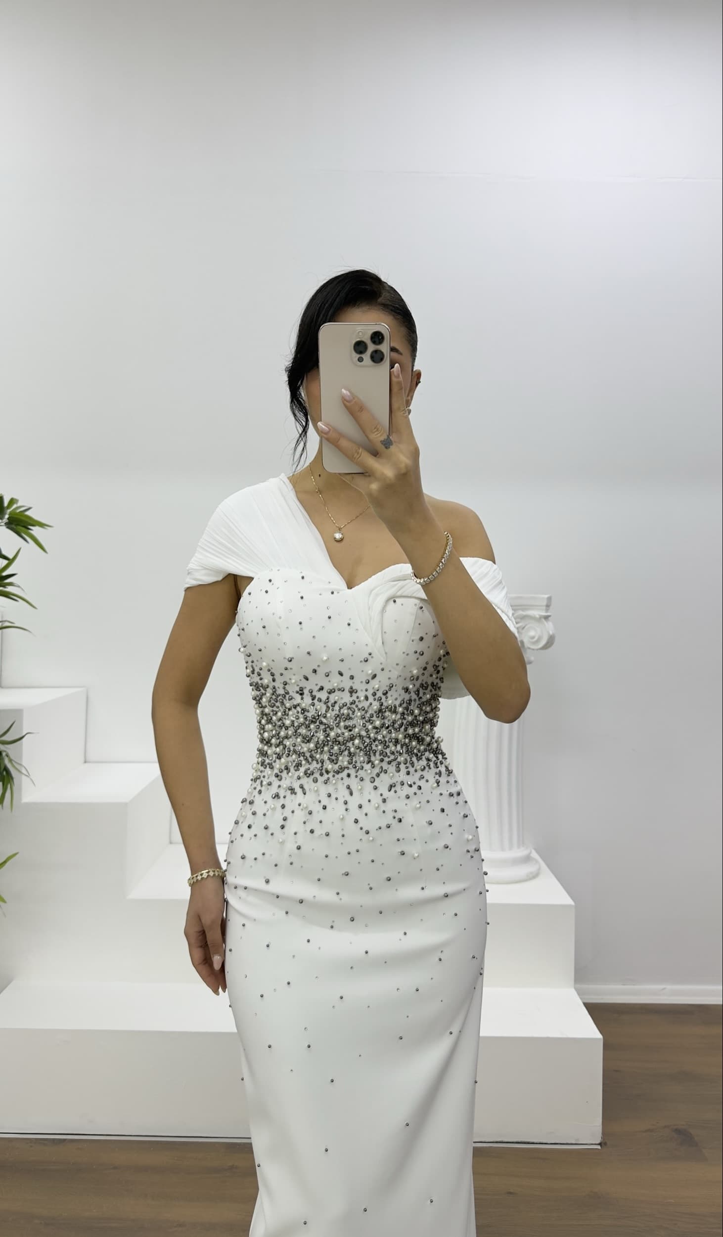 • Kemik Straplez Boncuk İşlemeli Abiye Elbise