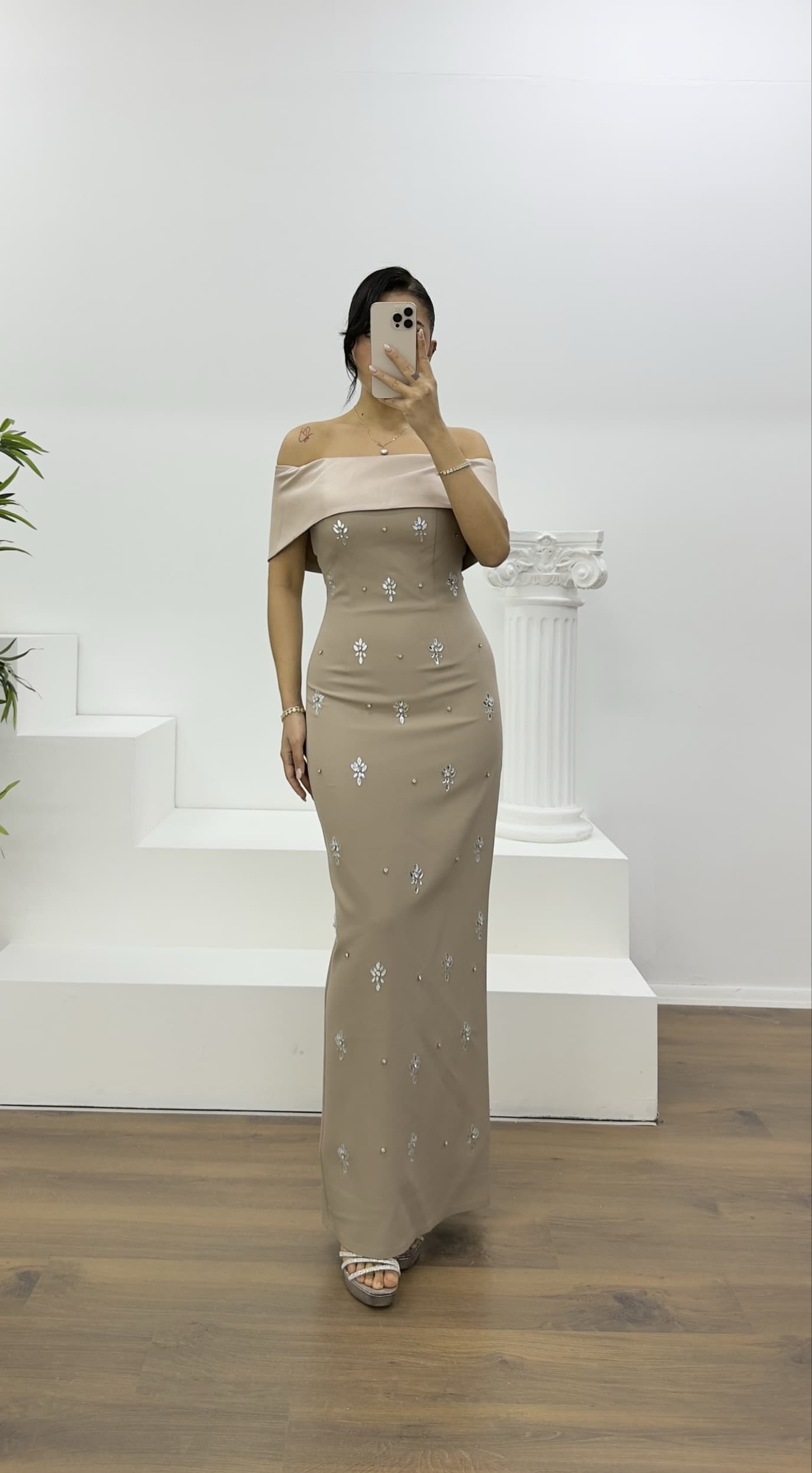 • Vizon Kayık Yaka Taşlı Uzun Abiye Elbise
