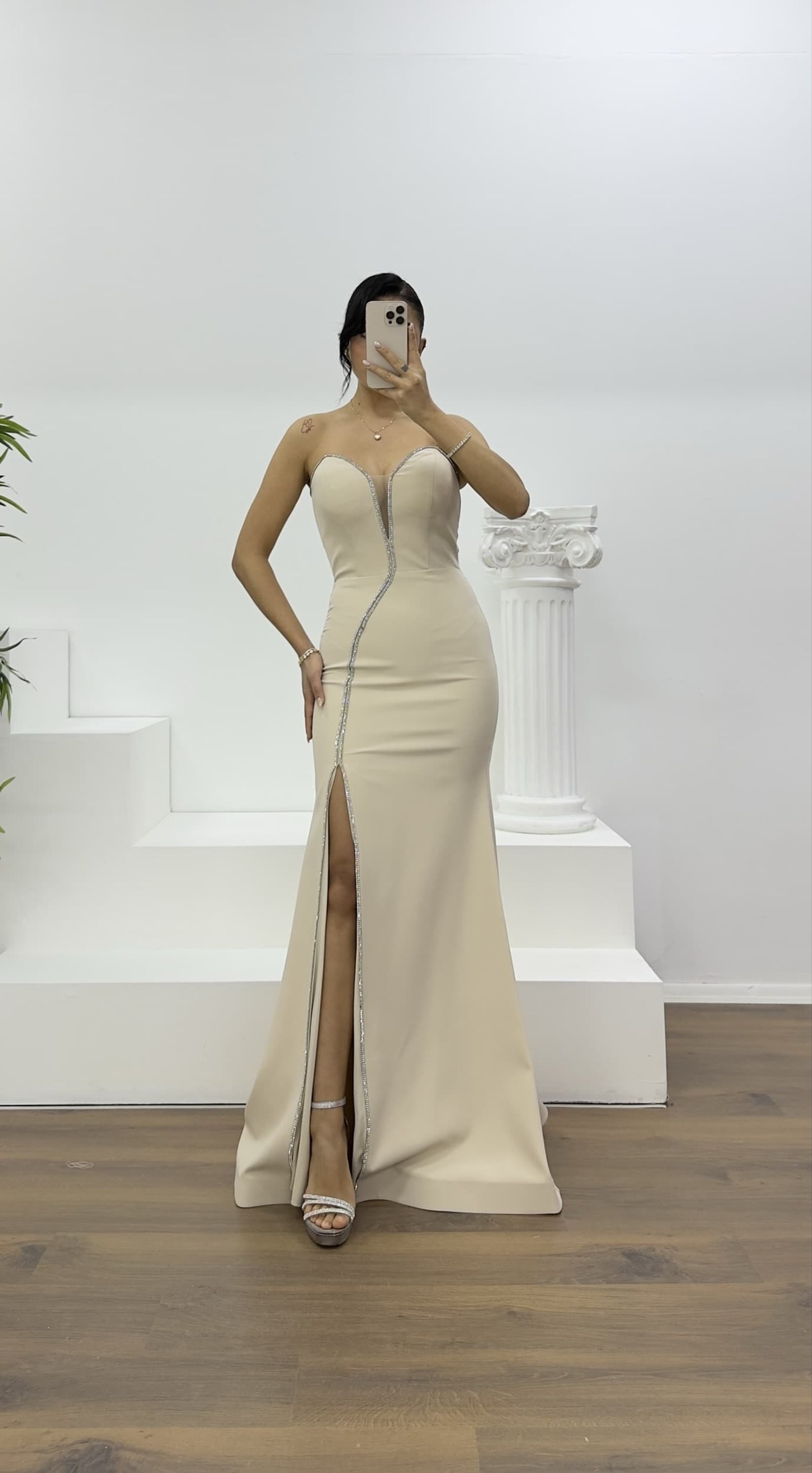• Bej Işıltılı Taş İşleme Şeritli Abiye Elbise
