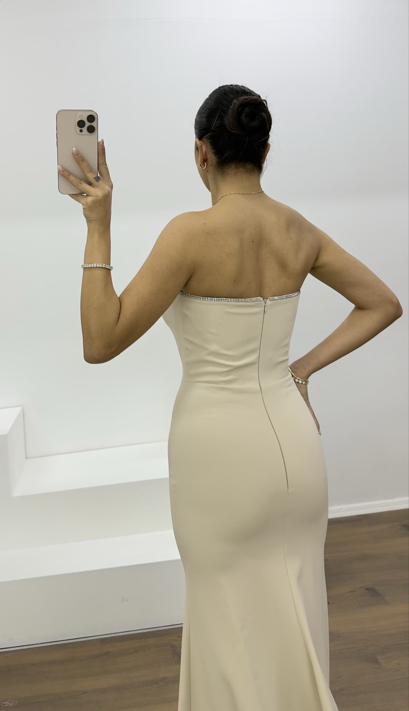 Beigefarbenes, verziertes Abendkleid mit schimmernden Steinverzierungen