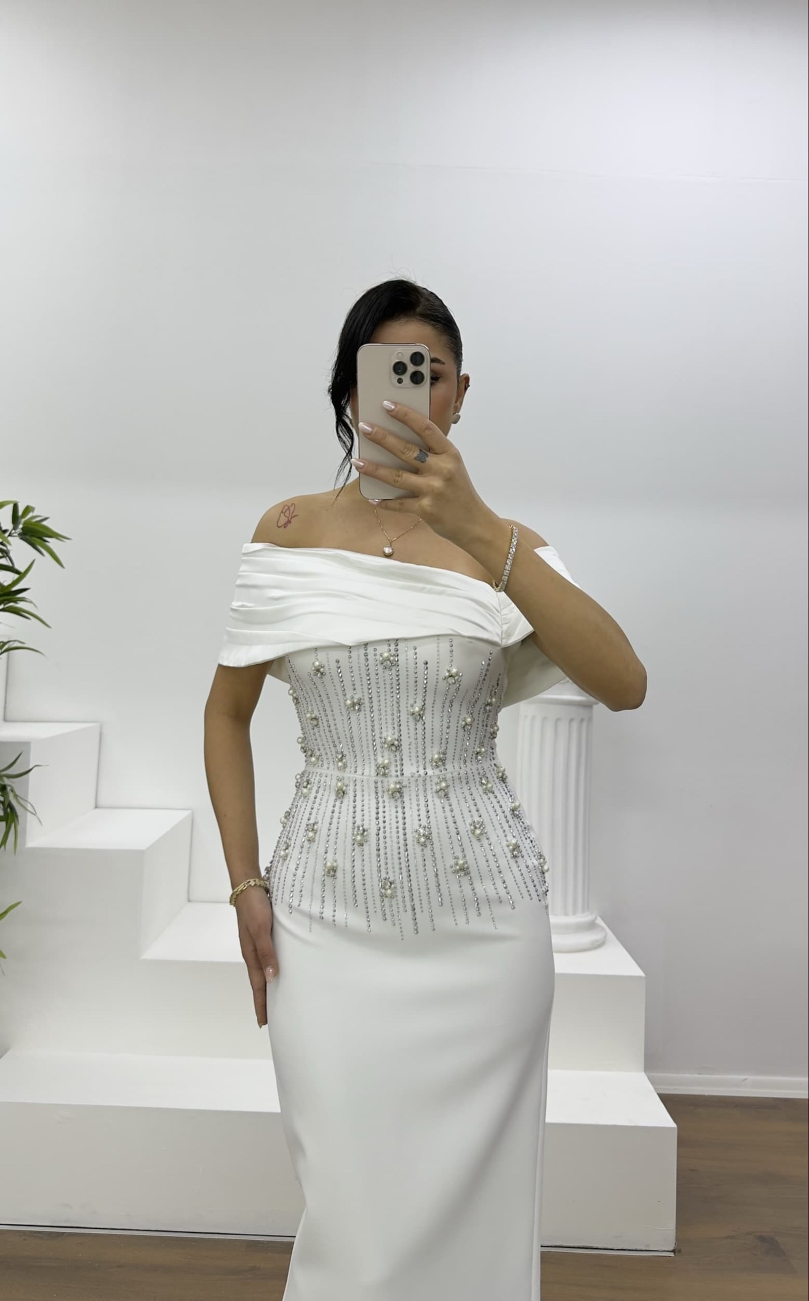 • Kemik Omuzu Drapeli Çiçek Taş İşlemeli Abiye Elbise