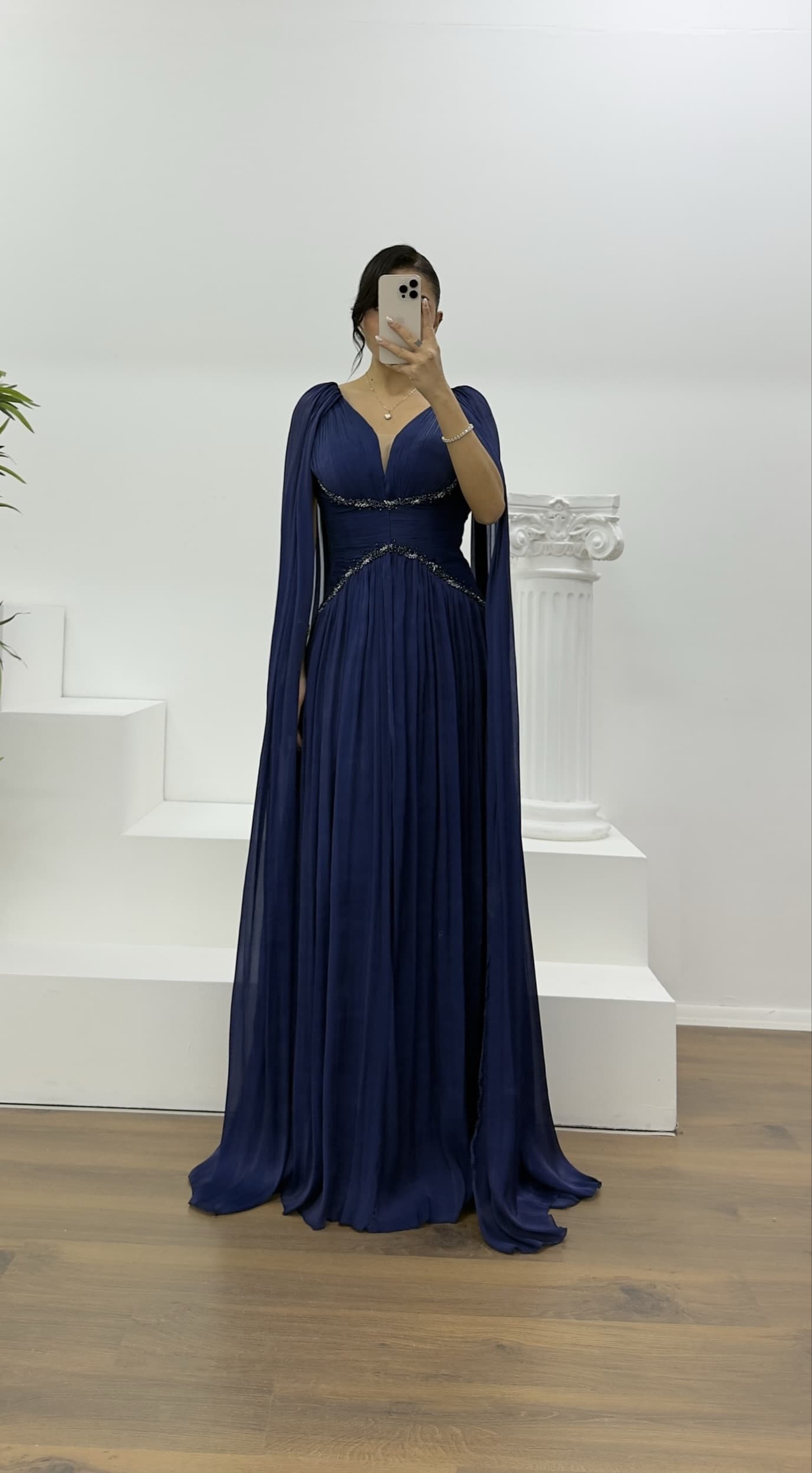• Lacivert Pelerinli Taş İşlemeli Kemer Formumlu Abiye Elbise