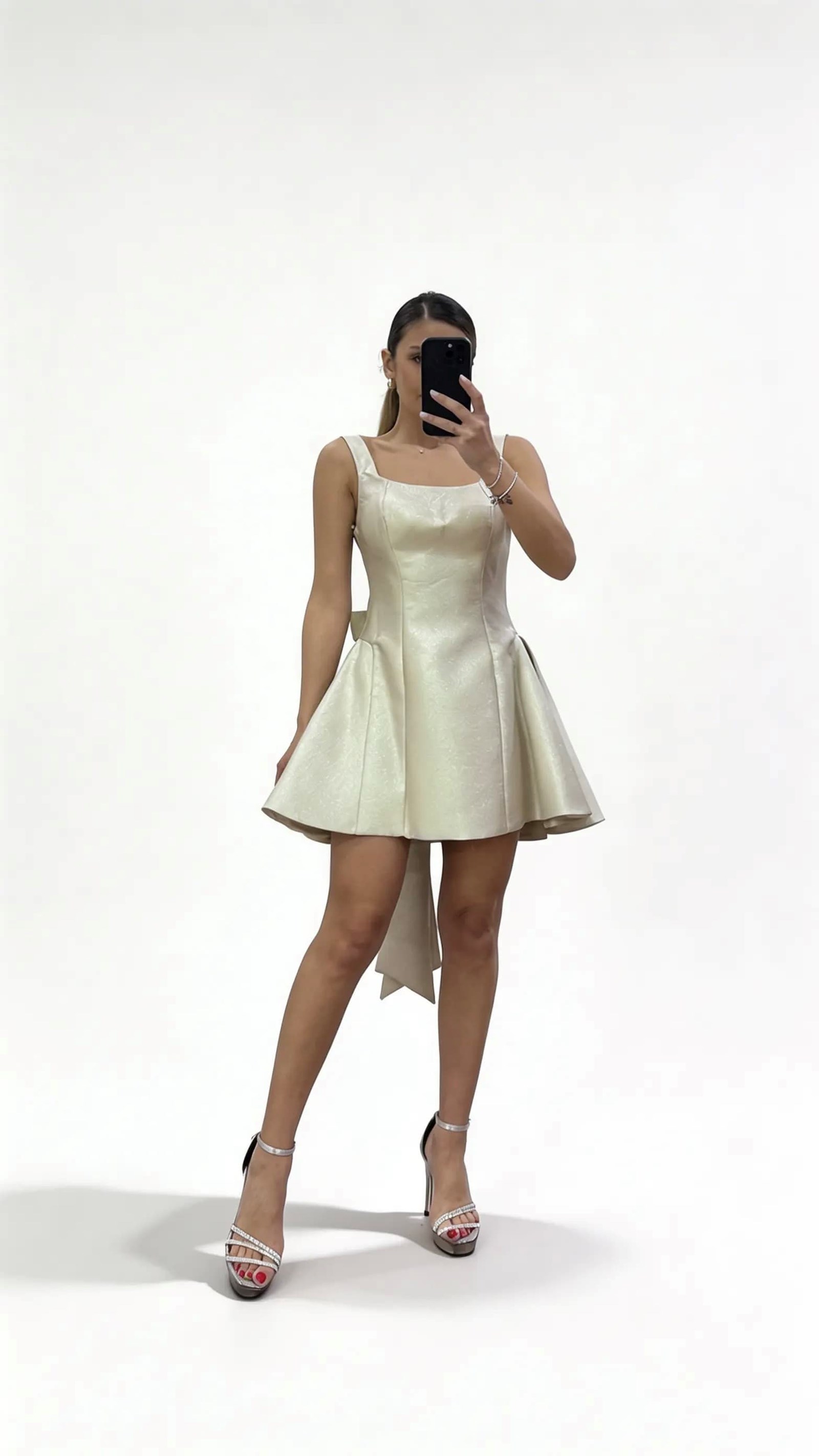 • Kemik Kalın Askılı Kare Yaka  A Kesim Kısa Abiye Elbise
