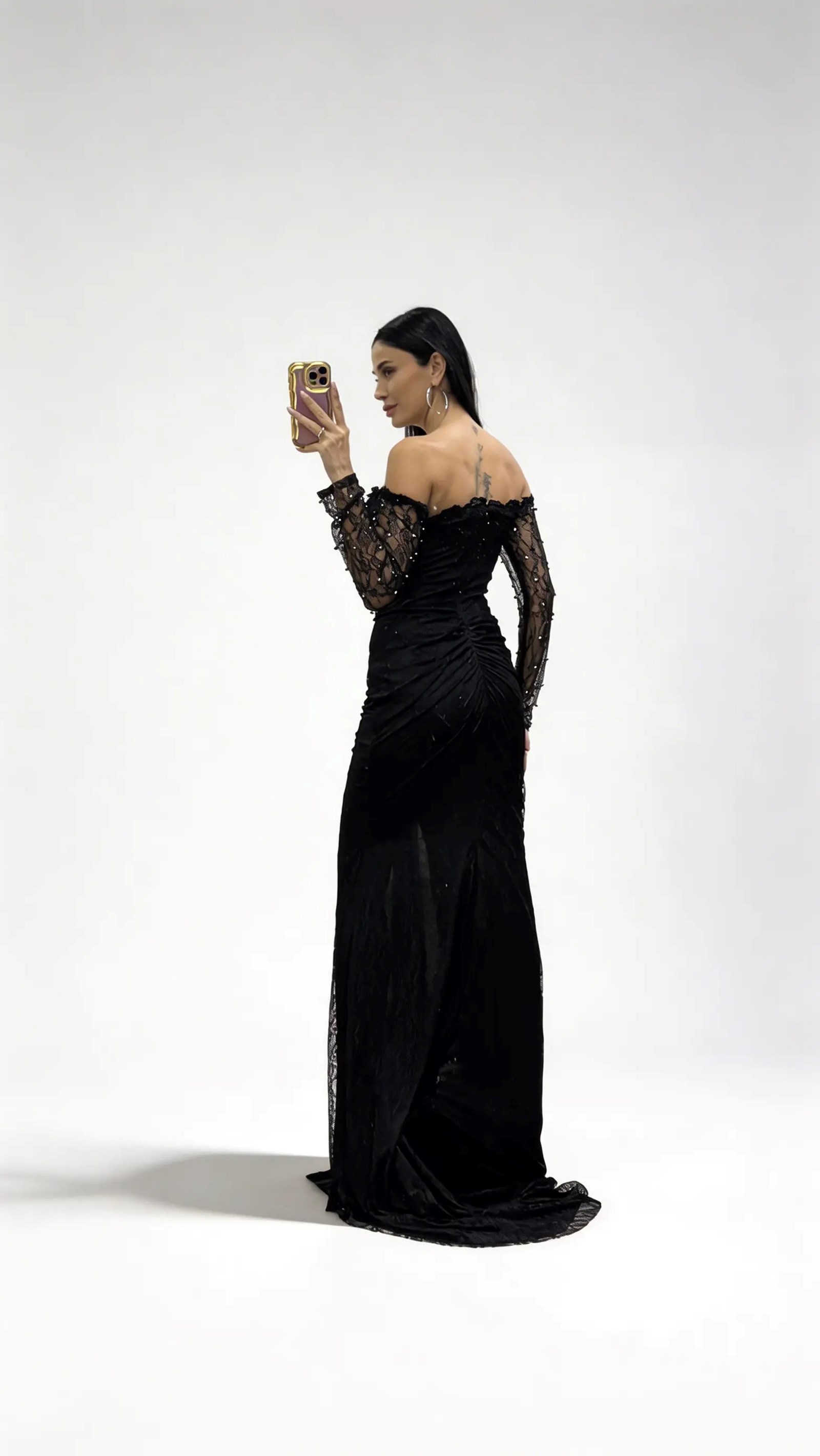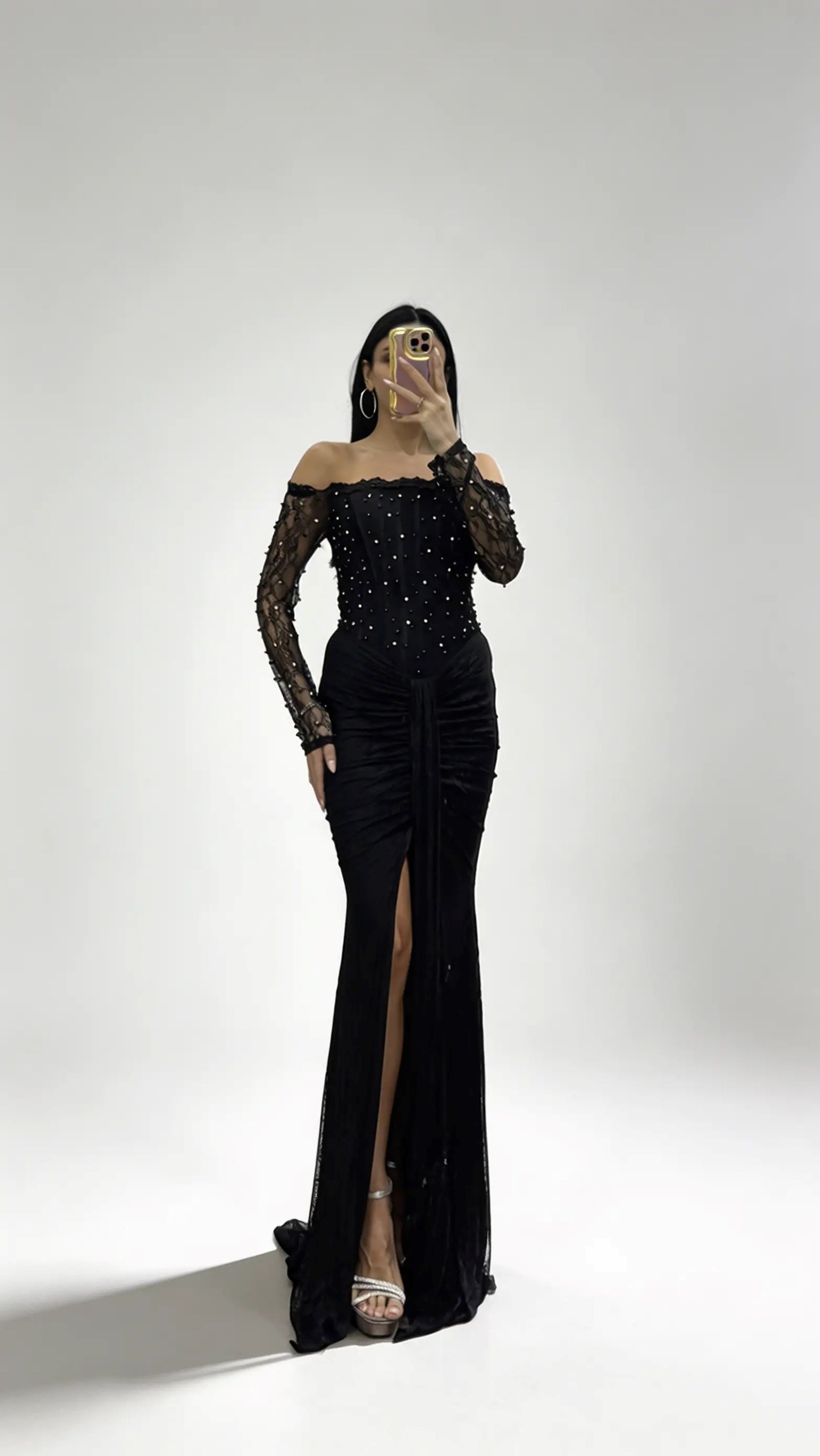 • Siyah İnci İşlemeli Kayık Yaka Drapeli Uzun Dantel Abiye Elbise