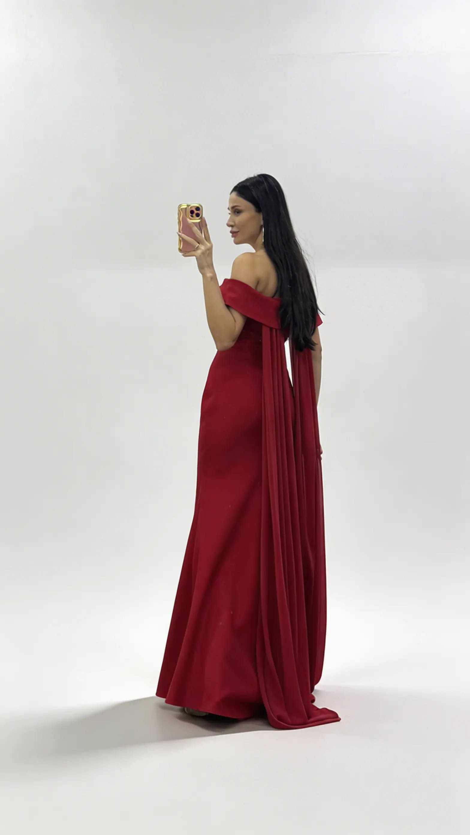 • Kırmızı Pelerinli Düşük Omuz  Volanlı Abiye Elbise