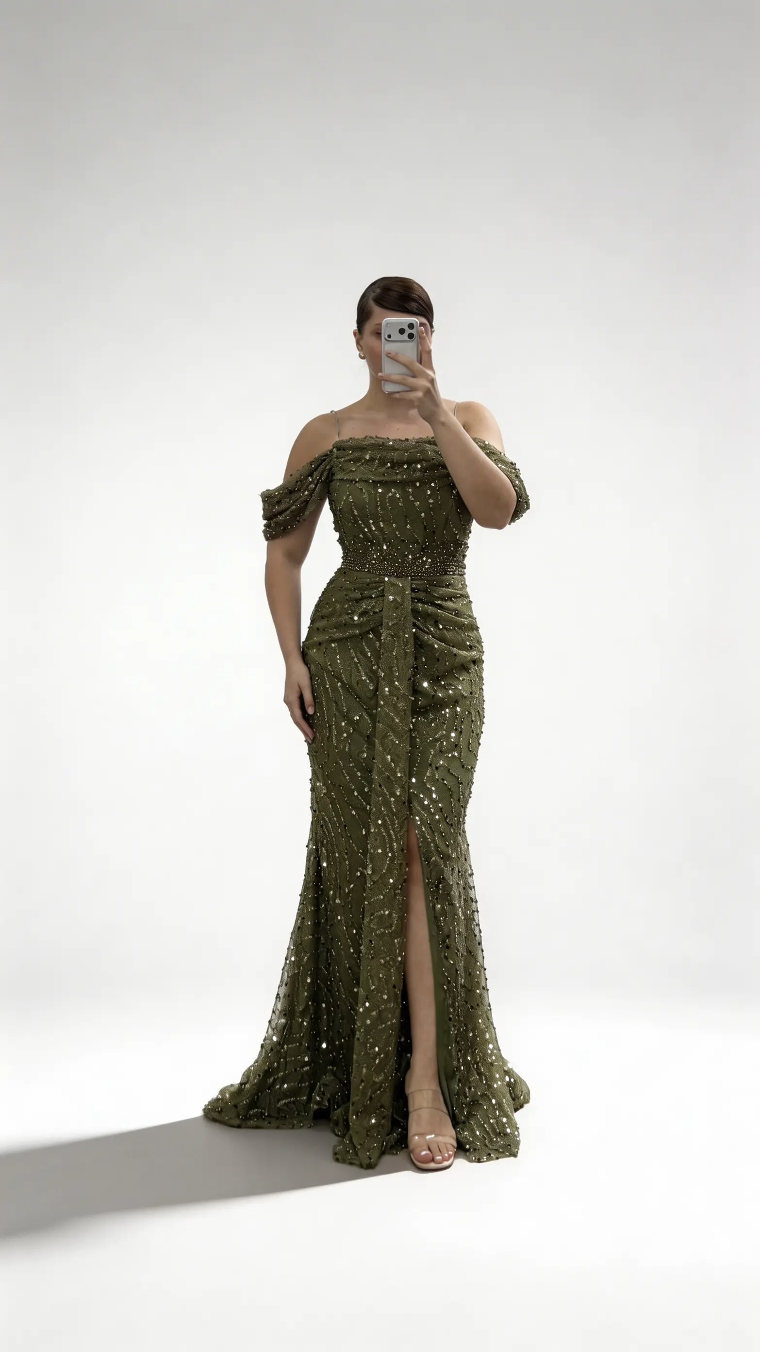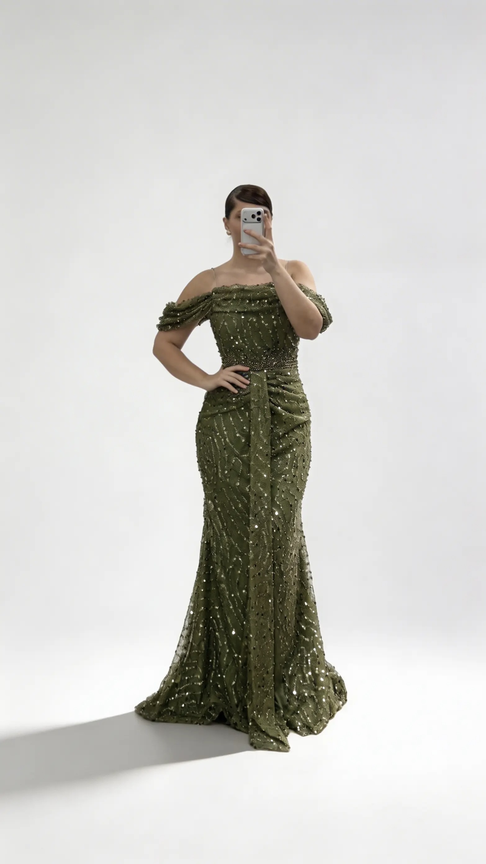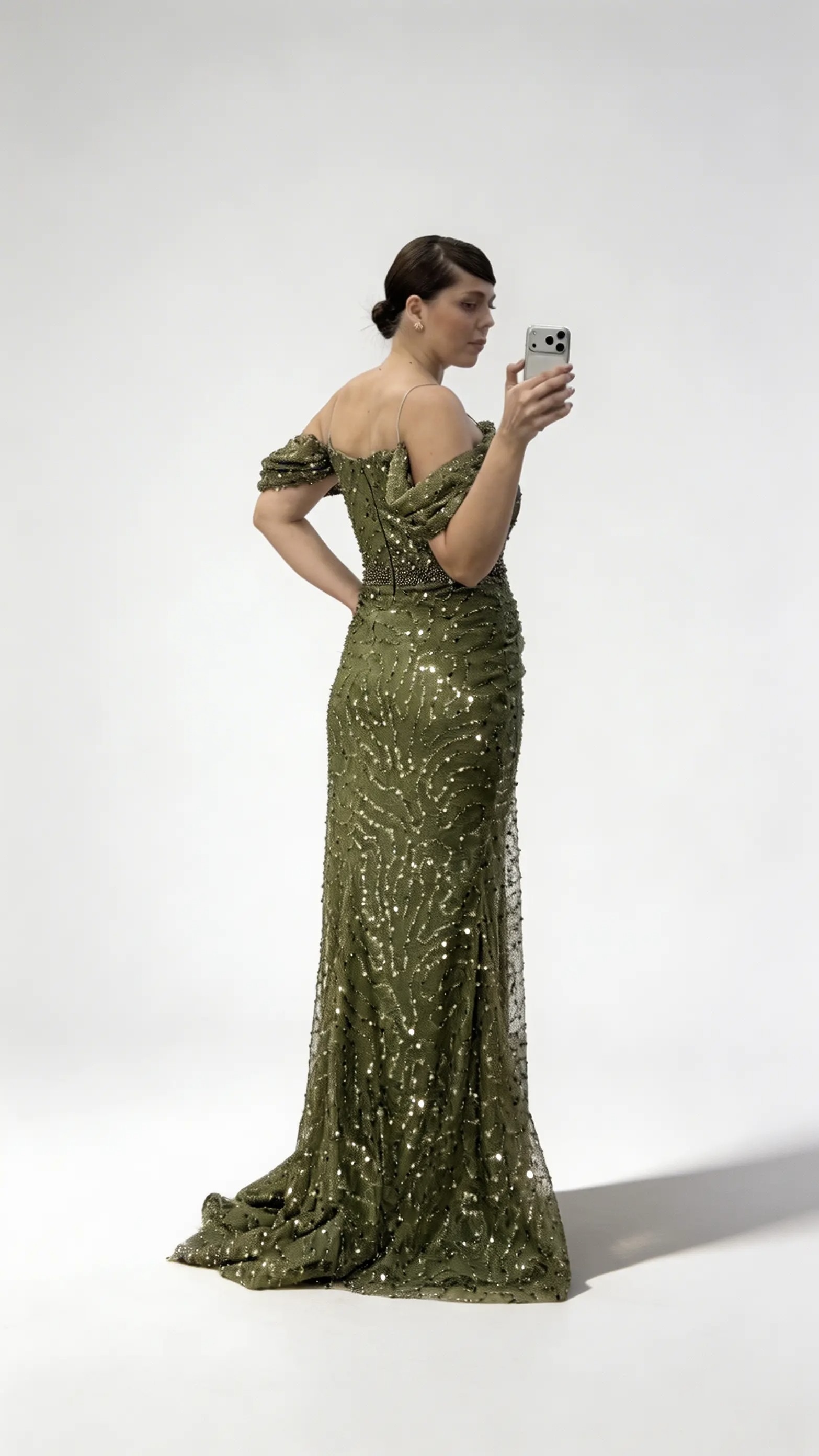 • Haki Drapeli Göğüs Yandan Dökümlü Kol Pul Payet Büyük Beden Abiye Elbise