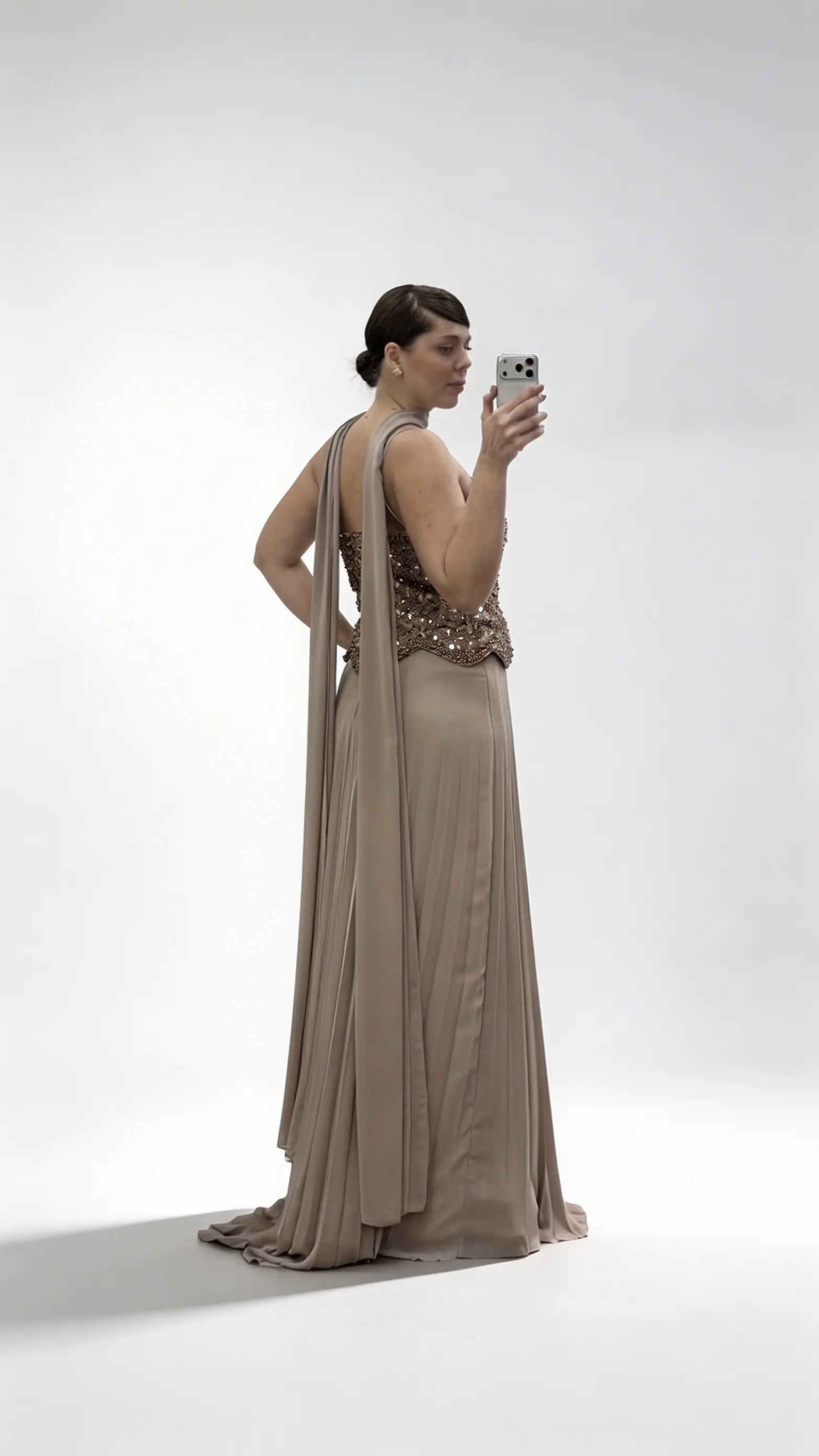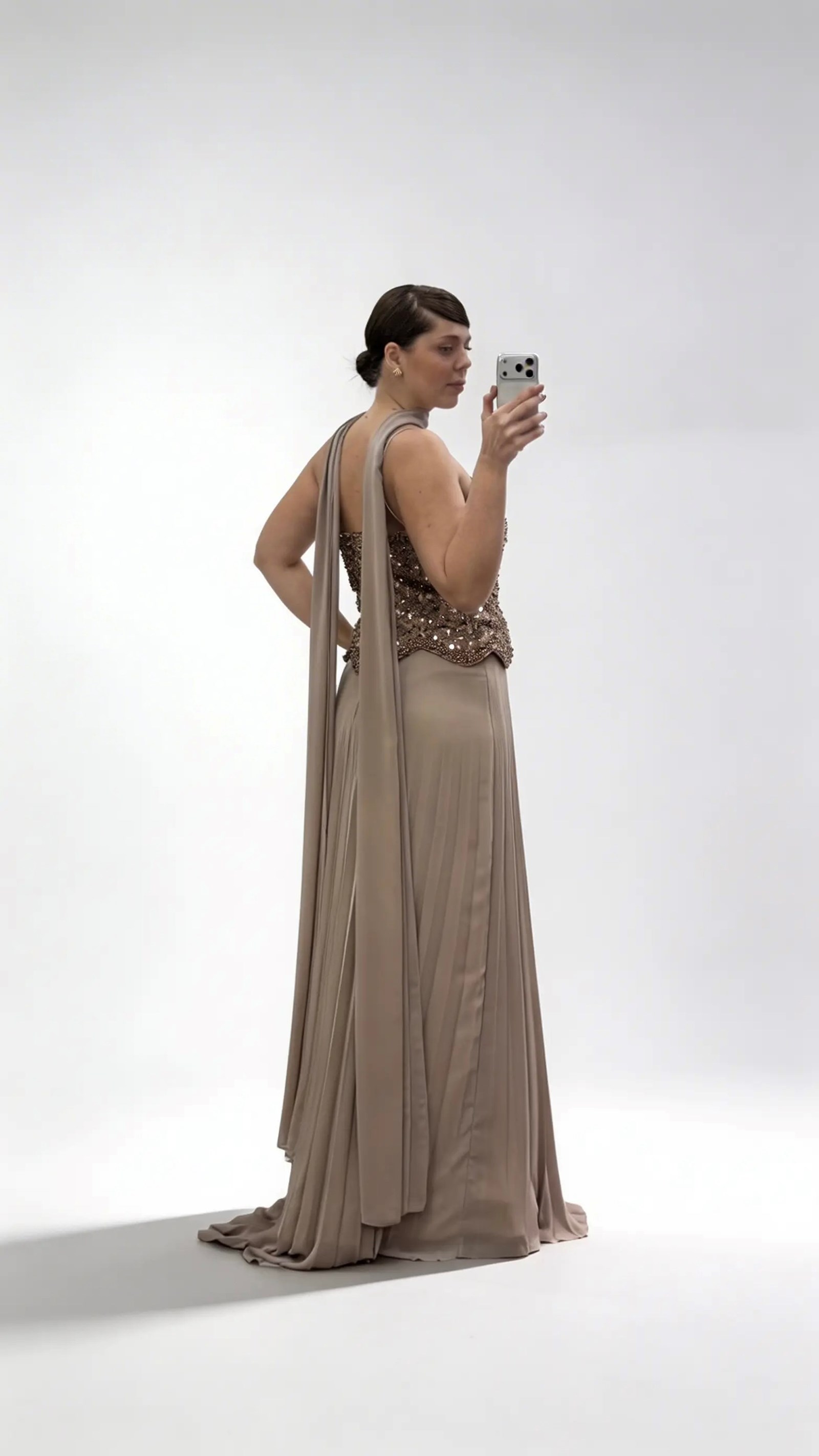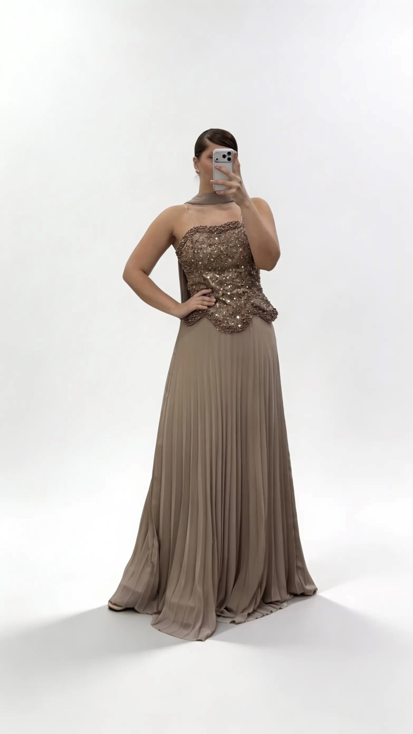 Langes Abendkleid in Übergröße aus braunem Chiffon mit Herzausschnitt und Perlenbesatz