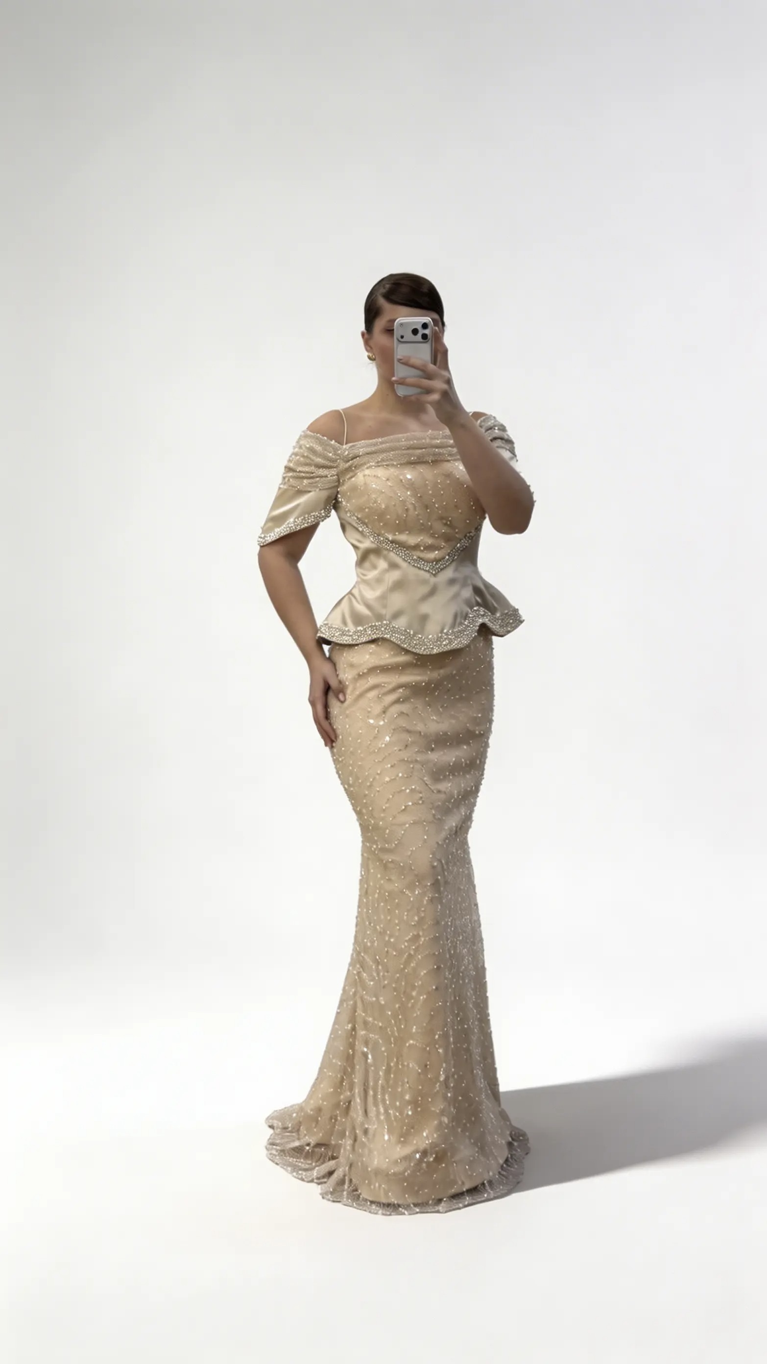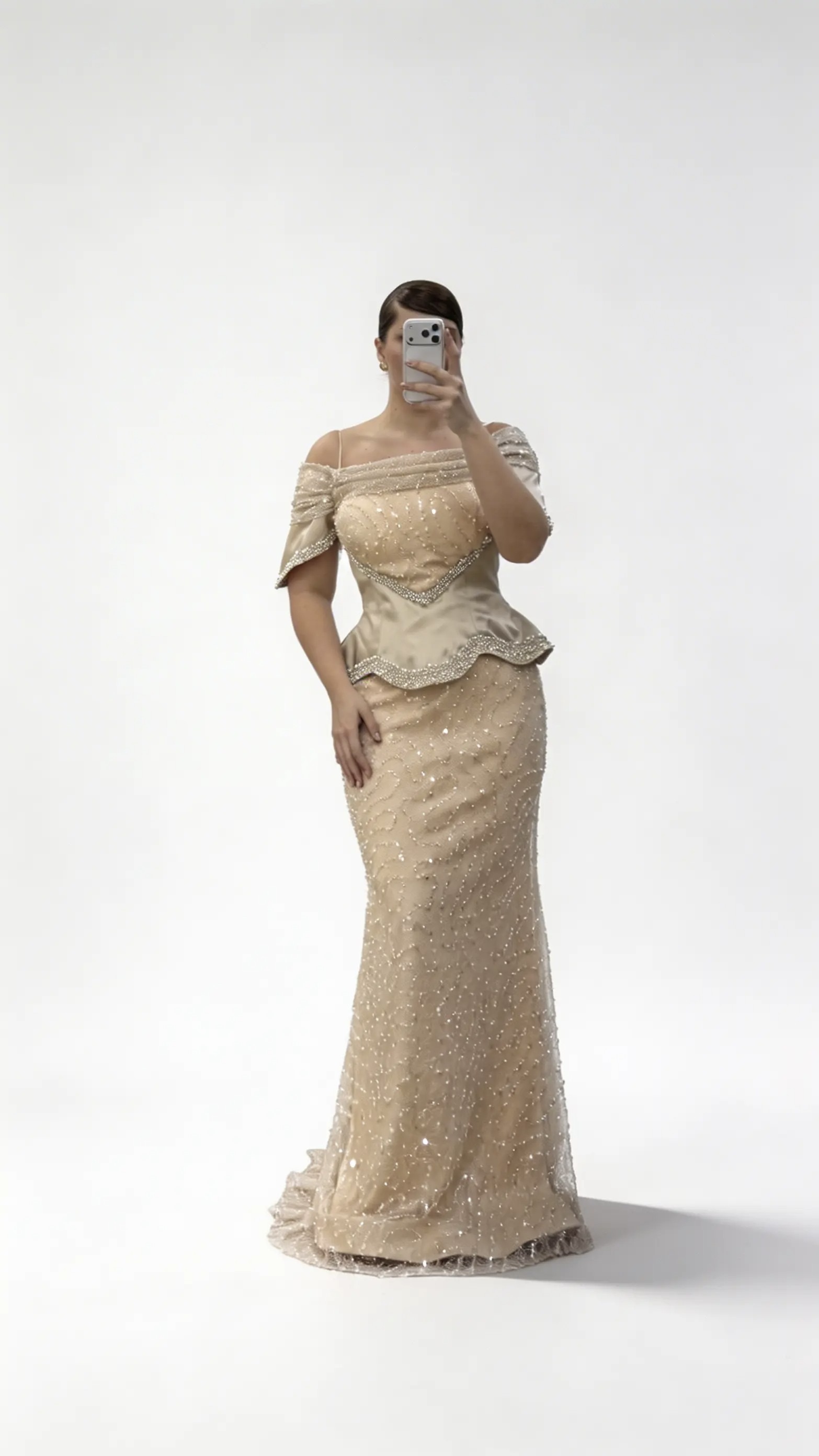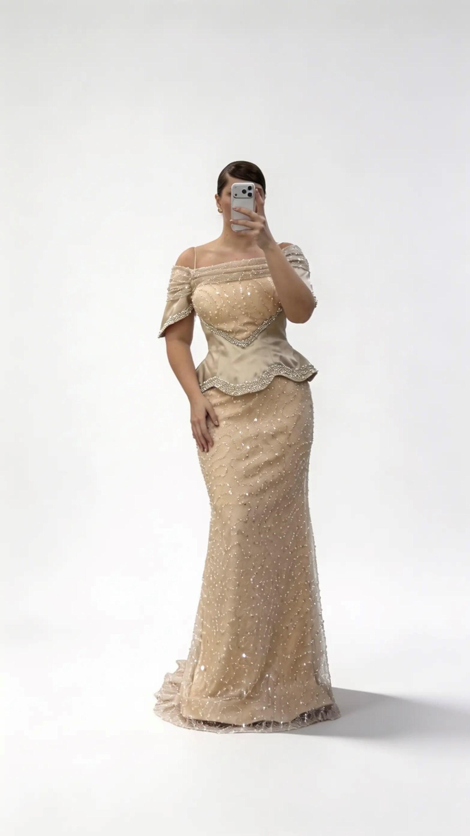 • Gold Düşük Omuz Şerit Katmanlı Korse Form Payetli Büyük Beden Abiye Elbise