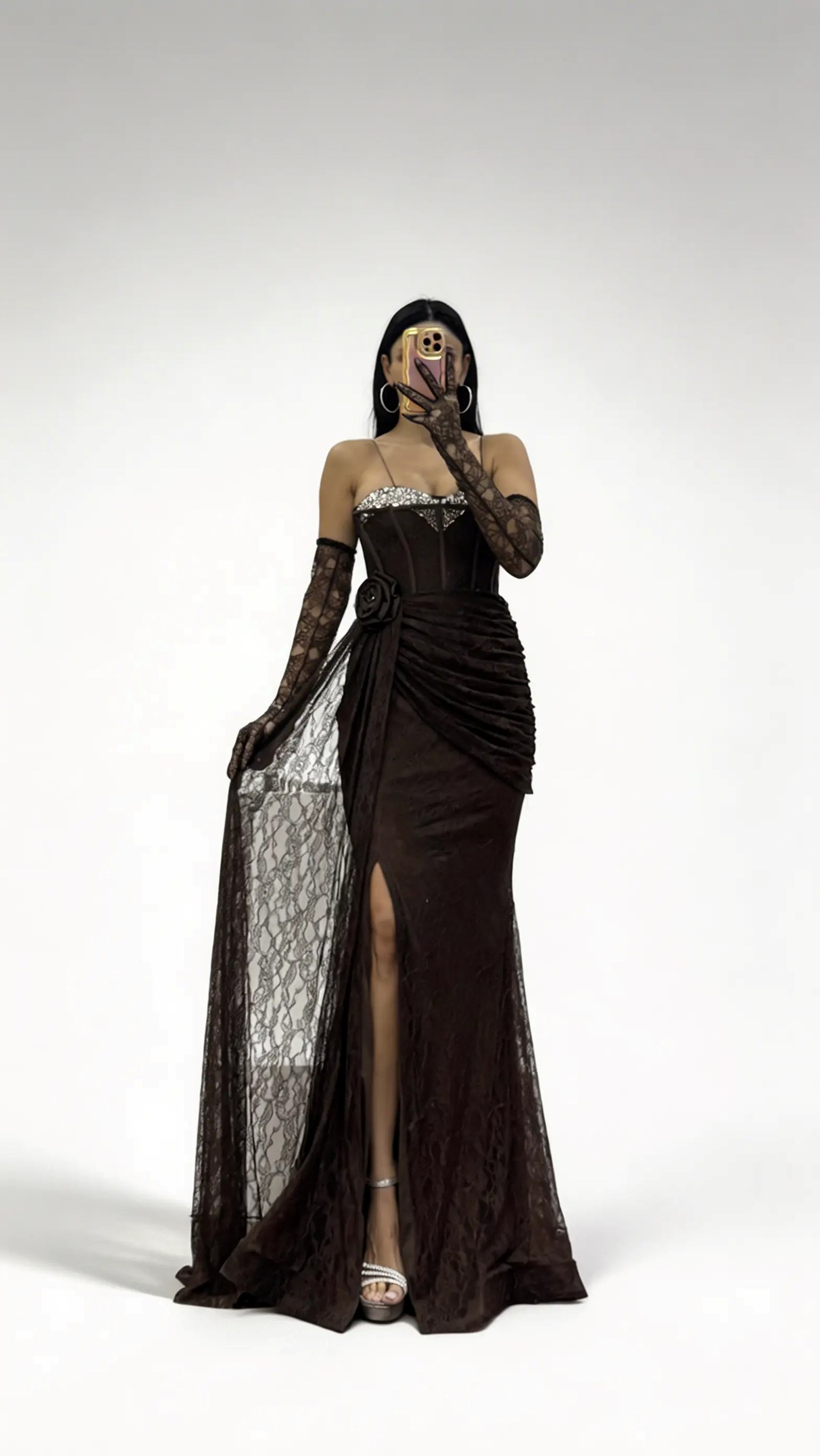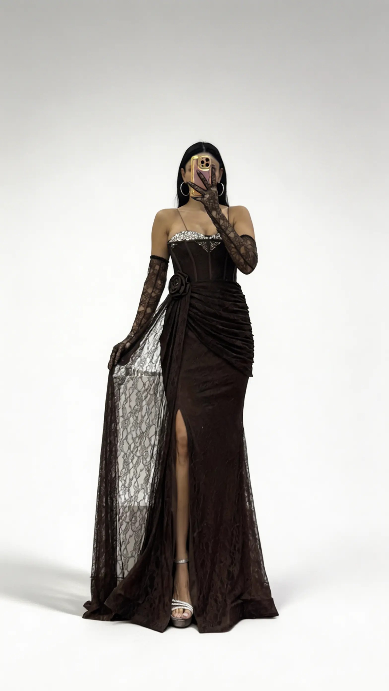 • Kahverengi Gül Detaylı  Drapeli Dantel Formlu Abiye Elbise