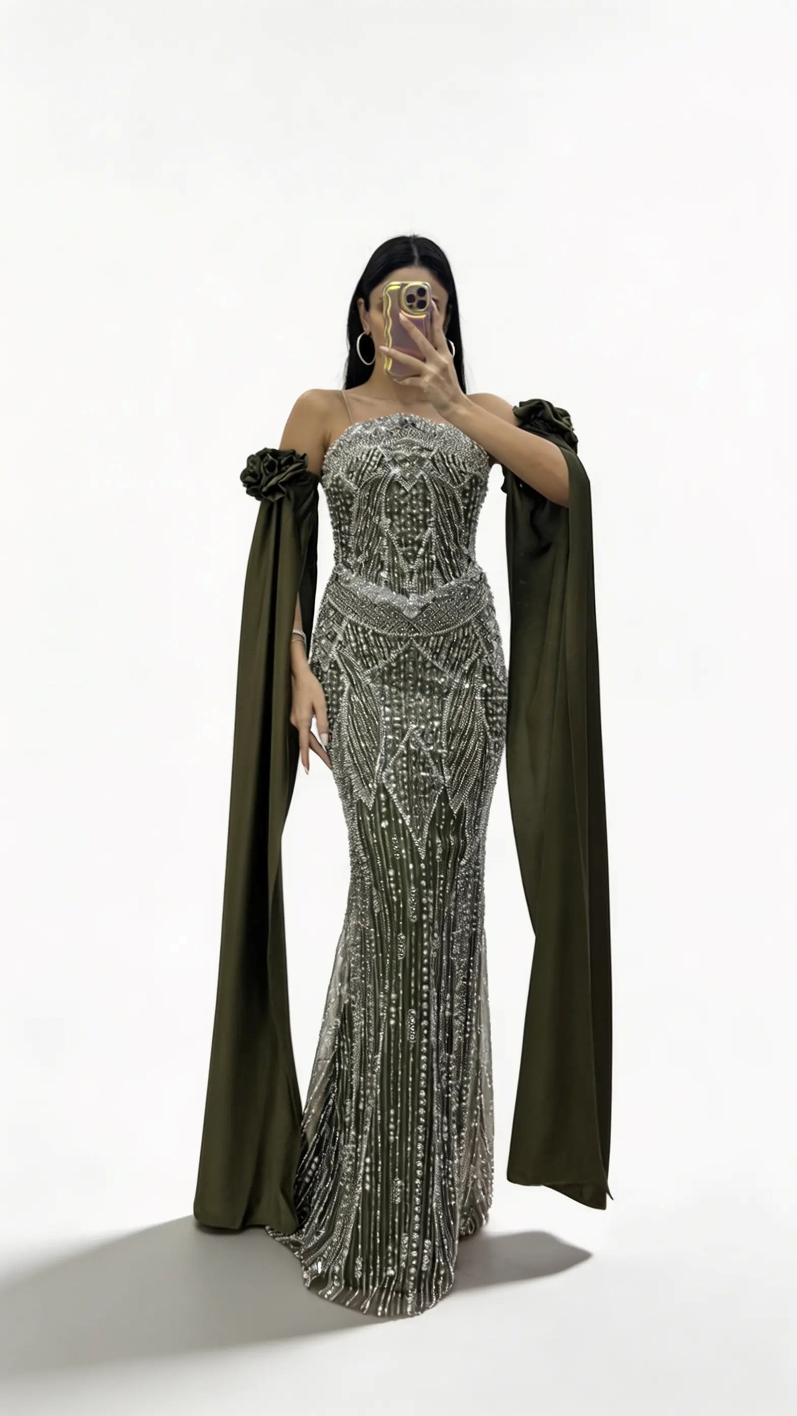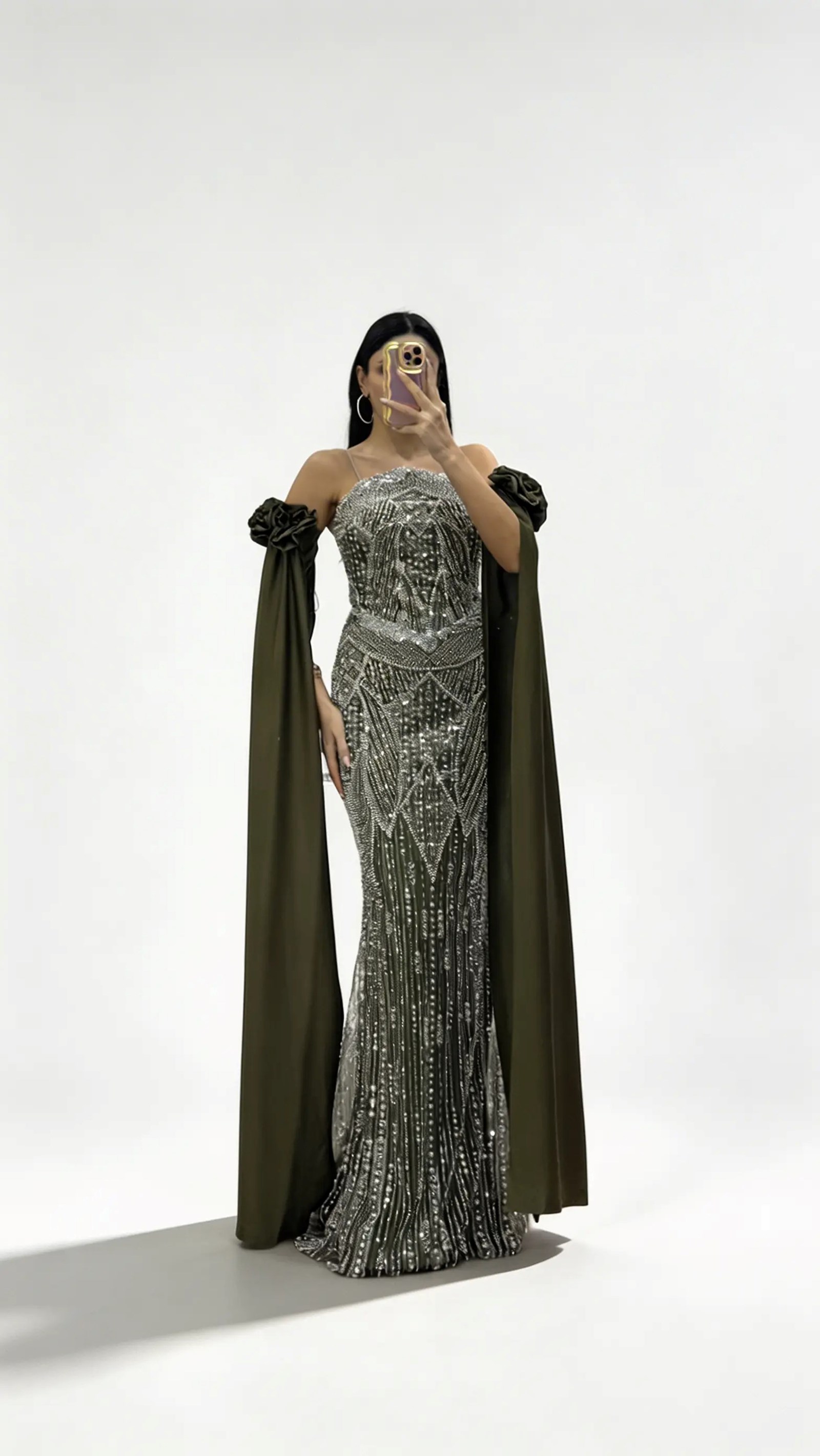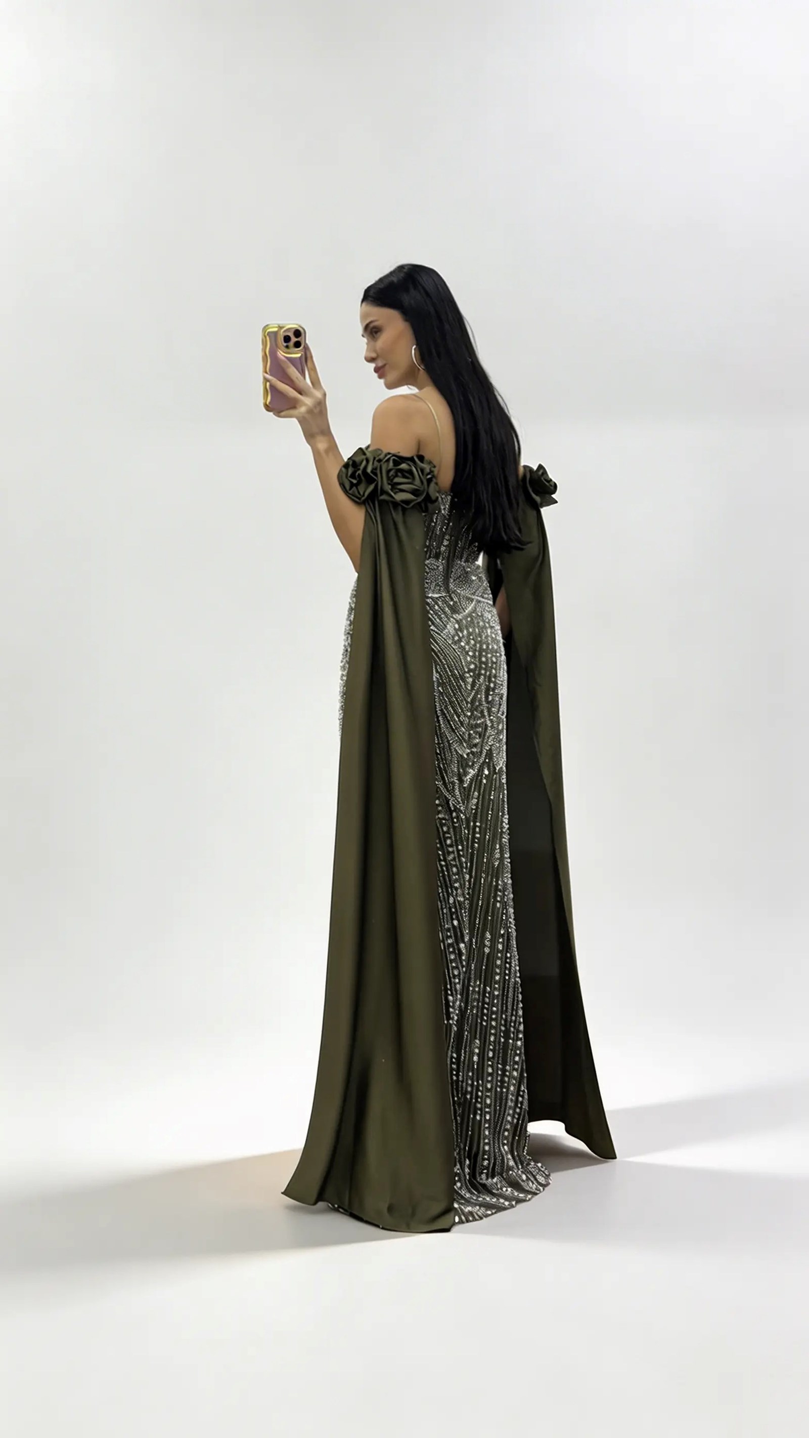 • Haki Drapeli Gül Detaylı Kolları  Taş İşlemeli Abiye Elbise