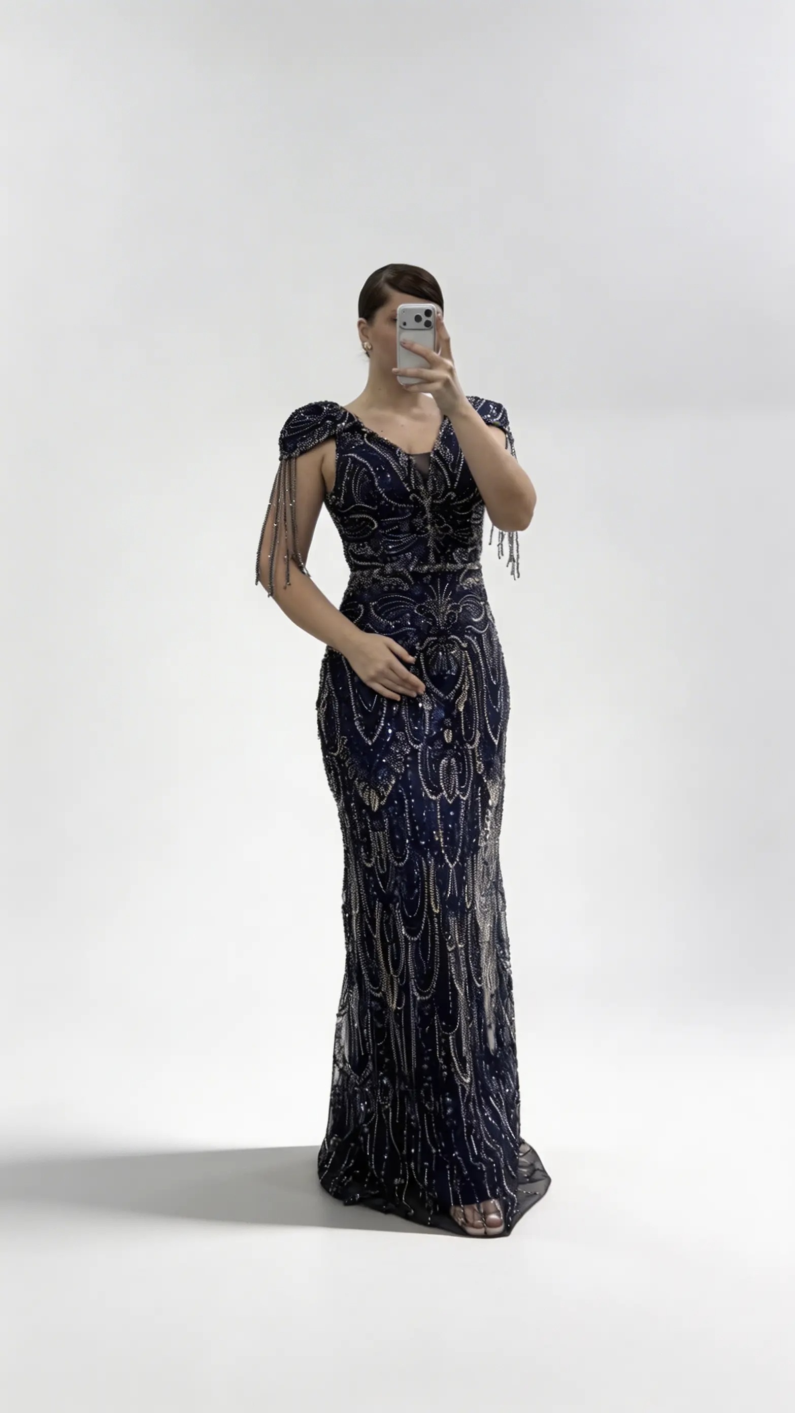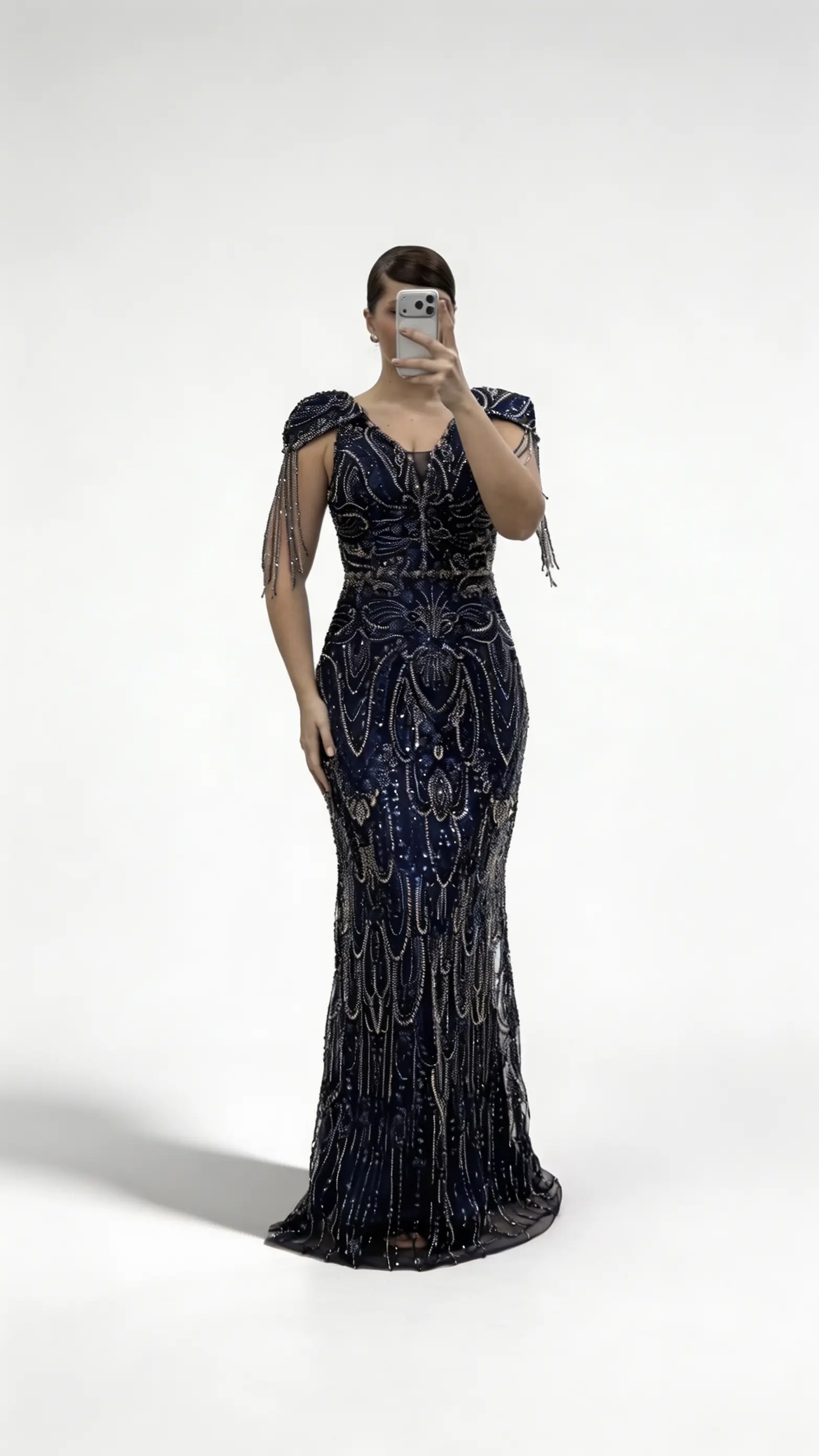 Marineblaues Abendkleid mit V Ausschnitt und Kettenquasten Detail
