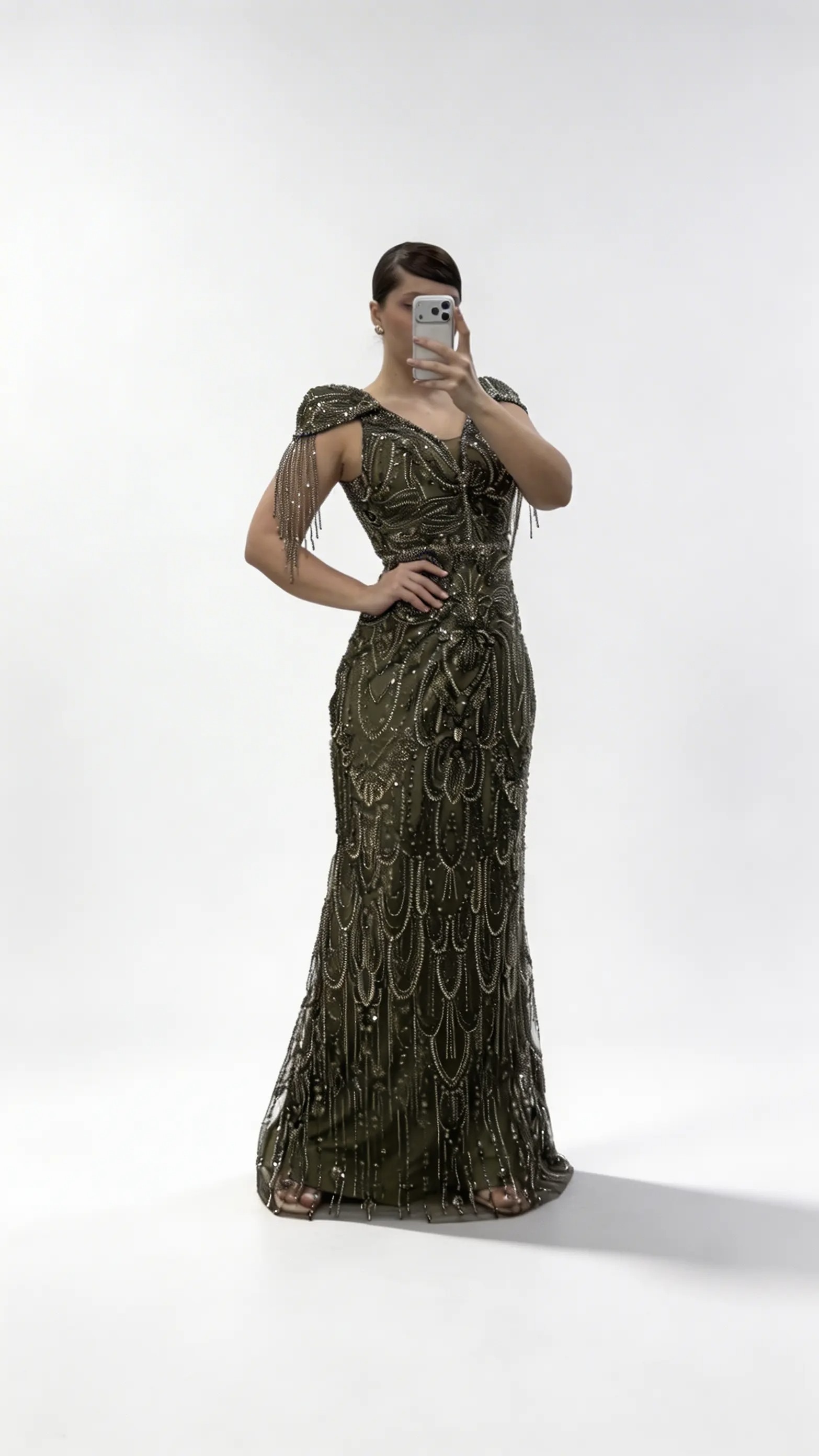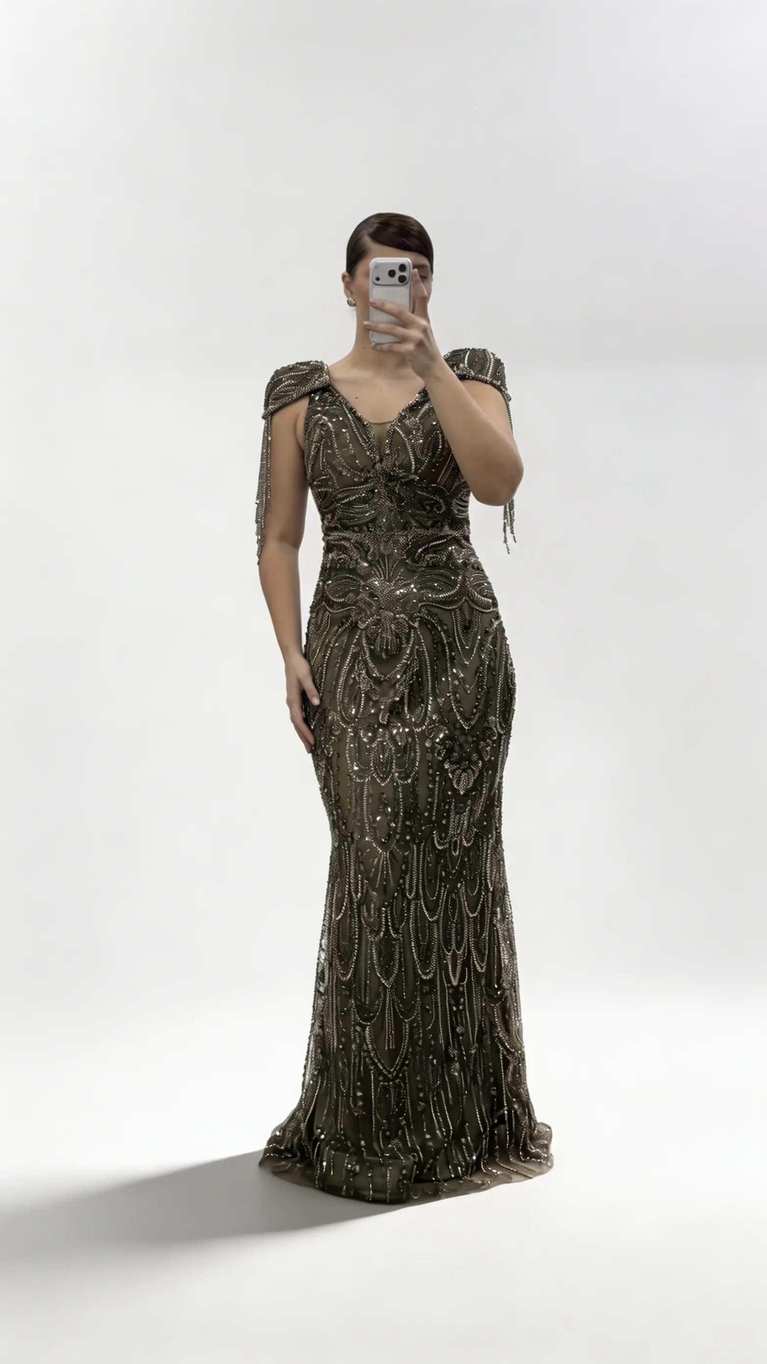 Khakifarbenes Abendkleid mit V Ausschnitt  Ketten  und Quastenverzierungen