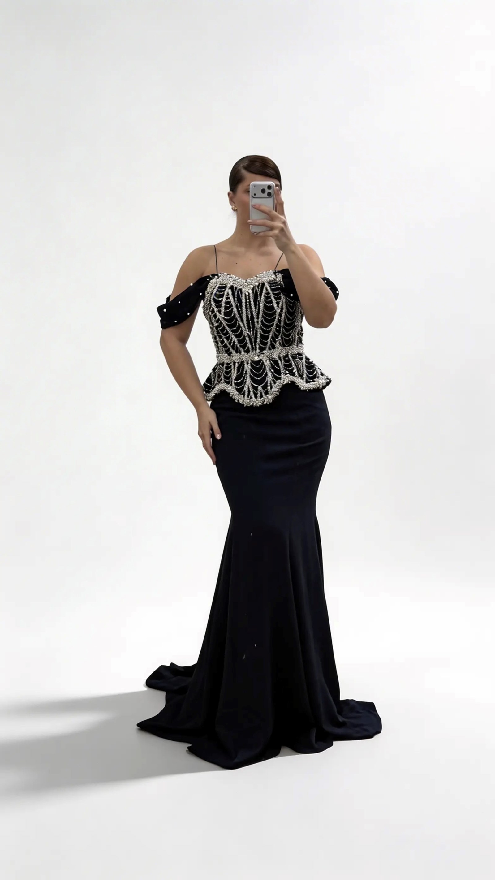 • Siyah Düşük Kol İnci Detaylı Peplum Kesim Büyük Beden Abiye Elbise