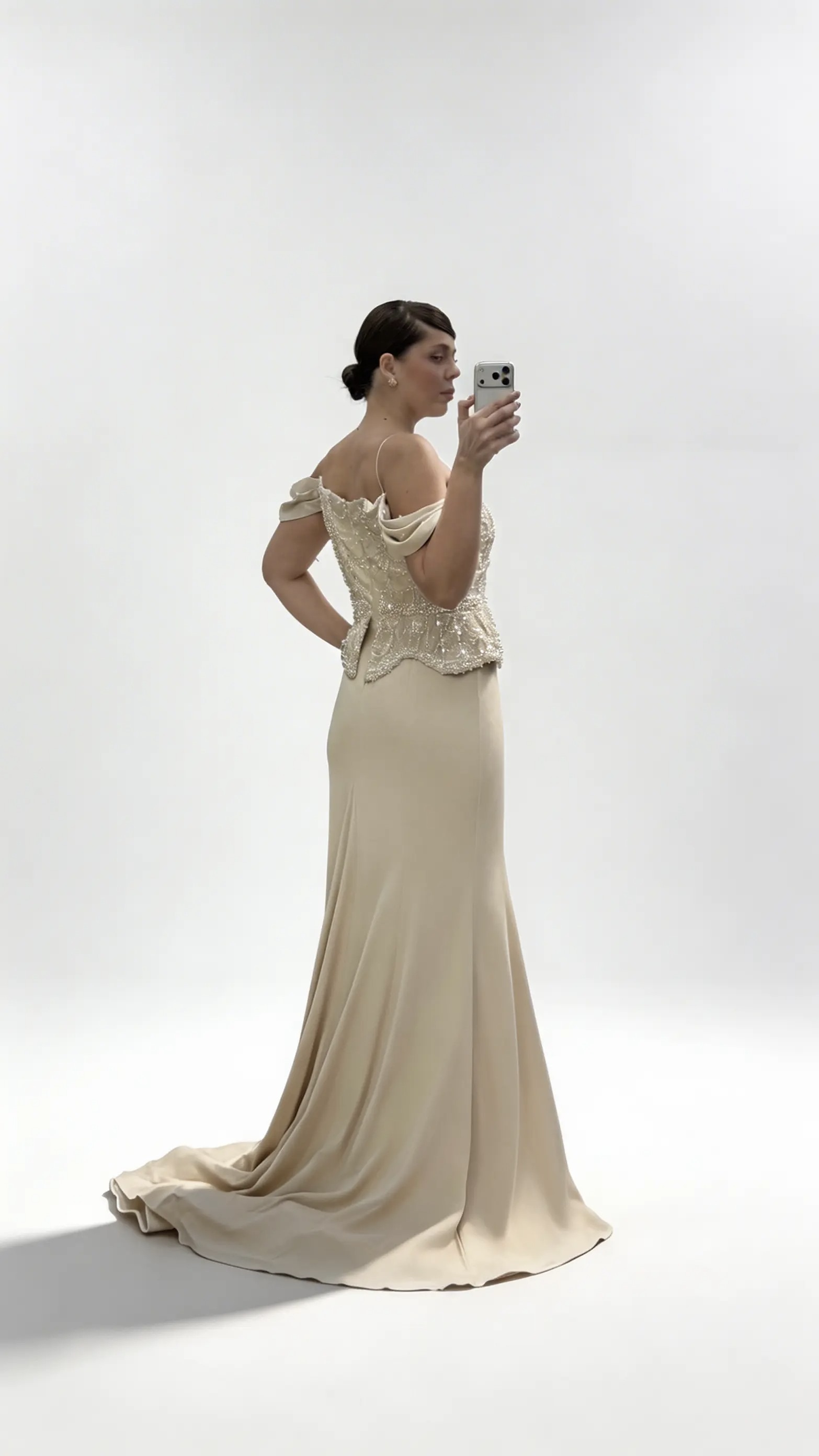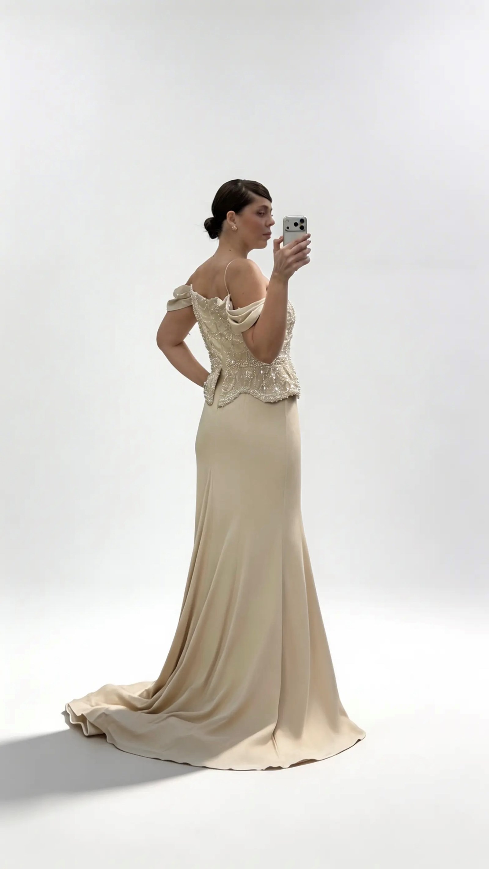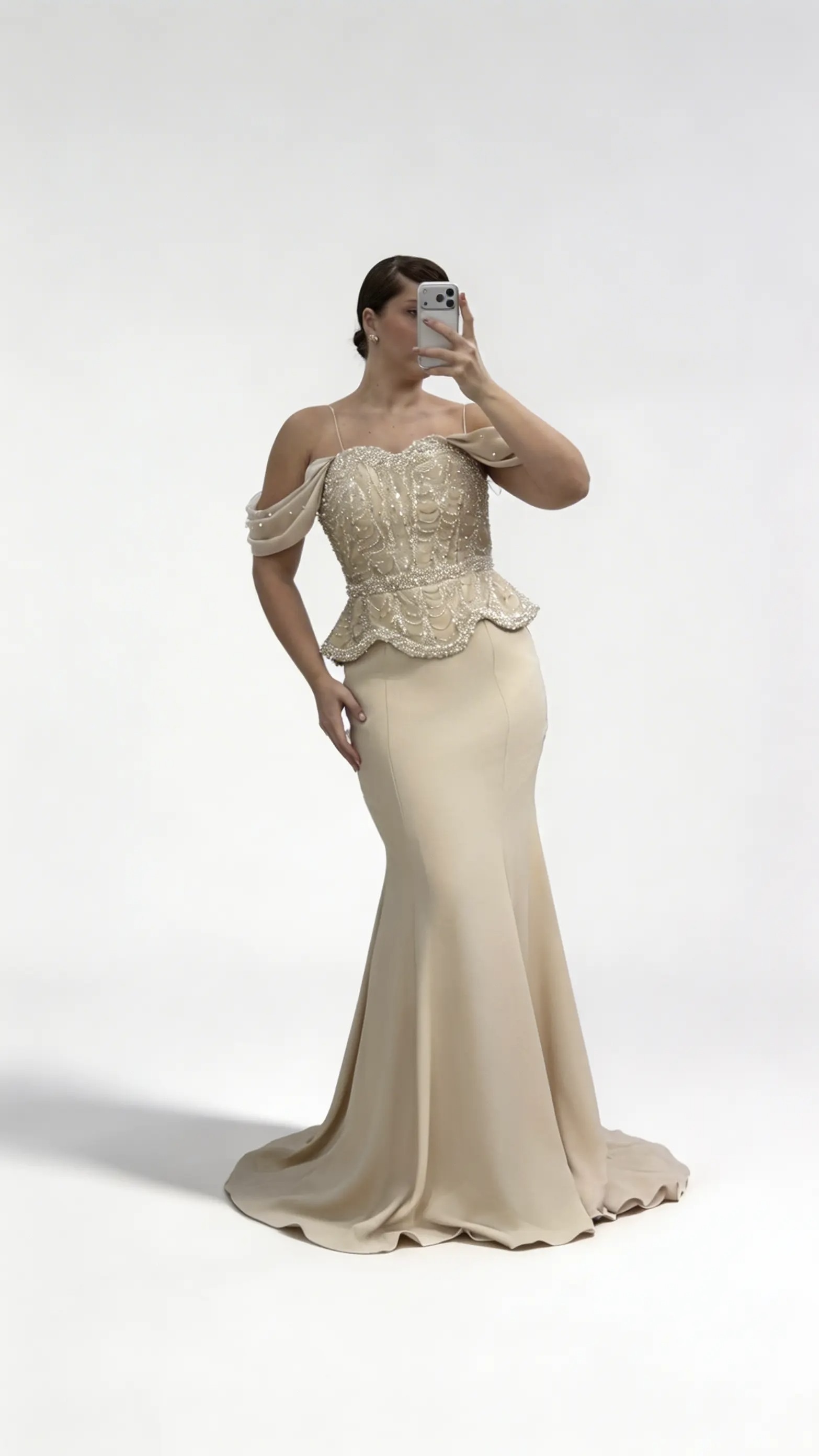 Goldfarbenes Abendkleid in Übergröße mit überschnittenen Ärmeln  Perlenbesatz und Schößchen