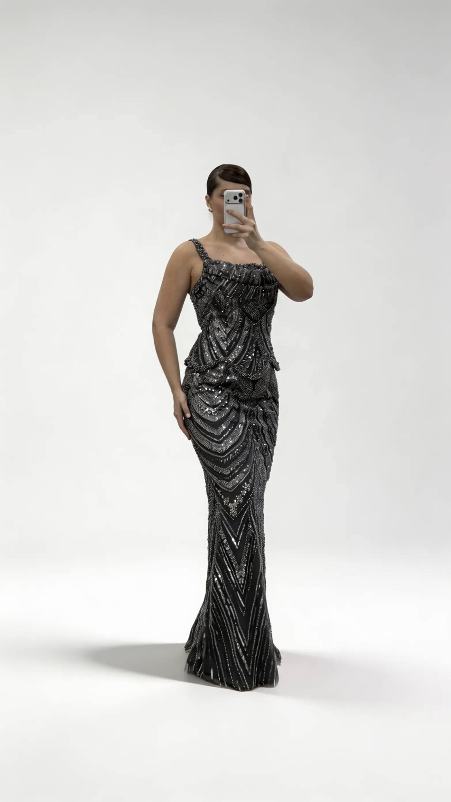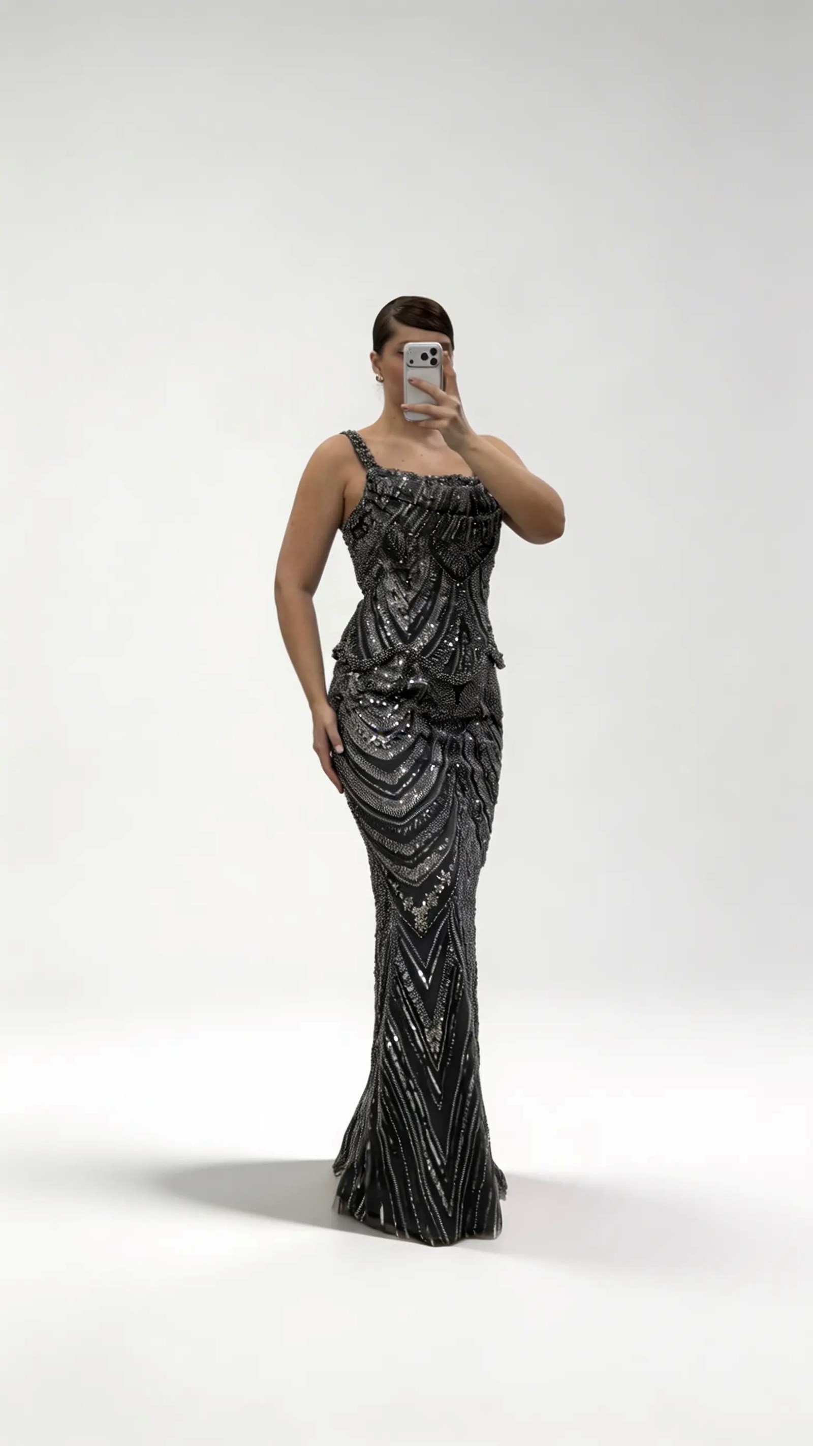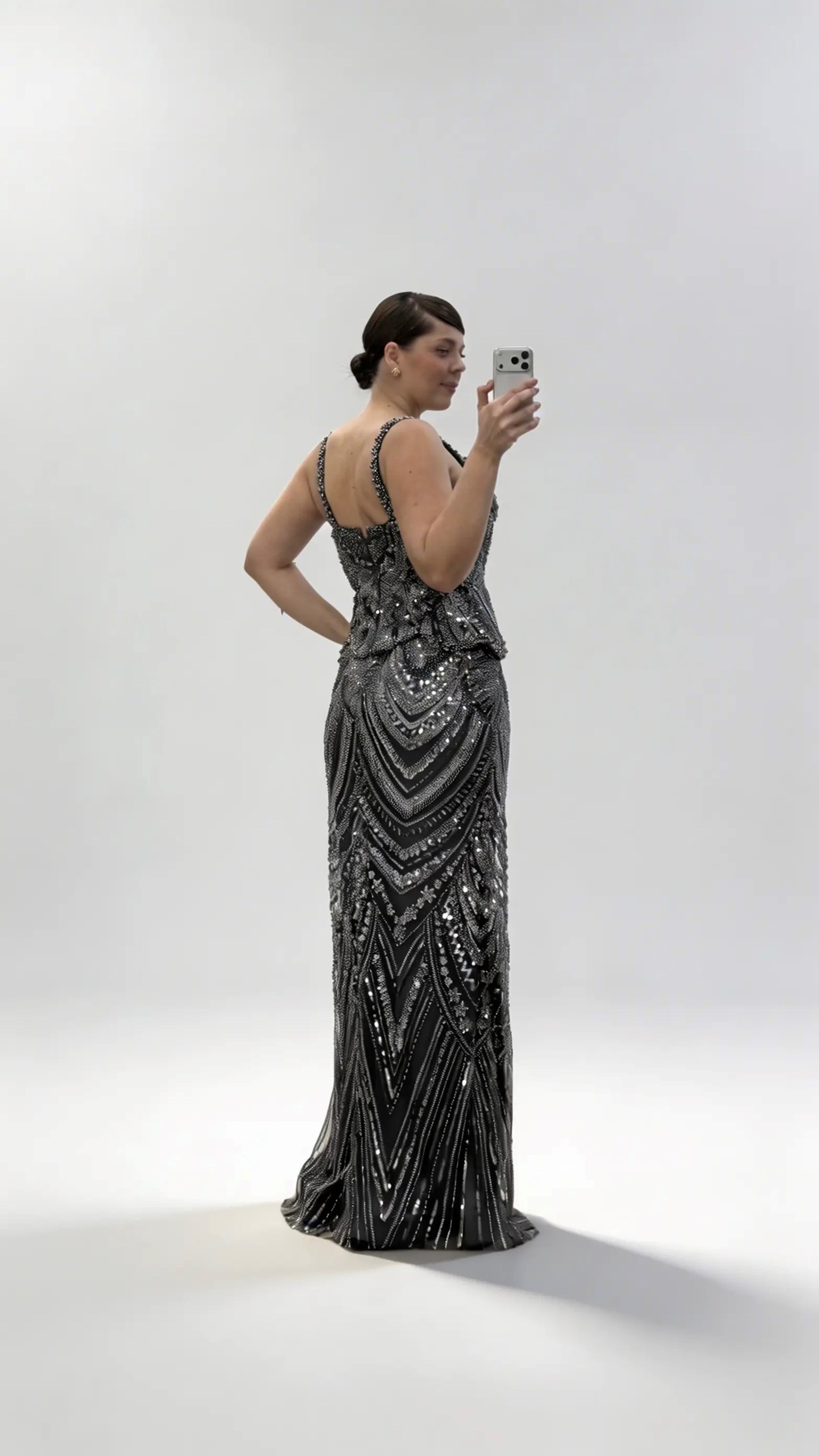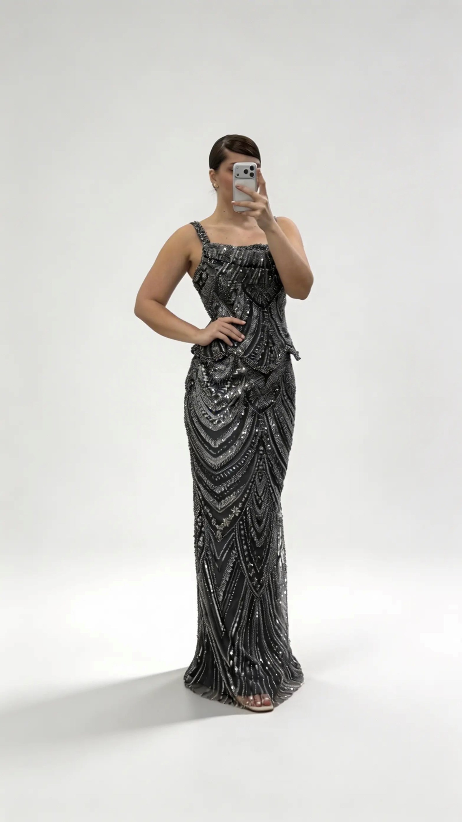Anthrazitfarbenes Abendkleid in Übergröße mit wellenförmigem Schößchen und breiten Trägern