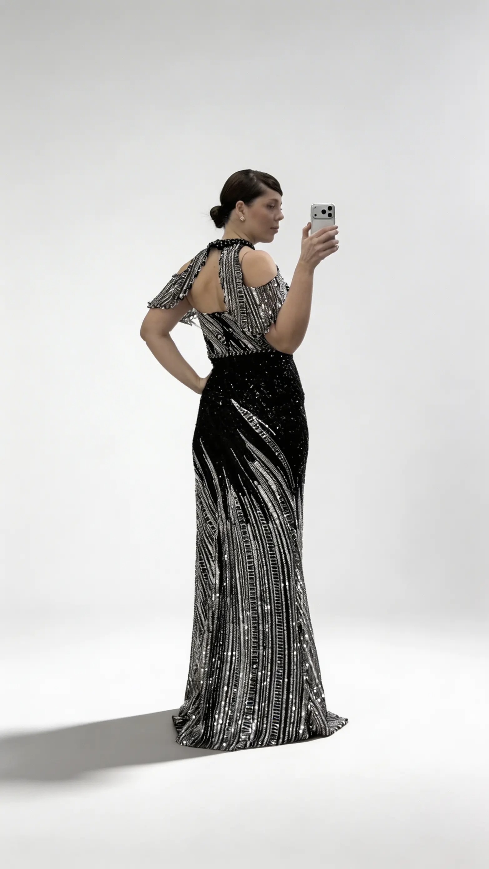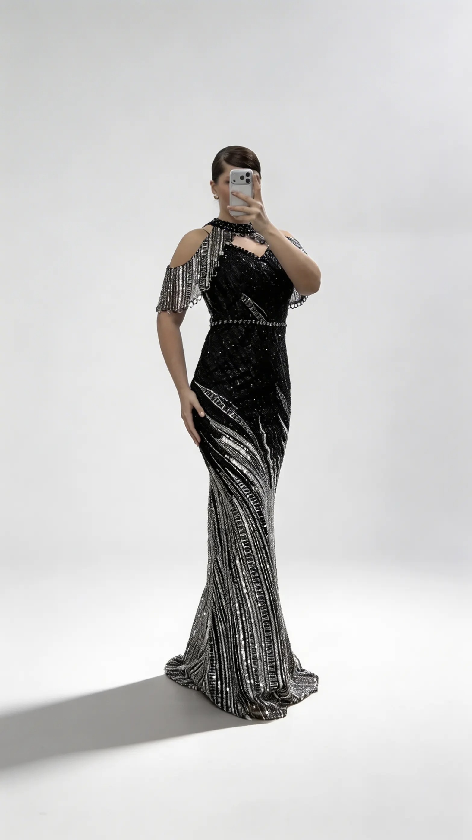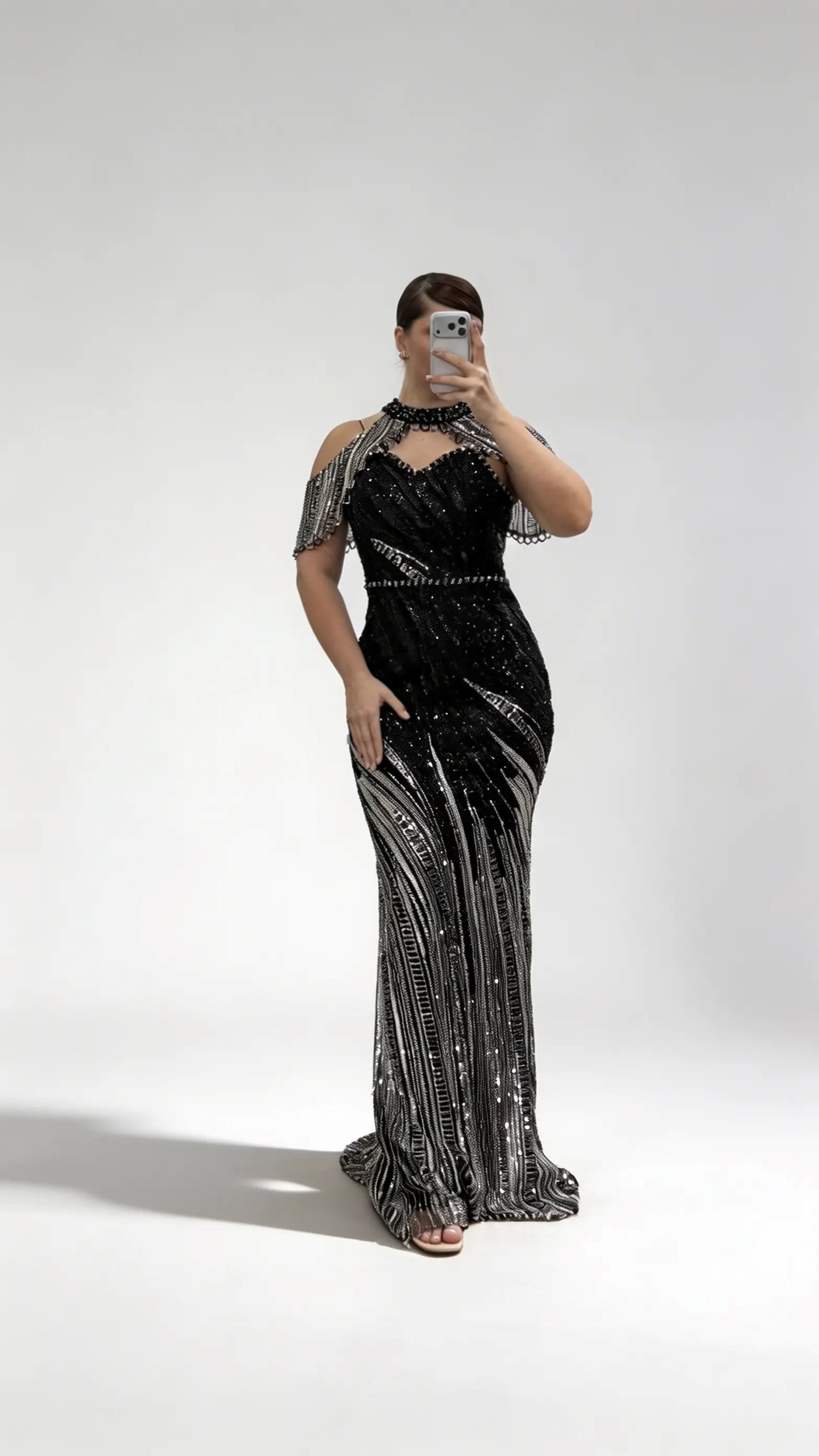 • Siyah Halter Yaka Şal Detaylı Pul Payet Büyük Beden Abiye Elbise