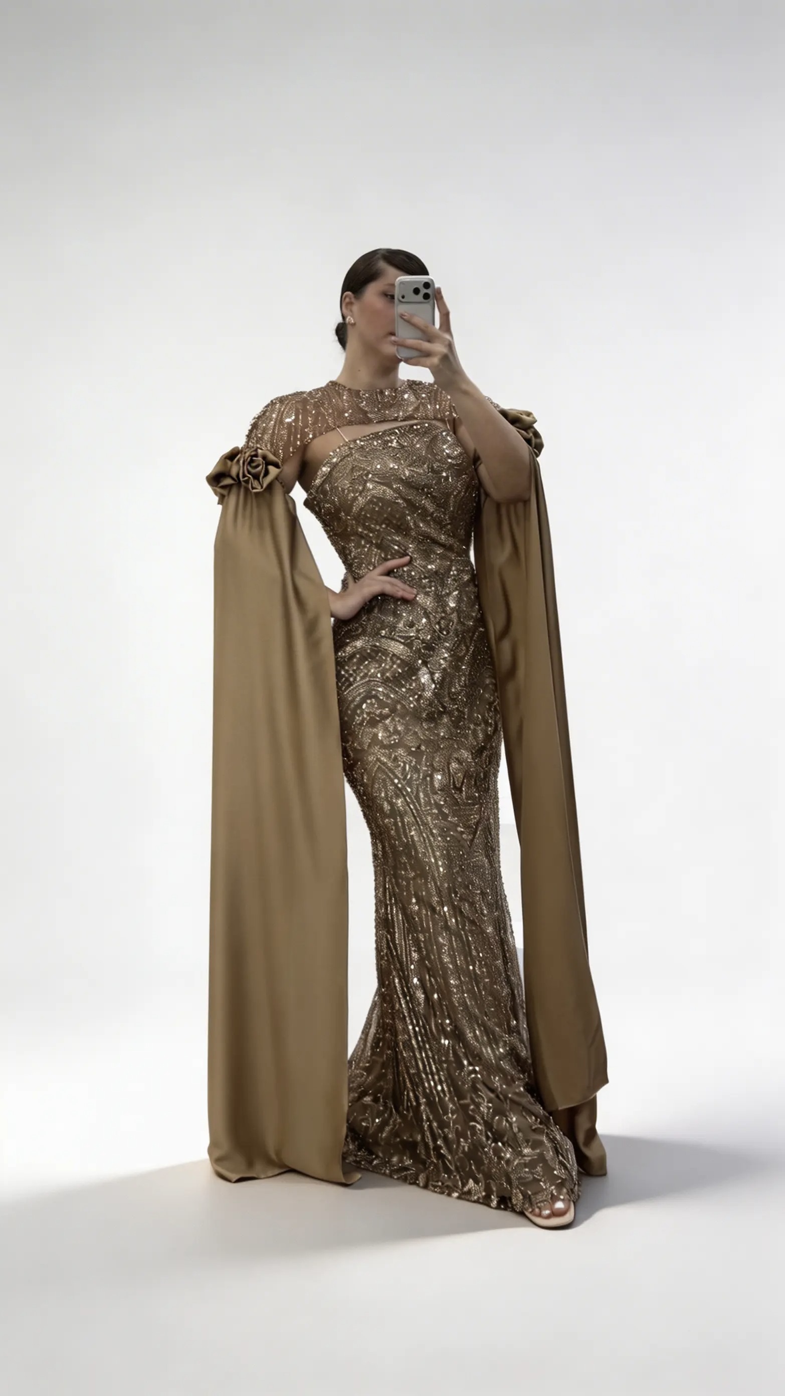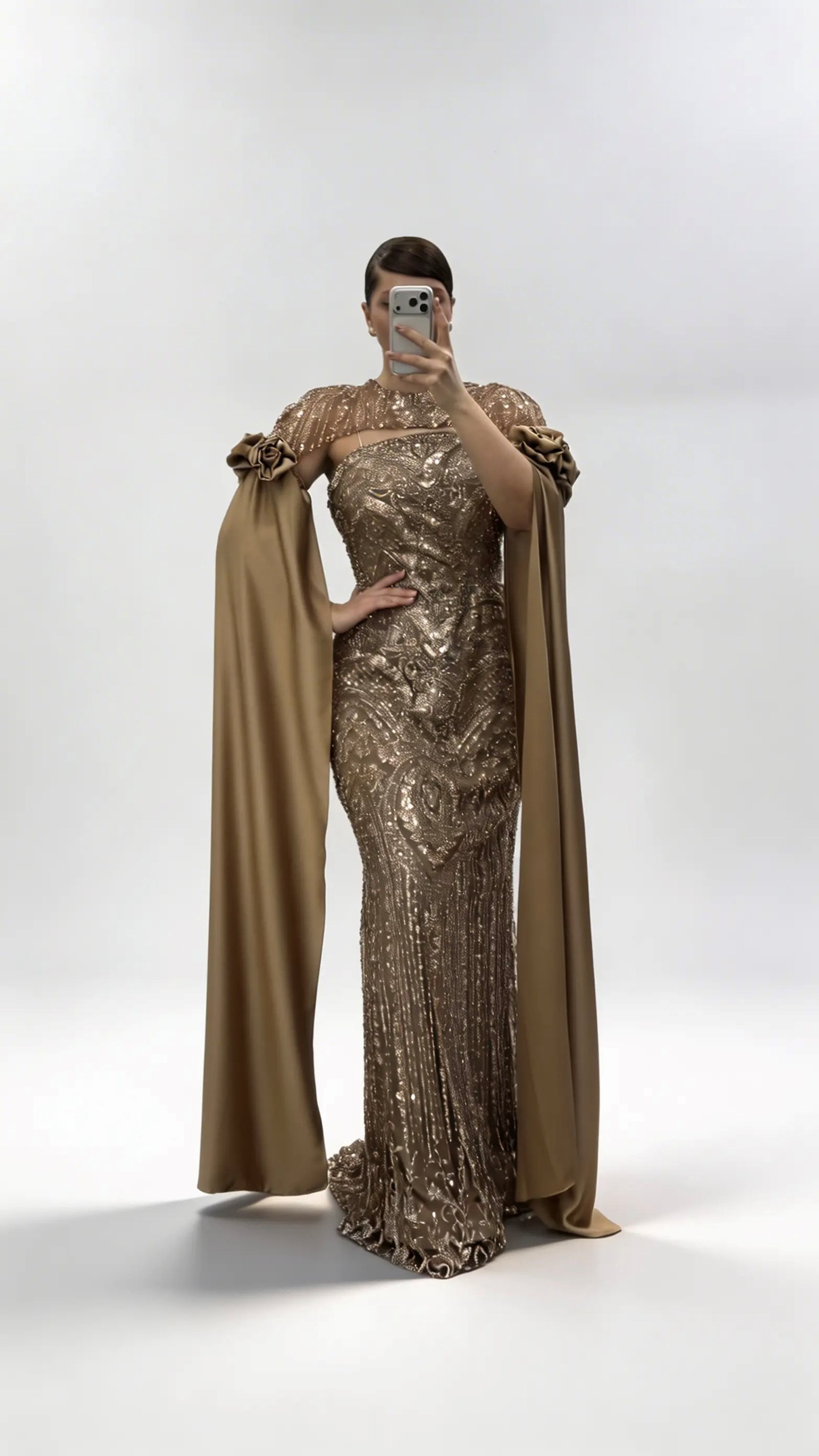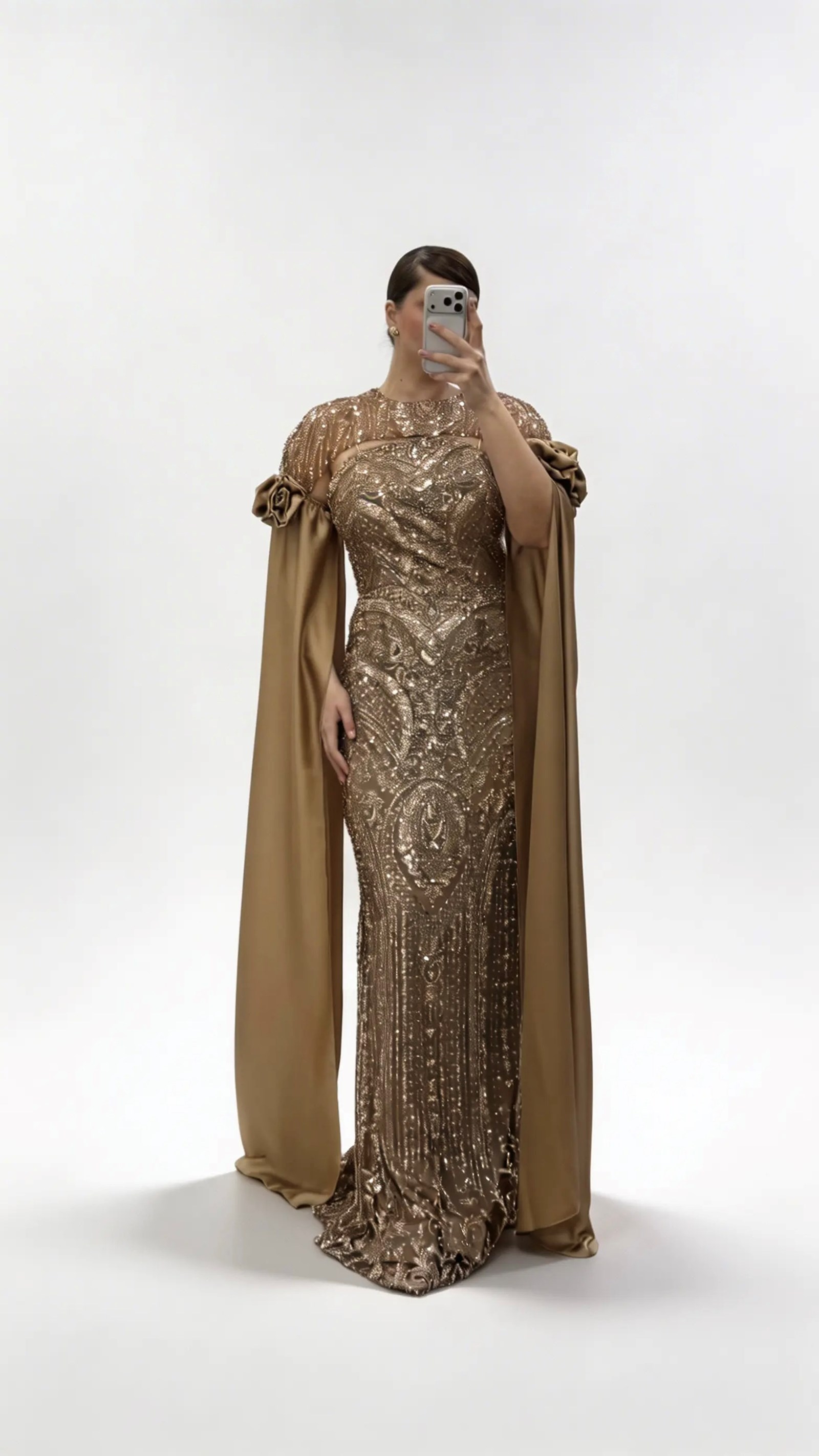 • Gold Çiçek Detaylı Uzun Saten Pelerin Kollu Büyük Beden Abiye Elbise